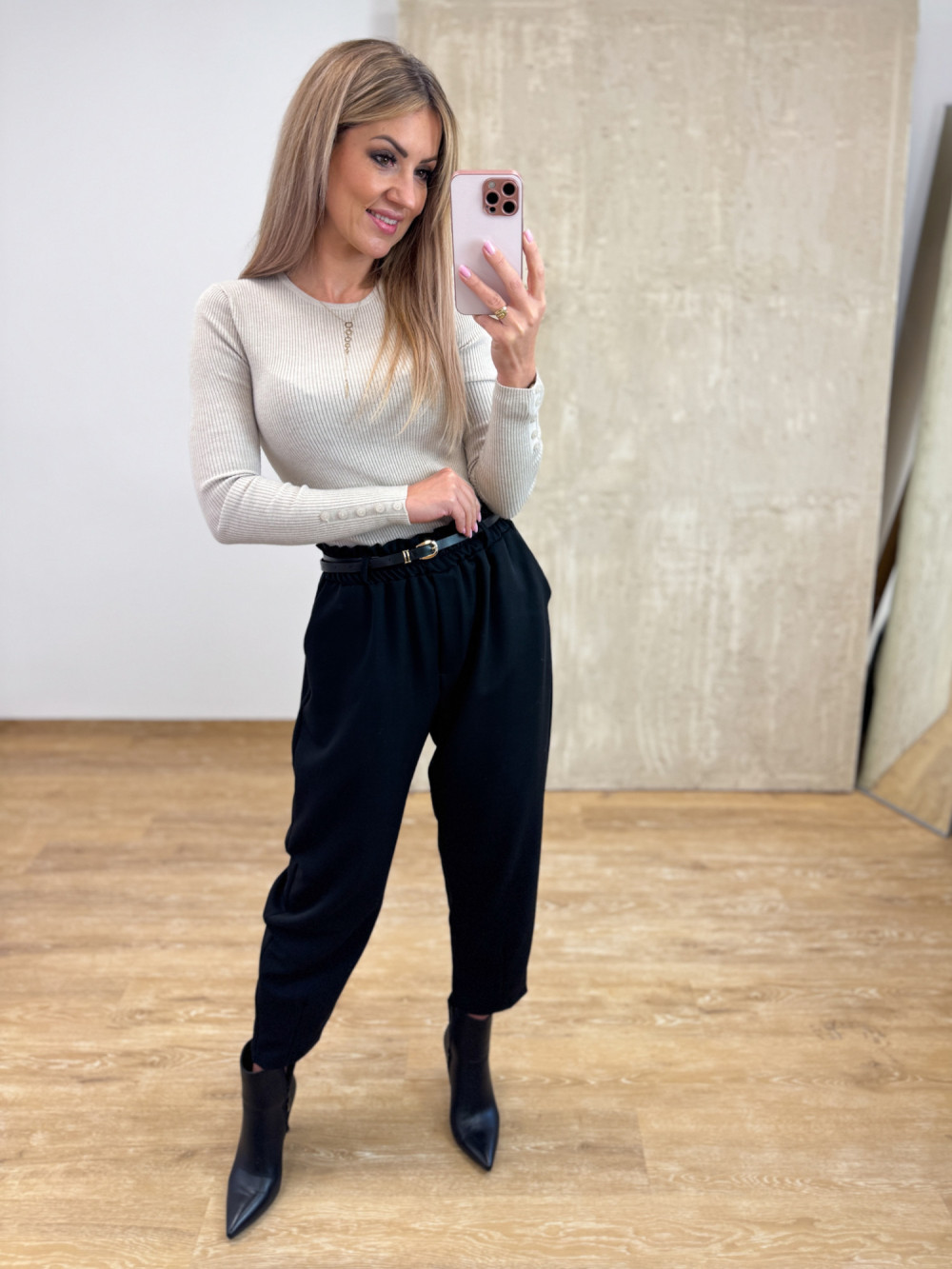 Lekki i wyjątkowo przyjemny w dotyku sweterek z delikatnego prążka, który delikatnie otula sylwetkę. Dzięki dodatkowi wiskozy jest miękki, elastyczny i komfortowy w noszeniu. Fason subtelnie przylega do ciała, podkreślając jego linię, a okrągły dekolt dodaje całości kobiecej elegancji. Idealny zarówno na co dzień, jak i w zestawieniu z bardziej eleganckimi stylizacjami.