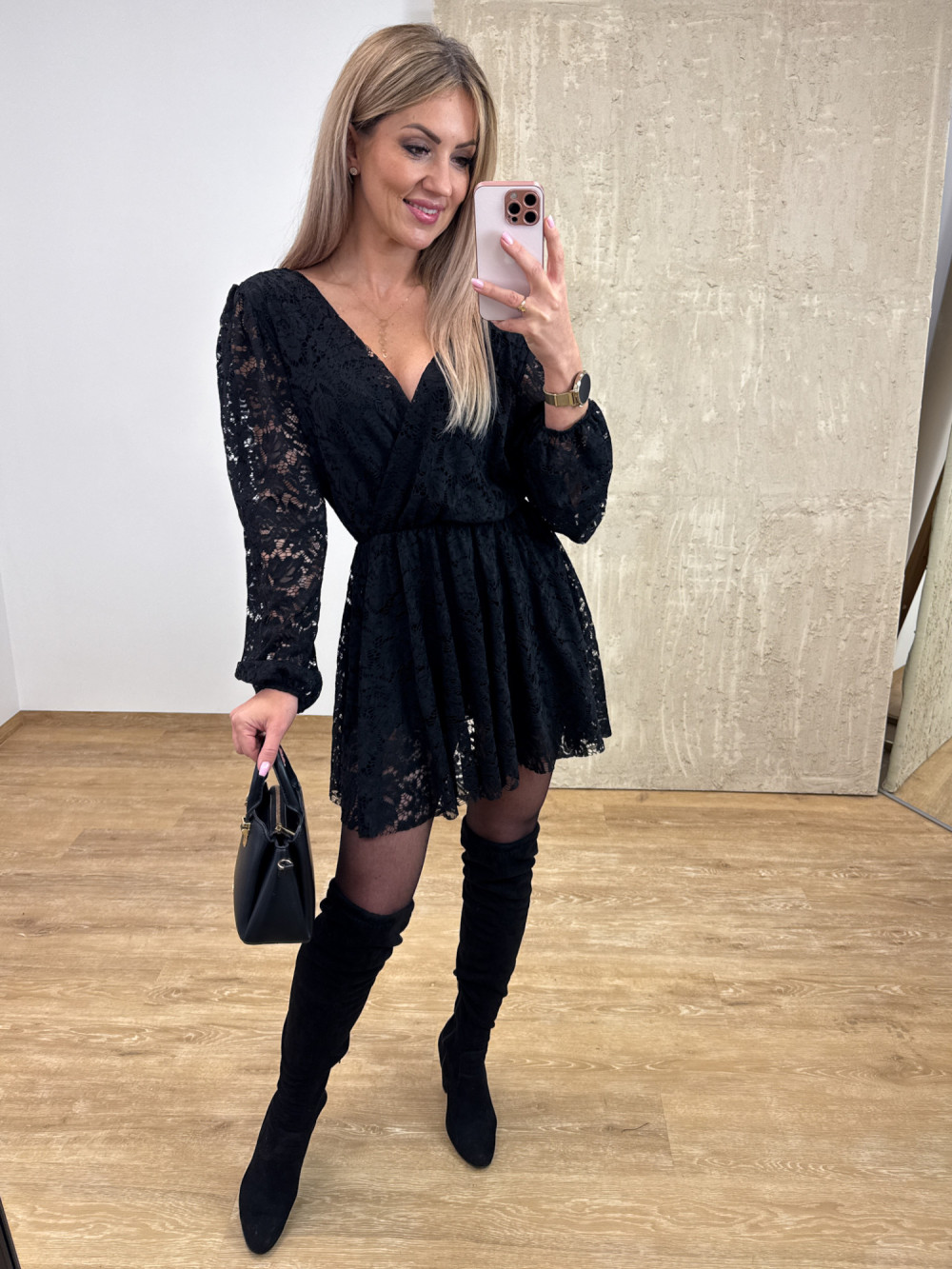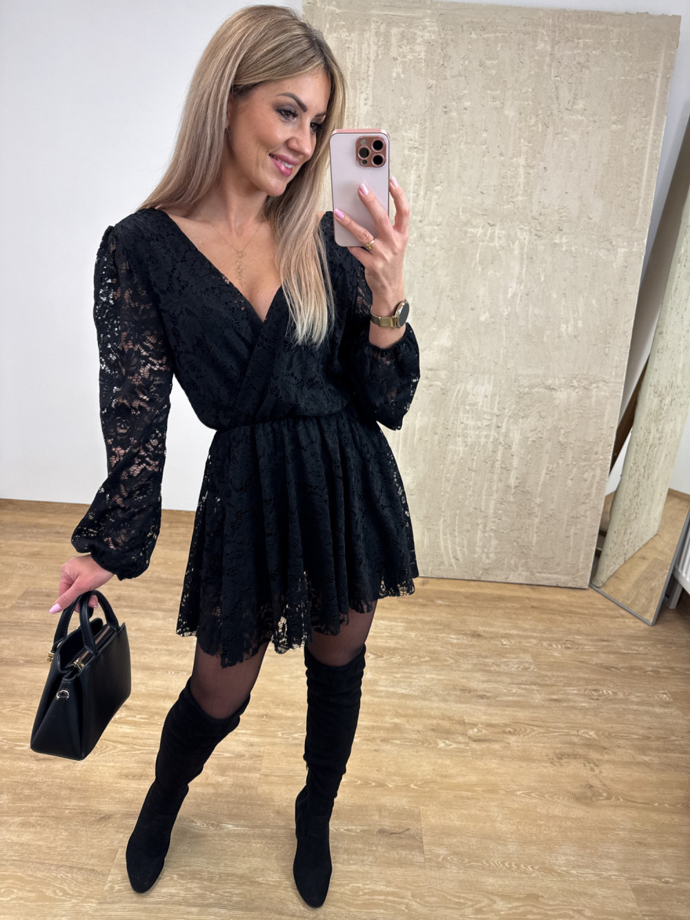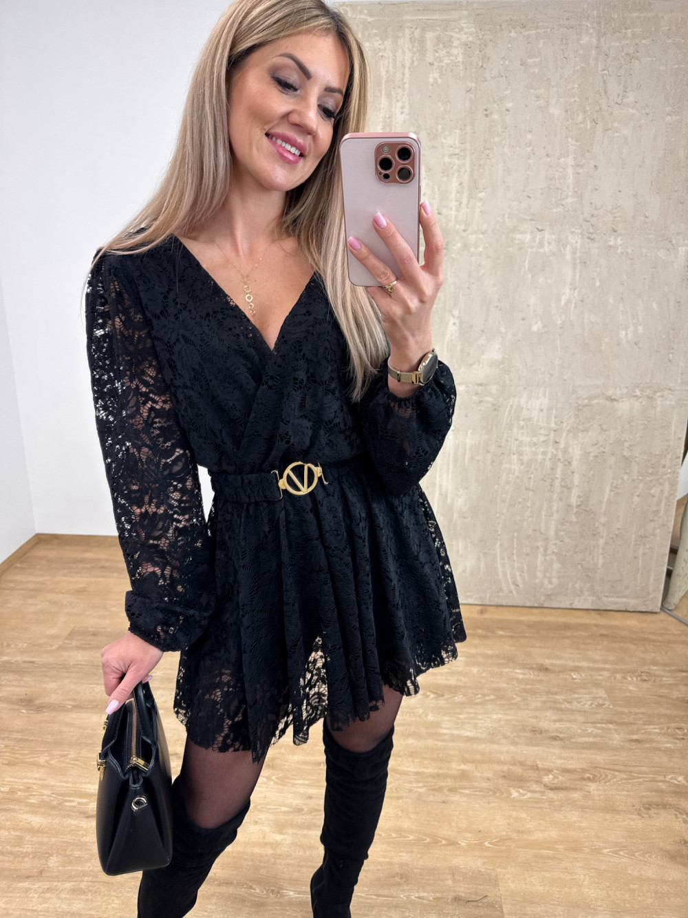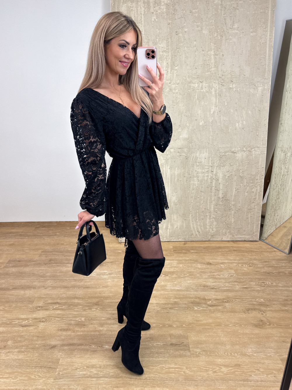 Kombinezon wykonany z czarnej, efektownej koronki o kroju przypominającym sukienkę. Podszewka ma fason klasycznego kombinezonu, co zapewnia wygodę noszenia i komfort ruchu. Zewnętrzna warstwa z koronki nadaje całości kobiecego i eleganckiego charakteru. W pasie wszyta gumka subtelnie podkreśla talię, a kopertowy dekolt w kształcie litery V — zarówno z przodu, jak i z tyłu — pięknie eksponuje sylwetkę. Rękawy są transparentne, dodając lekkości i finezji. W zestawie znajduje się elastyczny pasek z koronki, który można nosić opcjonalnie, by podkreślić talię.