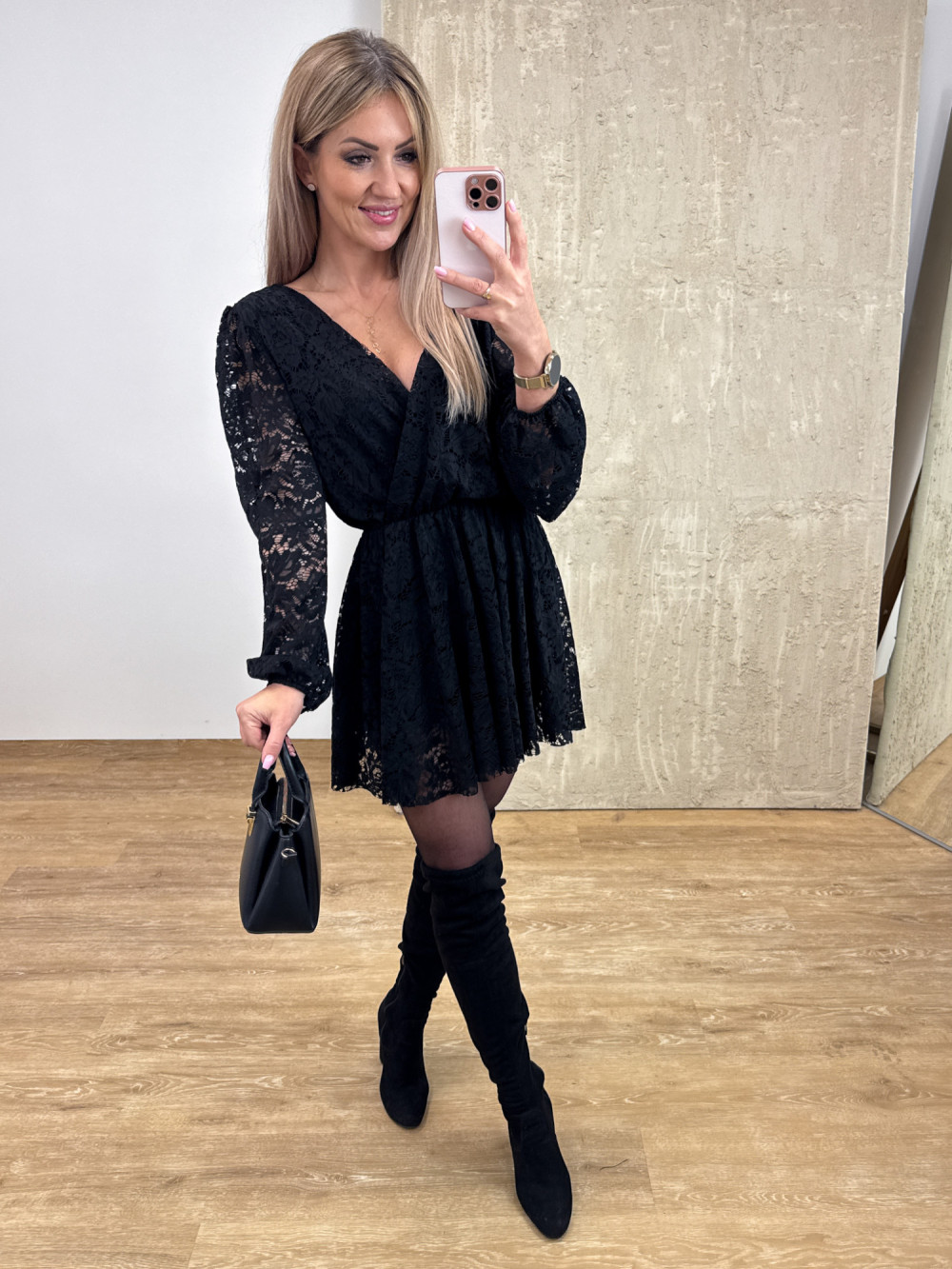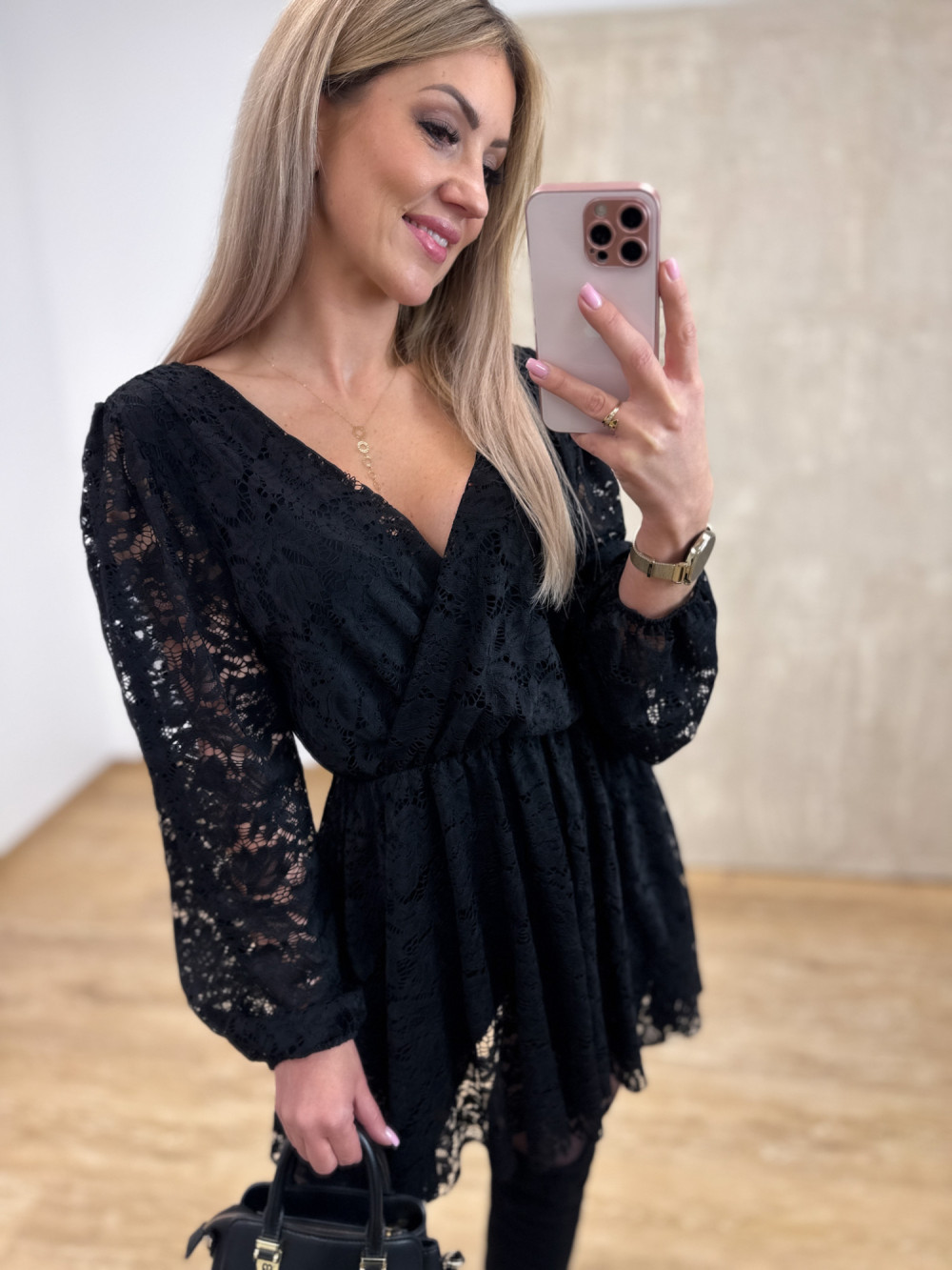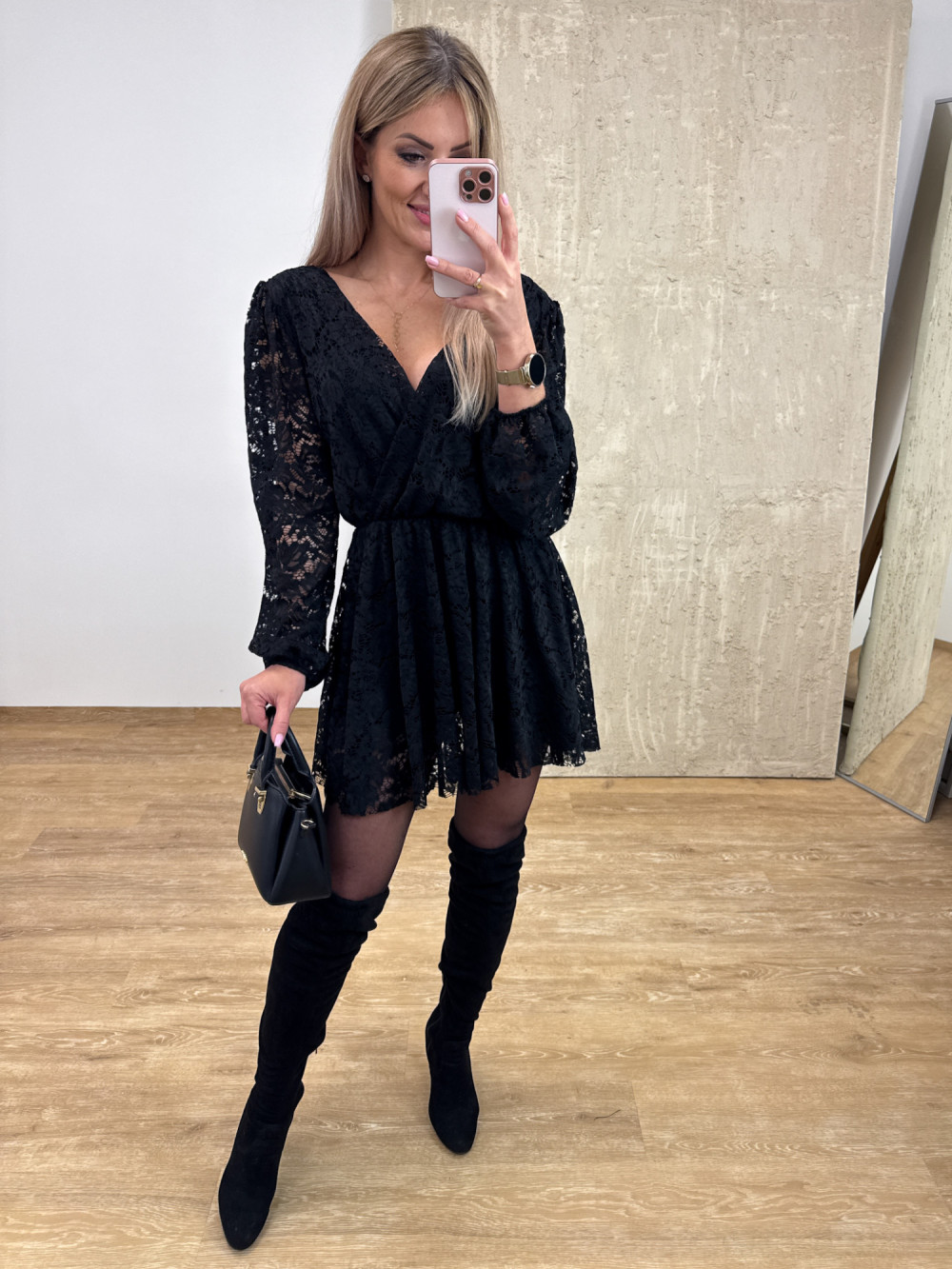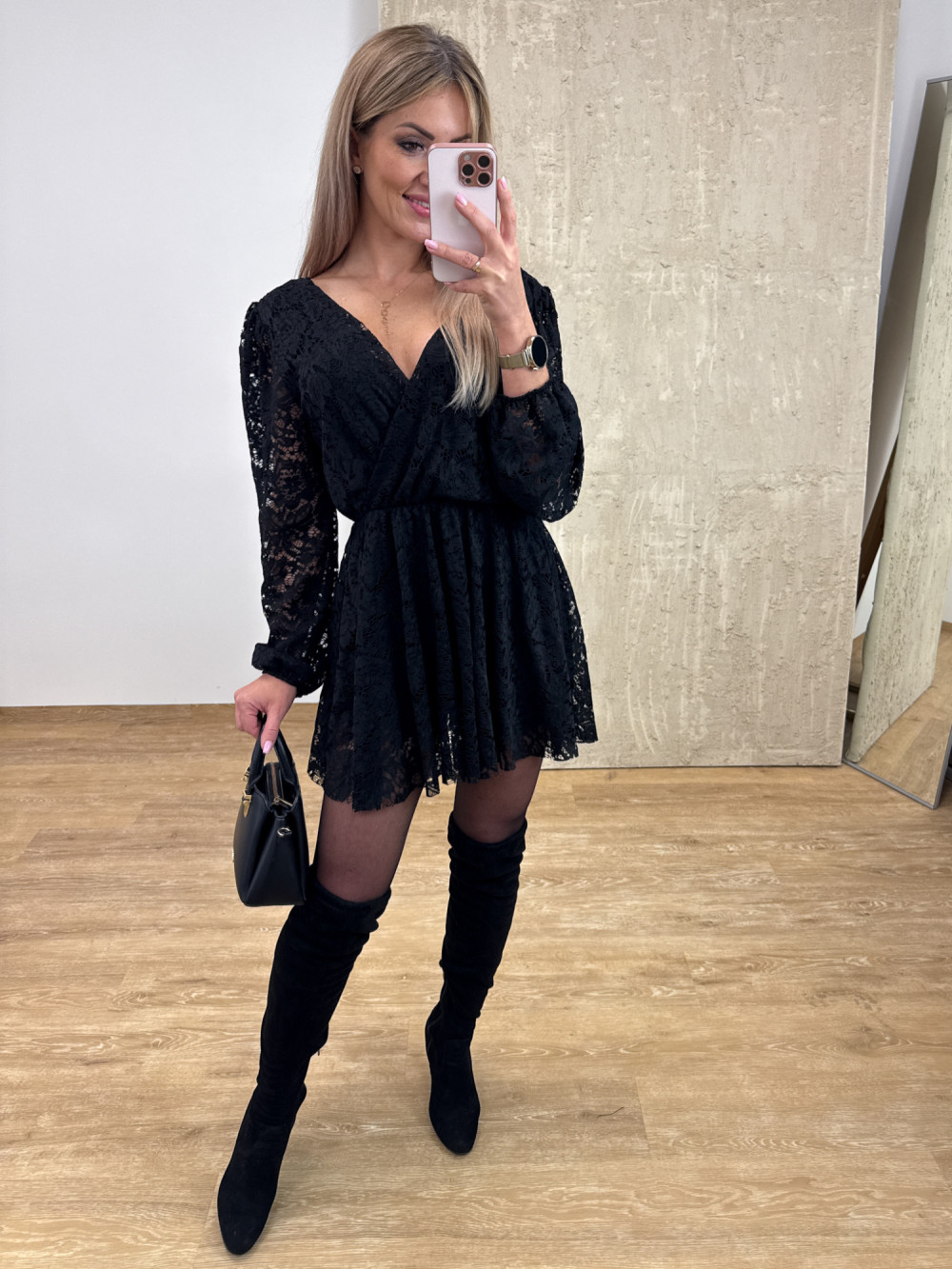 Kombinezon wykonany z czarnej, efektownej koronki o kroju przypominającym sukienkę. Podszewka ma fason klasycznego kombinezonu, co zapewnia wygodę noszenia i komfort ruchu. Zewnętrzna warstwa z koronki nadaje całości kobiecego i eleganckiego charakteru. W pasie wszyta gumka subtelnie podkreśla talię, a kopertowy dekolt w kształcie litery V — zarówno z przodu, jak i z tyłu — pięknie eksponuje sylwetkę. Rękawy są transparentne, dodając lekkości i finezji. W zestawie znajduje się elastyczny pasek z koronki, który można nosić opcjonalnie, by podkreślić talię.