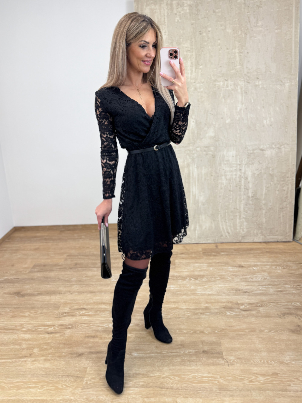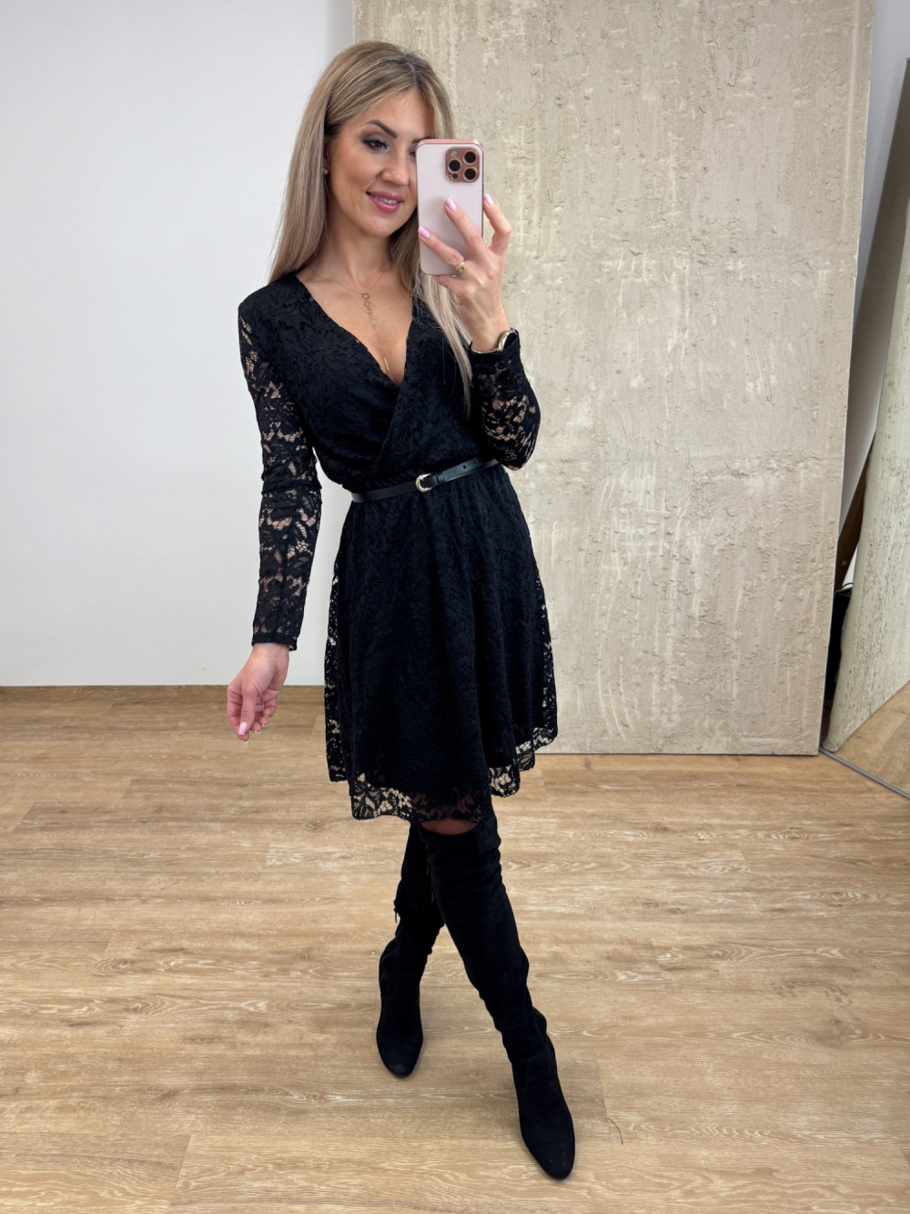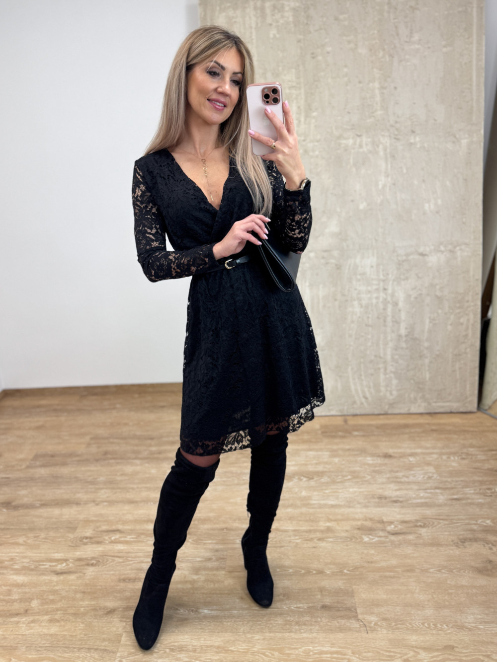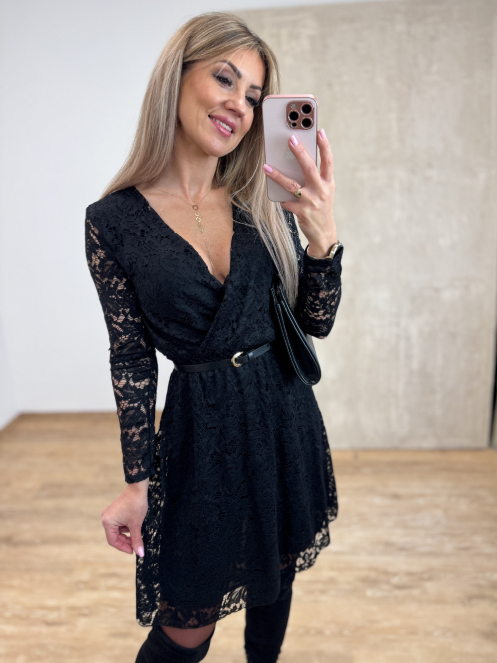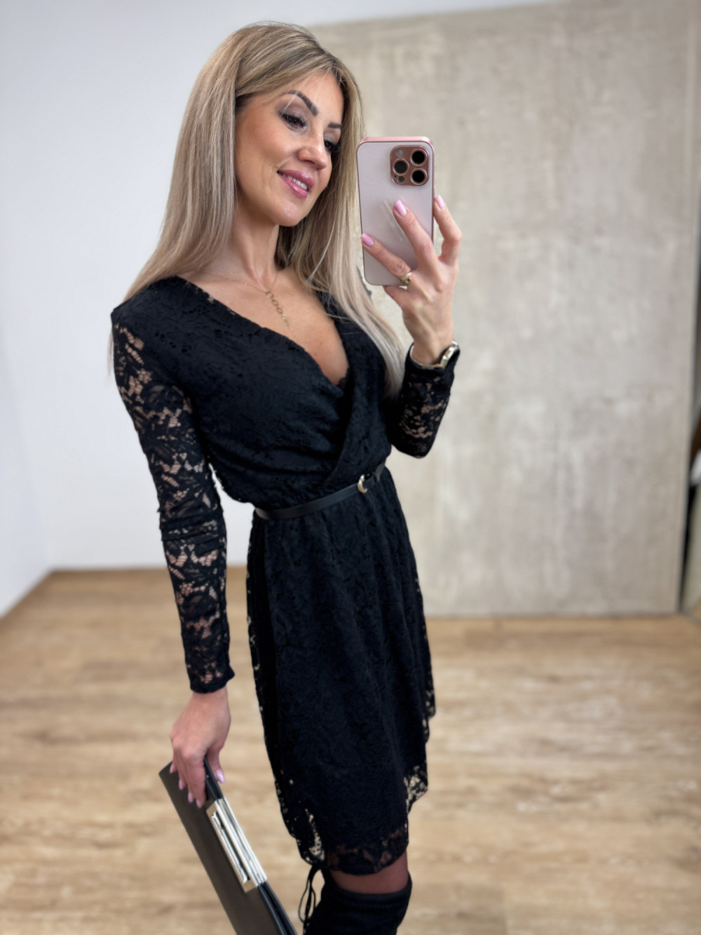 Sukienka z miękkiej, elastycznej koronki o niezwykle kobiecym kroju. Posiada kopertowy dekolt subtelnie podkreślający biust oraz gumkę w talii, która dopasowuje się do sylwetki i zapewnia komfort noszenia. Transparentne, lekko dopasowane rękawy dodają lekkości i romantycznego charakteru. Długość sięgająca kolan sprawia, że model jest idealny zarówno na wyjątkowe okazje, jak i eleganckie spotkania.