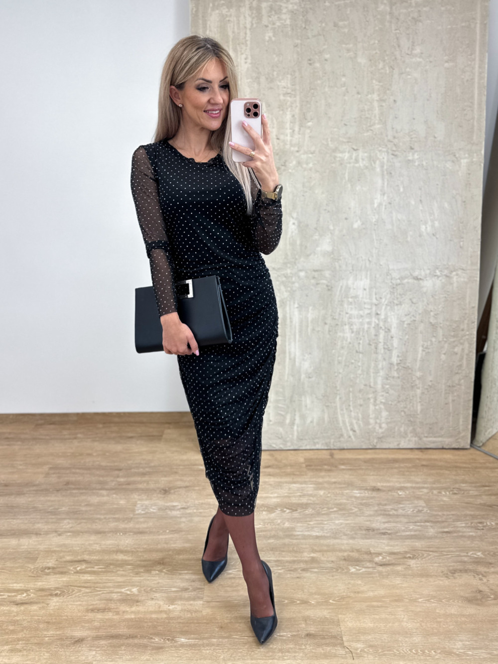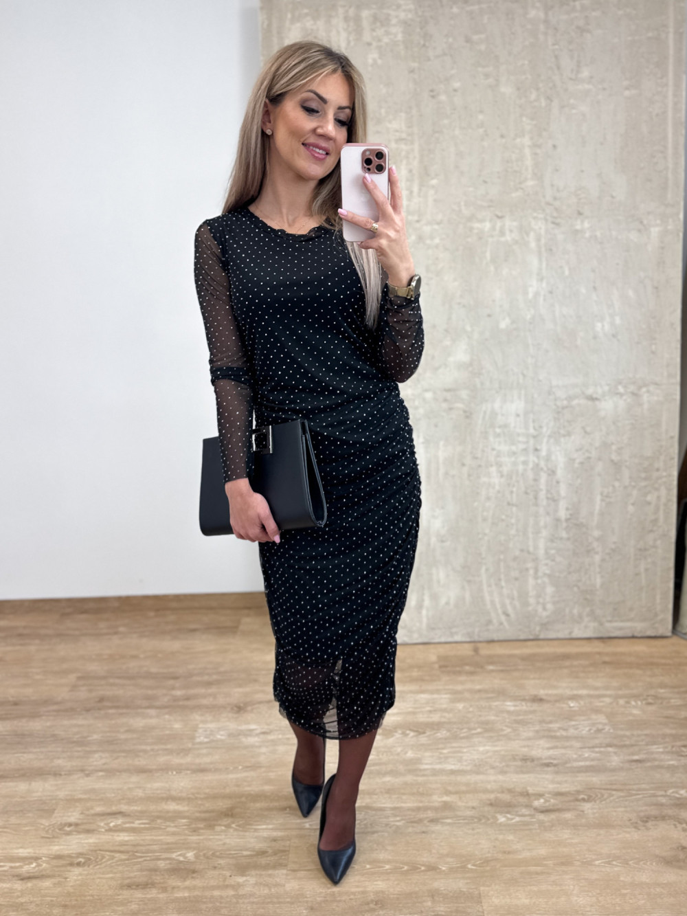 Sukienka uszyta z transparentnej, czarnej siateczki pokrytej drobnymi, srebrnymi jetami, które pięknie odbijają światło i nadają całości eleganckiego blasku. Długość midi z krótszą podszewką subtelnie eksponuje nogi. Bocznie wszyte delikatne gumki tworzą efektowne drapowanie, które podkreśla figurę i maskuje drobne niedoskonałości. Transparentne rękawy dodają lekkości i zmysłowego charakteru.
