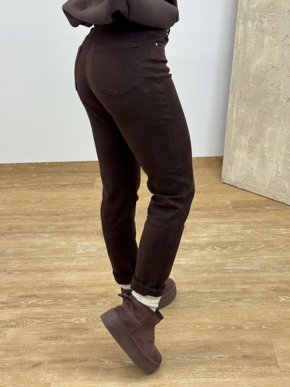Stylowe jeansy w kroju mom fit w ciemnym czekoladowym kolorze.