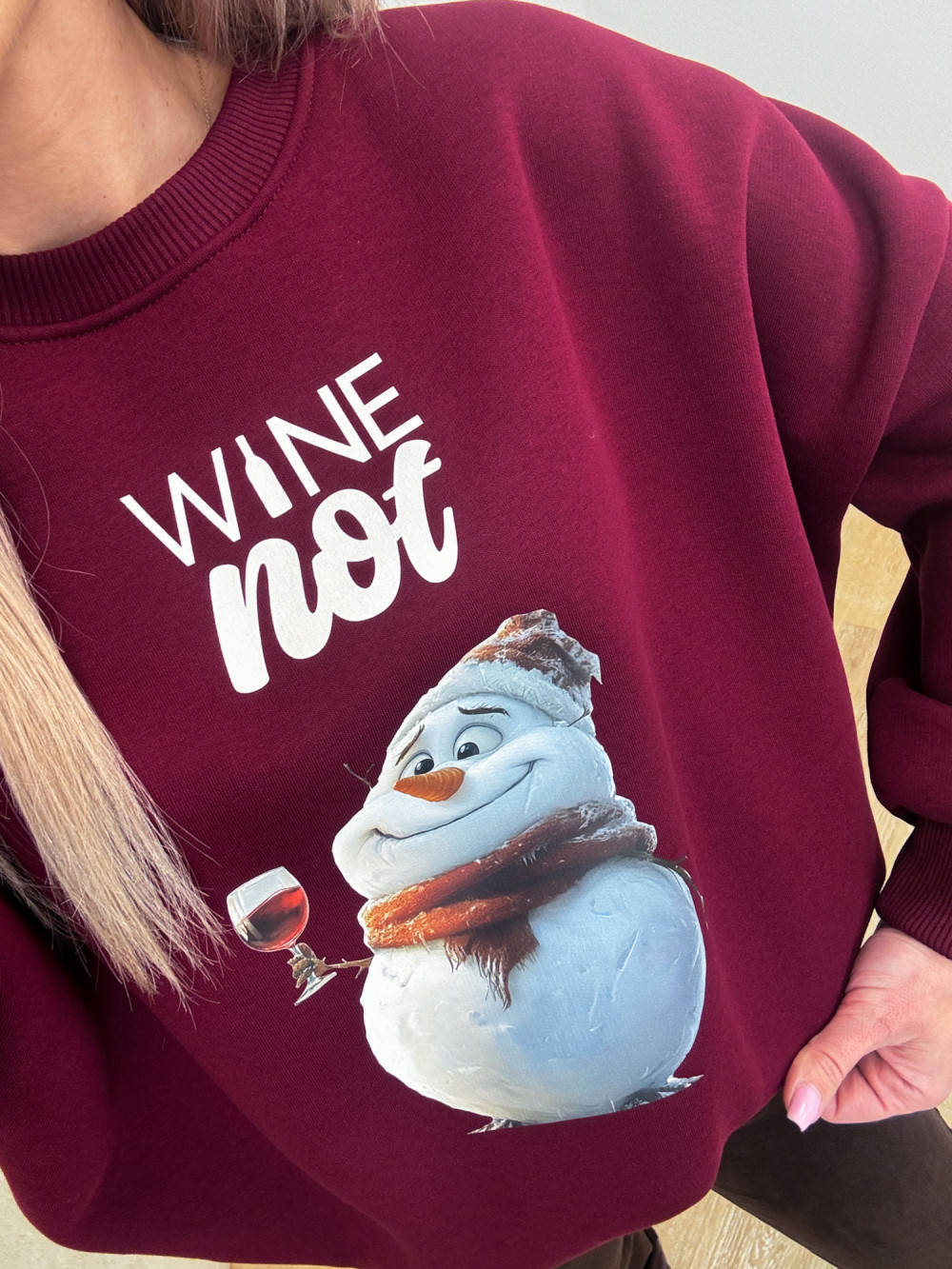 Oversizowa bluza wykonana z ciepłej, bawełny premium z delikatnym, miękkim „misiem” od wewnątrz. Polska produkcja, gwarantująca wysoką jakość i wygodę. Na przodzie znajduje się wesoły nadruk z bałwankiem trzymającym lampkę wina oraz humorystyczny napis “Wine Not”. Idealna propozycja na chłodniejsze dni – łączy komfort, styl i poczucie humoru.