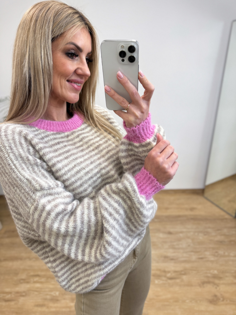 Oversizowy sweter w paski, który łączy komfort z subtelną, dziewczęcą estetyką. Waniliowa baza przełamana beżowymi paskami tworzy ciepłą, harmonijną całość, a delikatne różowe wykończenia dodają mu wyjątkowego charakteru.