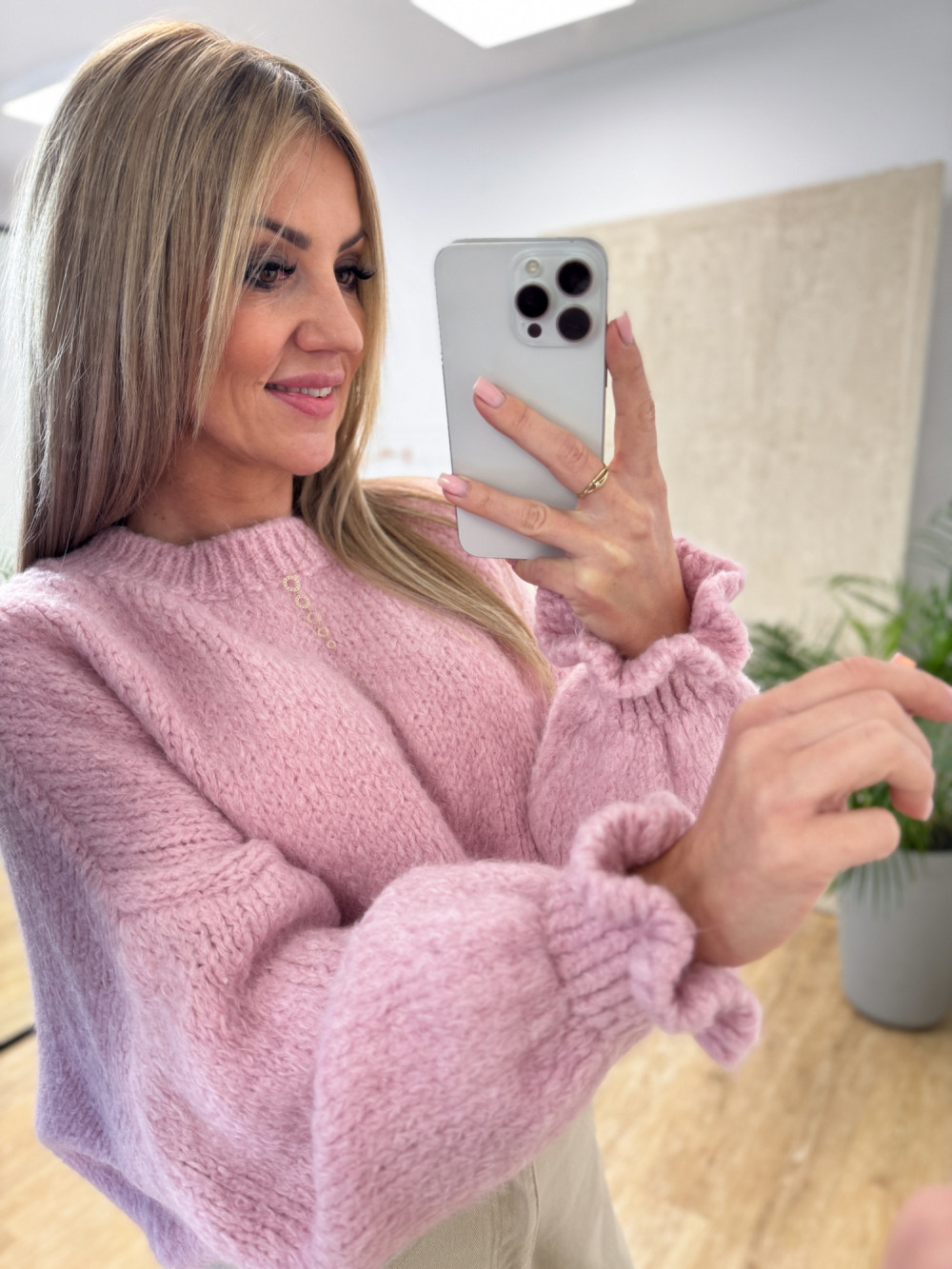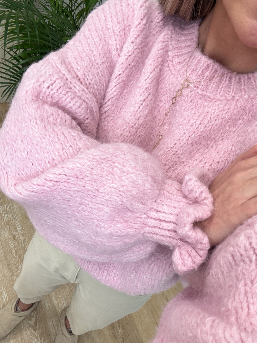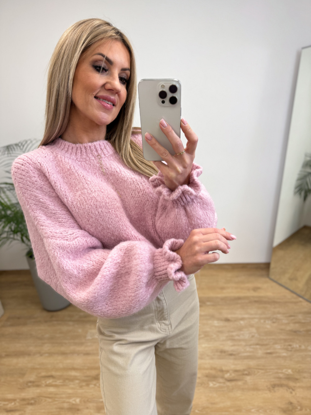 Niezwykle miękki i przyjemny w dotyku sweter, który zachwyca subtelnymi detalami. Dzięki ściągaczowi na rękawie zakończonemu falbanką tworzy się delikatna bufka, dodająca całości kobiecego charakteru.
