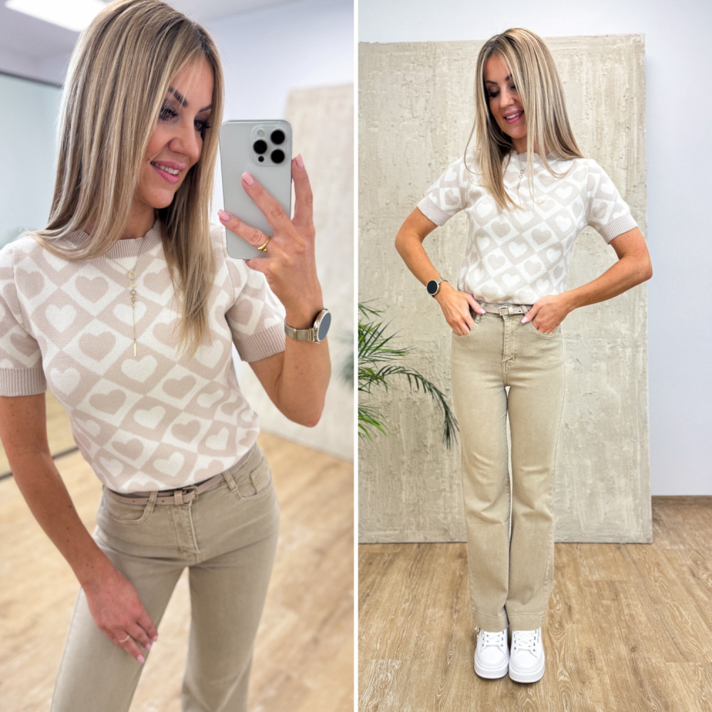 Sweterek z Krótkim Rękawem w Serca - Waniliowo Beżowy