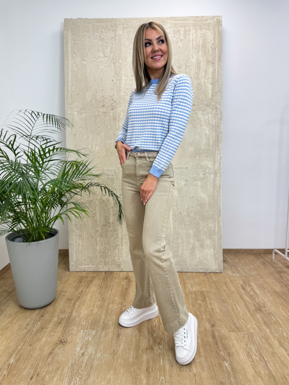 Delikatny, lekki sweterek wykonany z elastycznej wiskozy, który pięknie dopasowuje się do sylwetki, podkreślając kobiece linie. Model wyróżnia się subtelnym wzorem fal, łączącym dwa harmonijne kolory: wanilię i błękit, co nadaje mu eleganckiego, ponadczasowego charakteru.