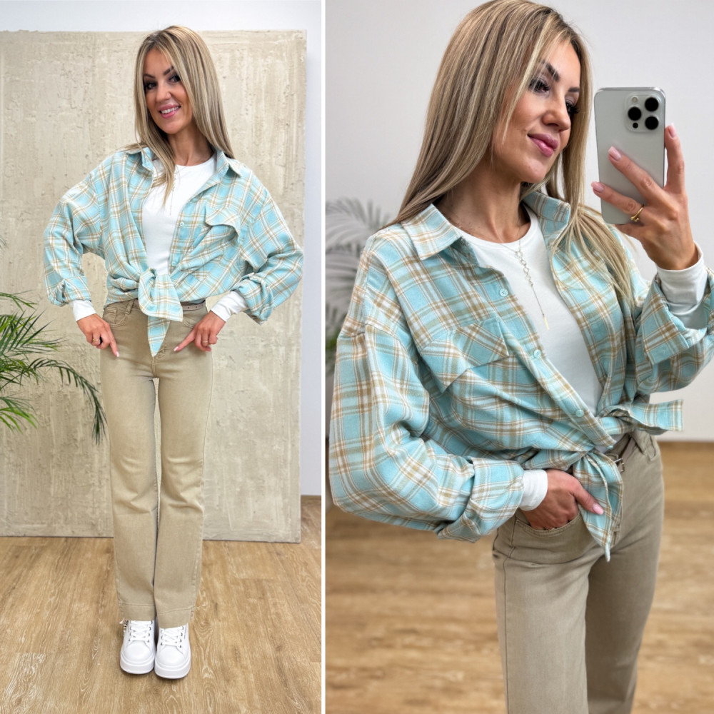Koszula Flanelowa w Kratę Joy - Miętowo Beżowa