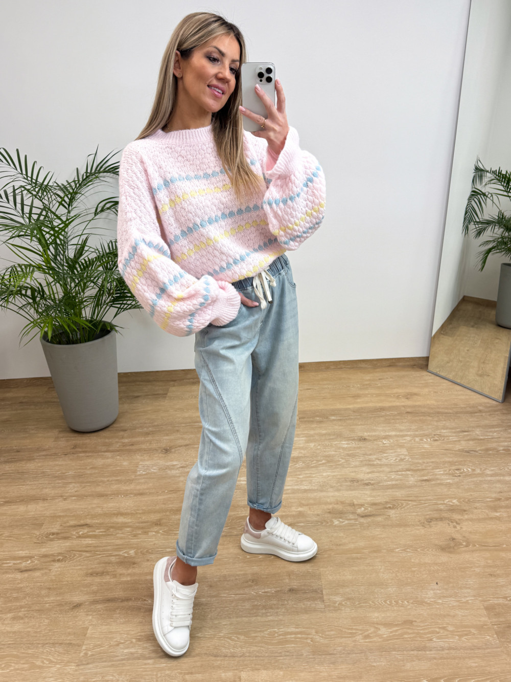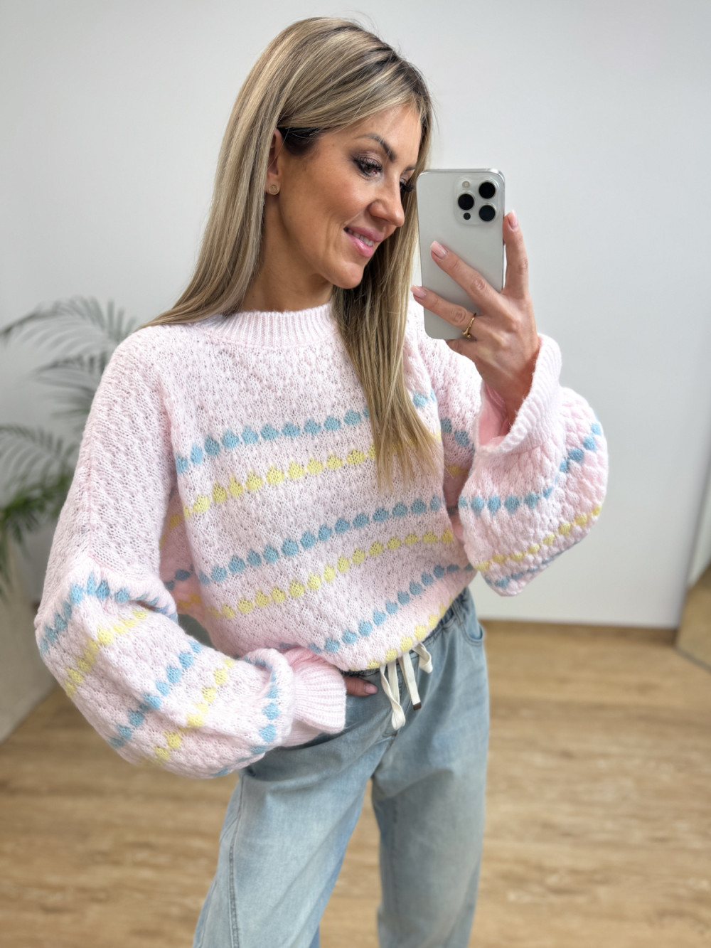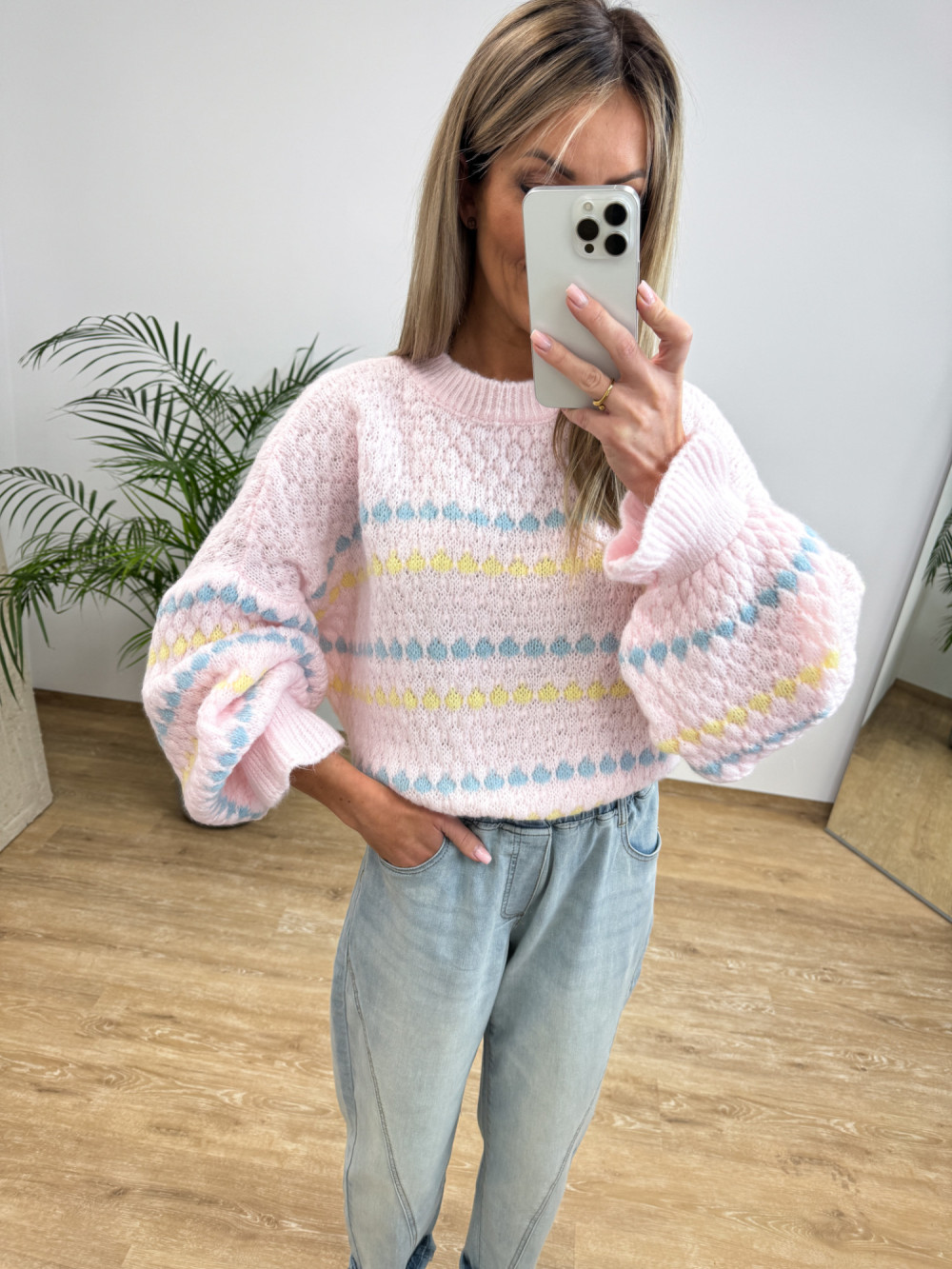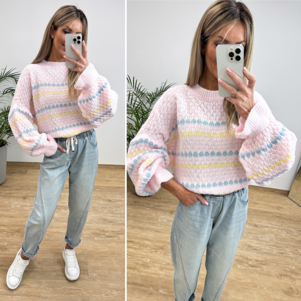 Sweter z Strukturą Bąbelków Bufiasty Rękaw Noton - Pudrowy