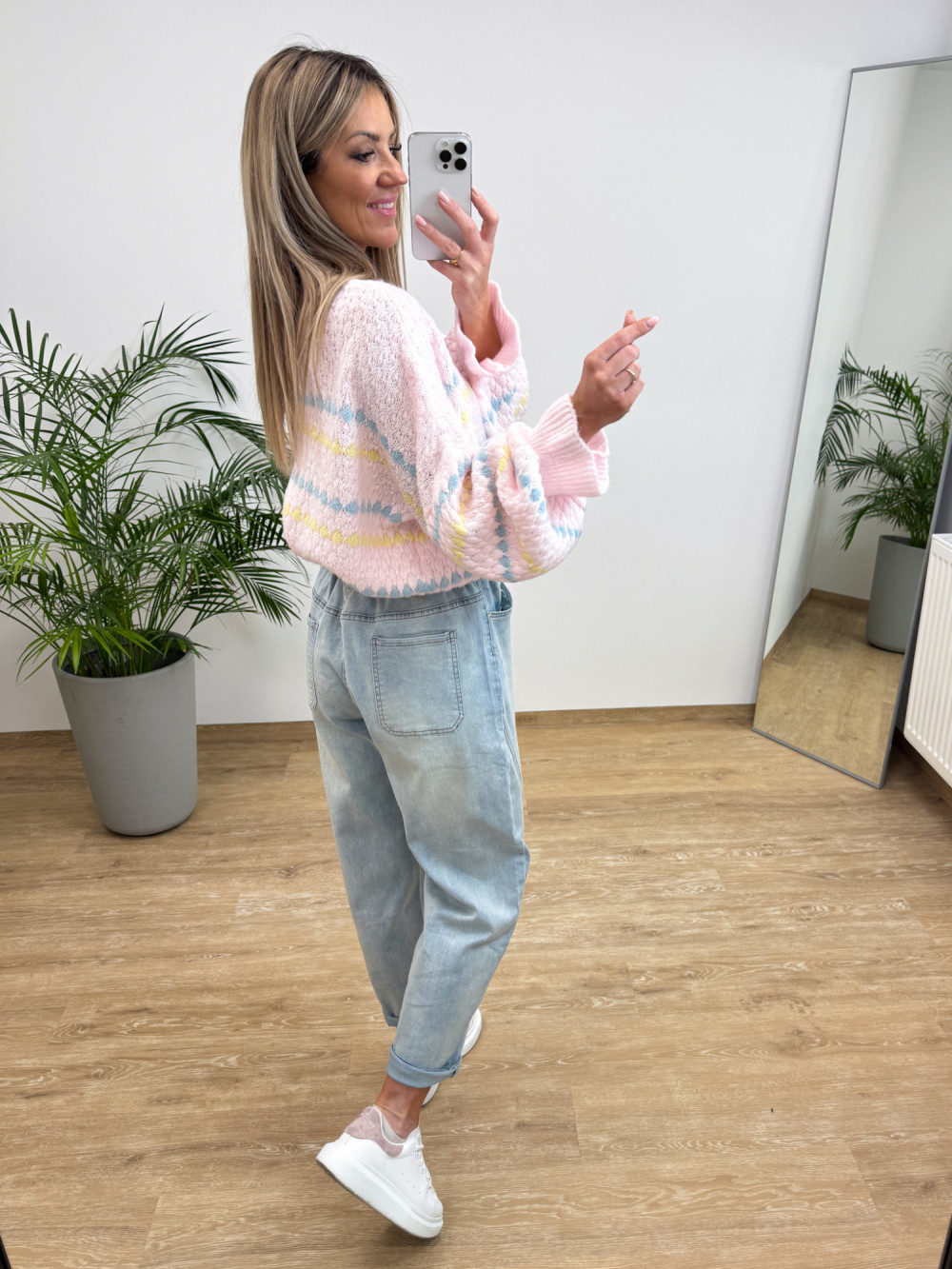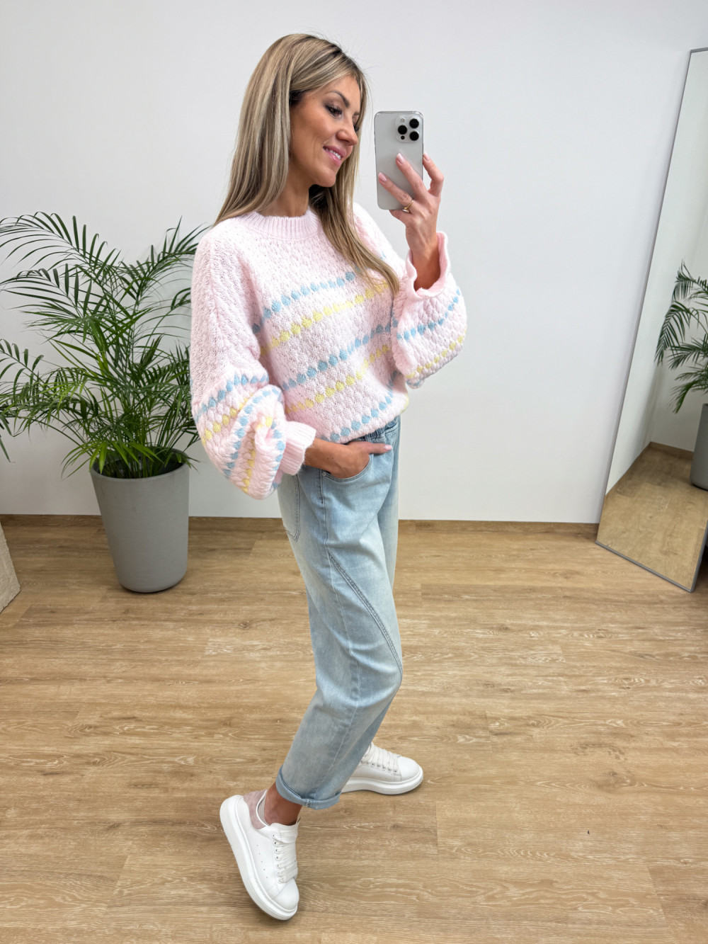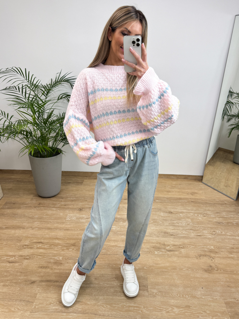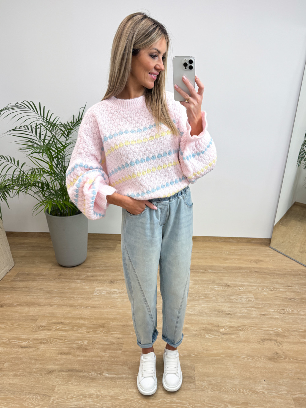 Sweter z Strukturą Bąbelków Bufiasty Rękaw Noton - Pudrowy