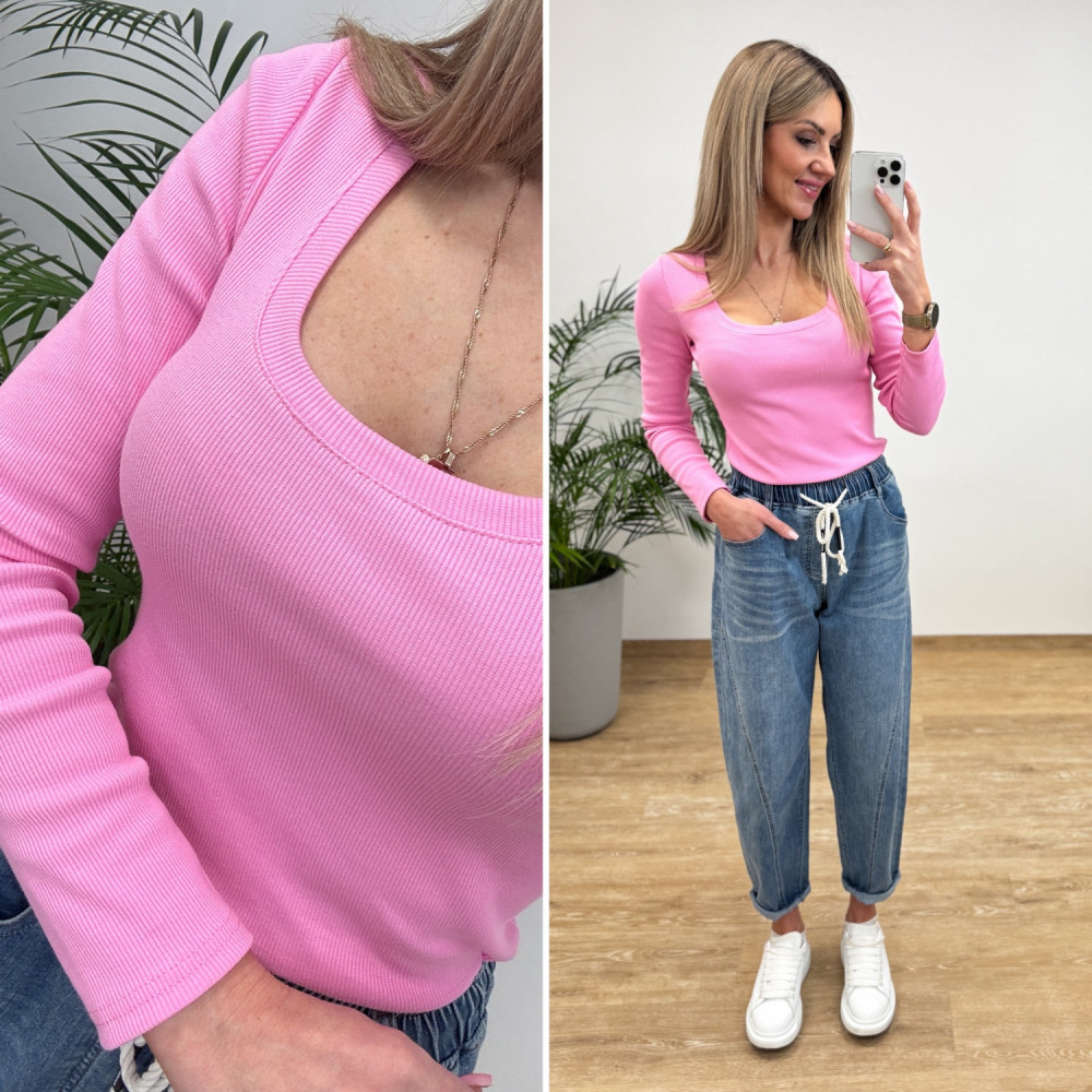 Bluzka Basic Bawełniana Prążkowana z Dekoltem Ana - Różowa