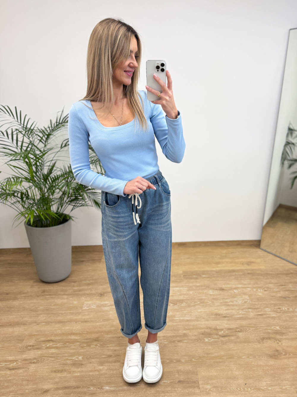 Bluzka Basic Bawełniana Prążkowana z Dekoltem Ana - Niebieska
