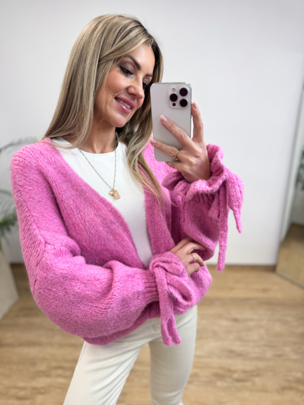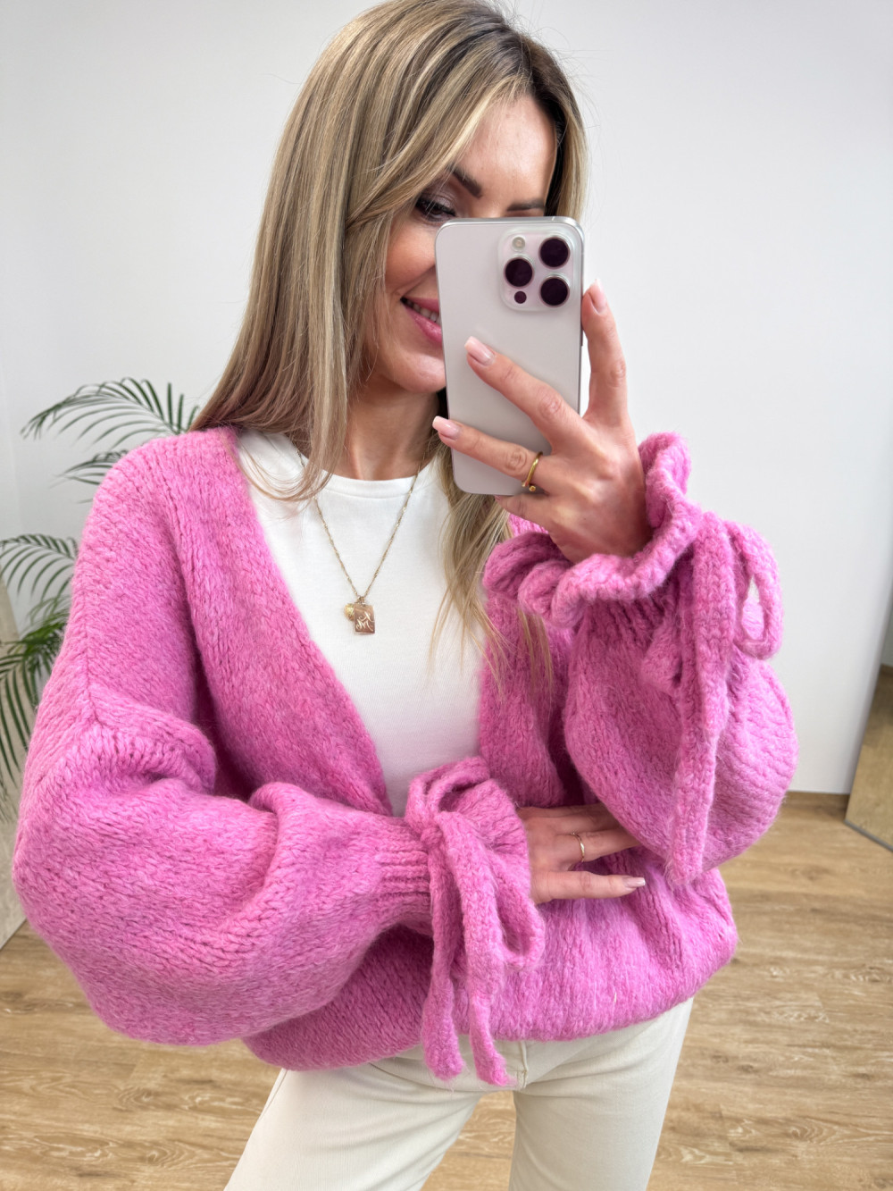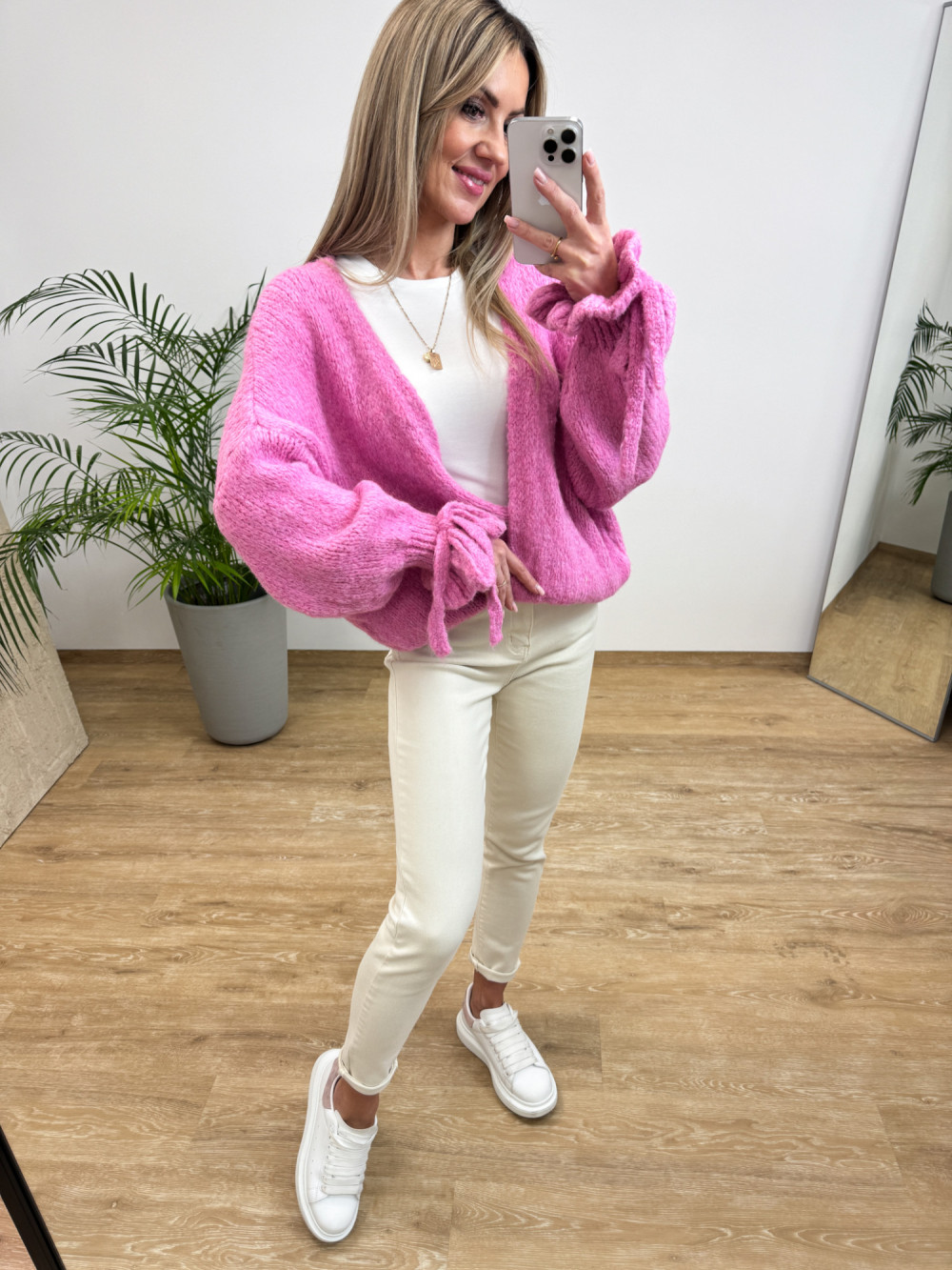Sweter Kardigan Oversizowy z Falbanką na Rękawie Amir - Różowy