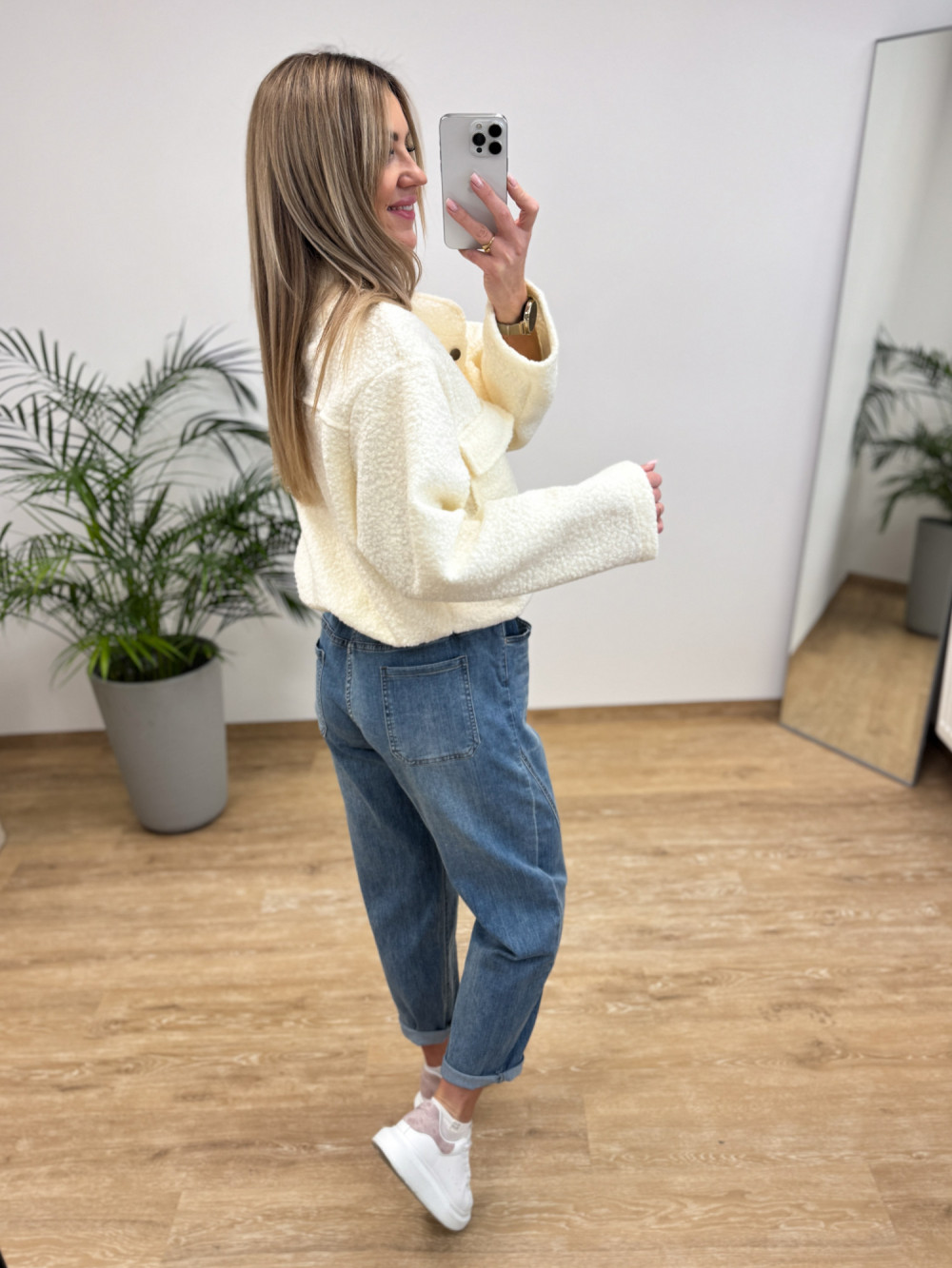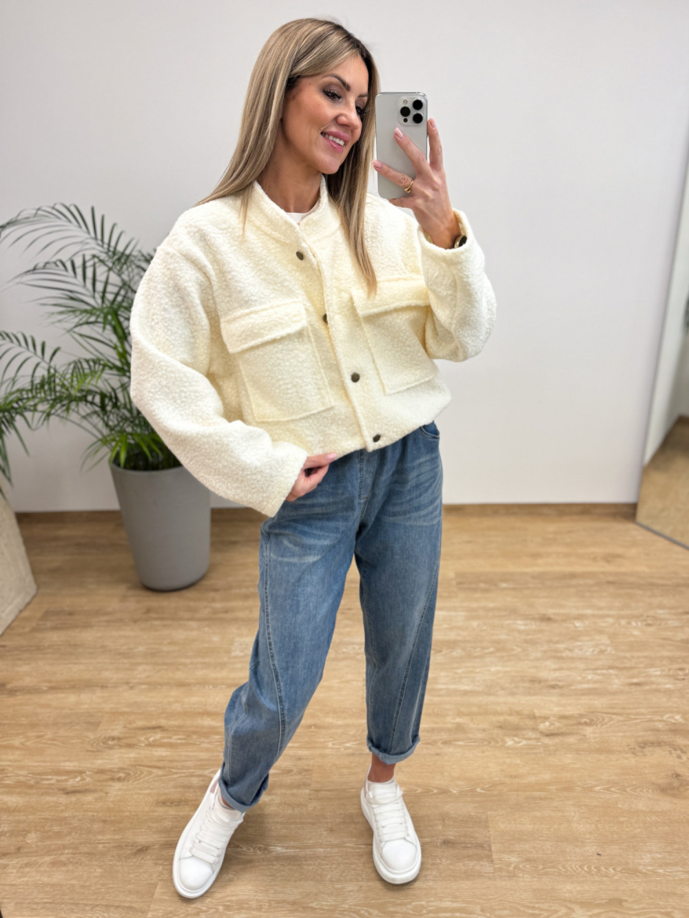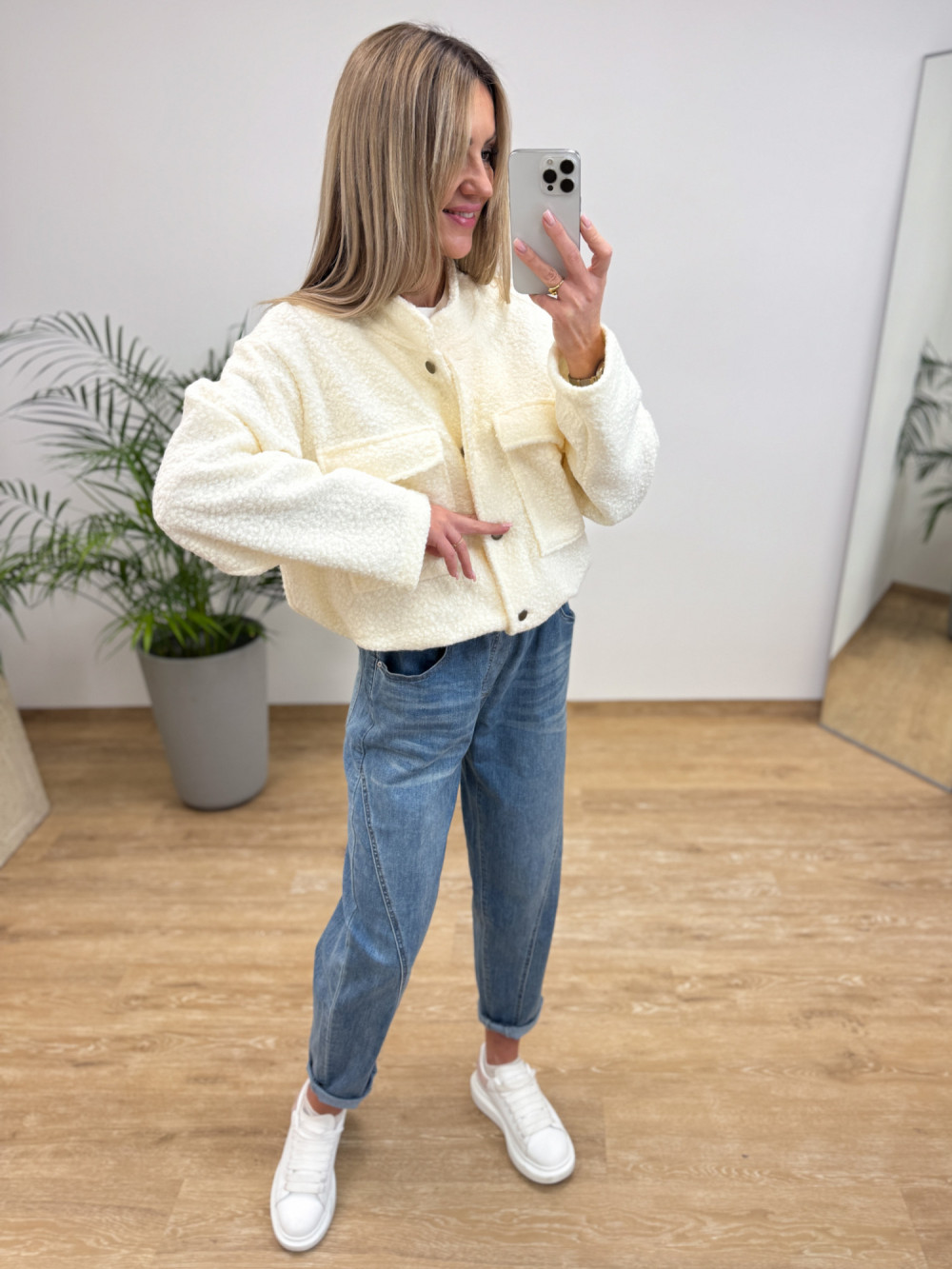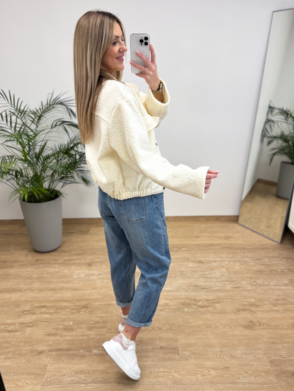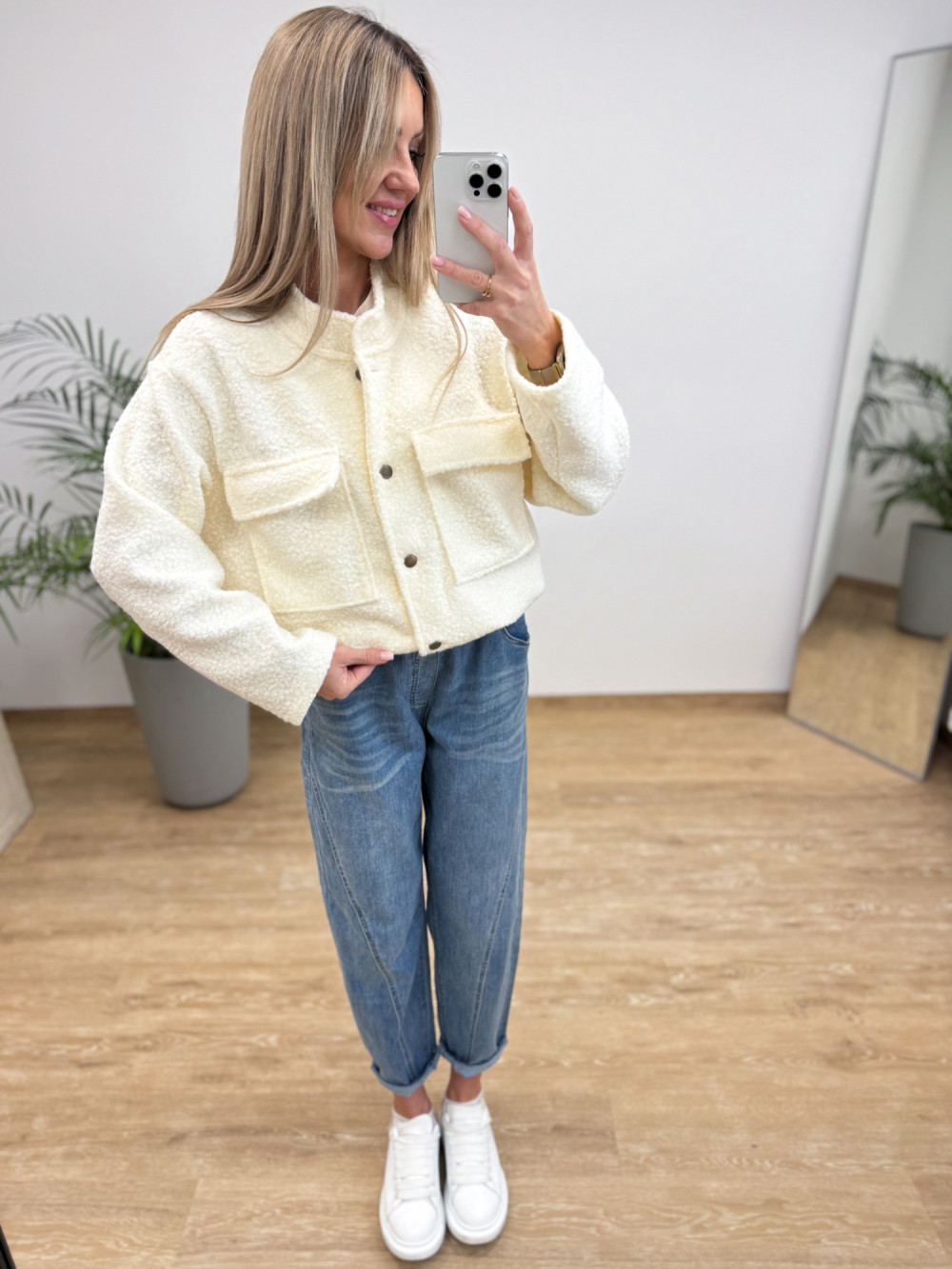 Stylowa kurtka w kroju bomberki, uszyta z miękkiej i przyjemnej w dotyku bukli. Model posiada wszytą gumkę u dołu, która pozwala na efektowne „zbluzowanie” kurtki i dopasowanie do sylwetki.