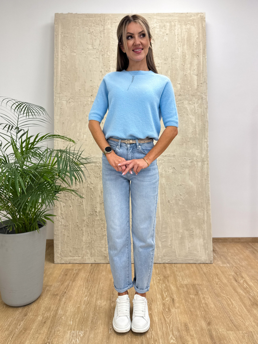 Delikatny, jednokolorowy sweter wykonany z wysokiej jakości przędzy z dodatkiem baby alpaki. Miękki, lekki i przyjemny dla skóry.