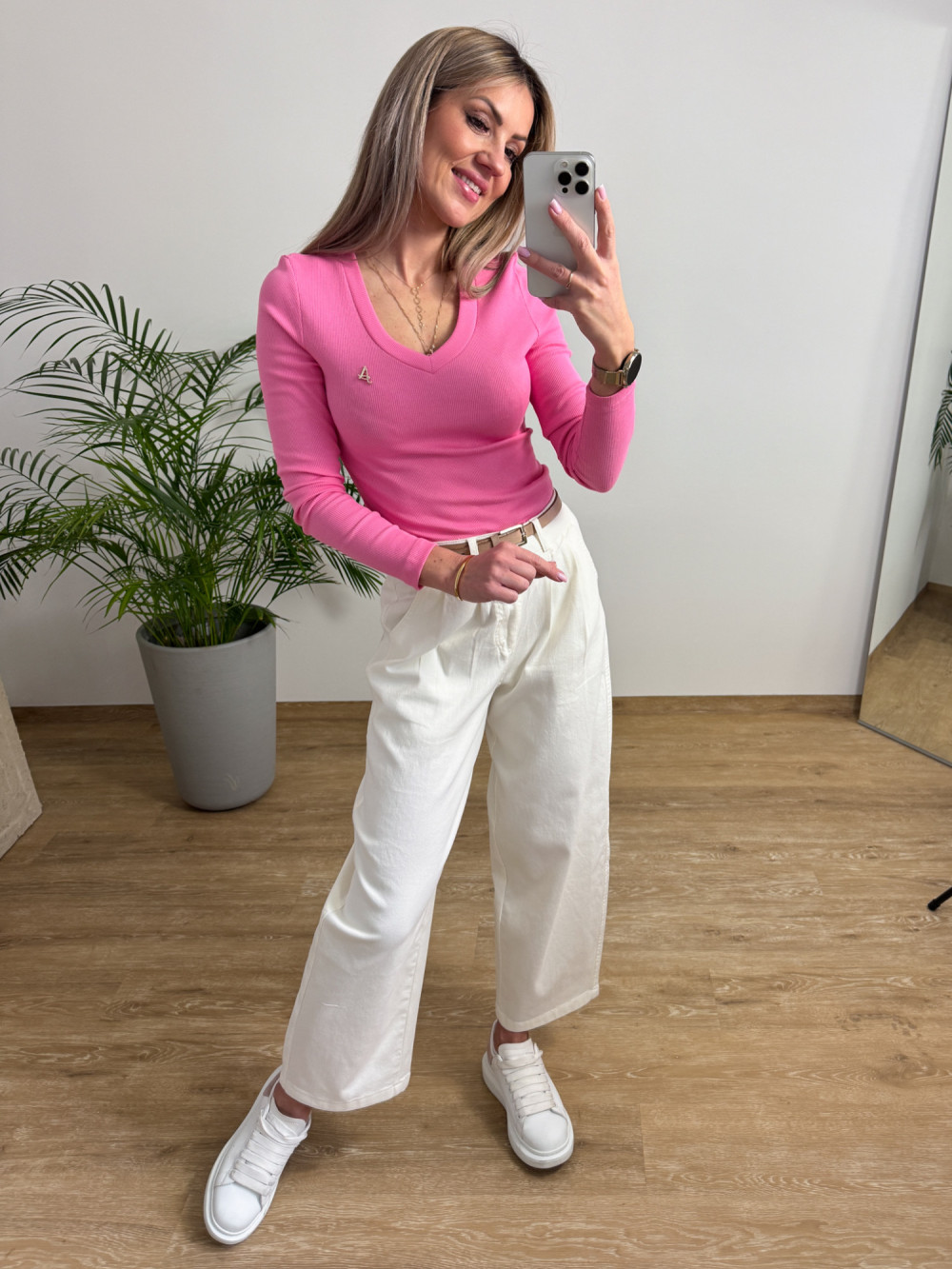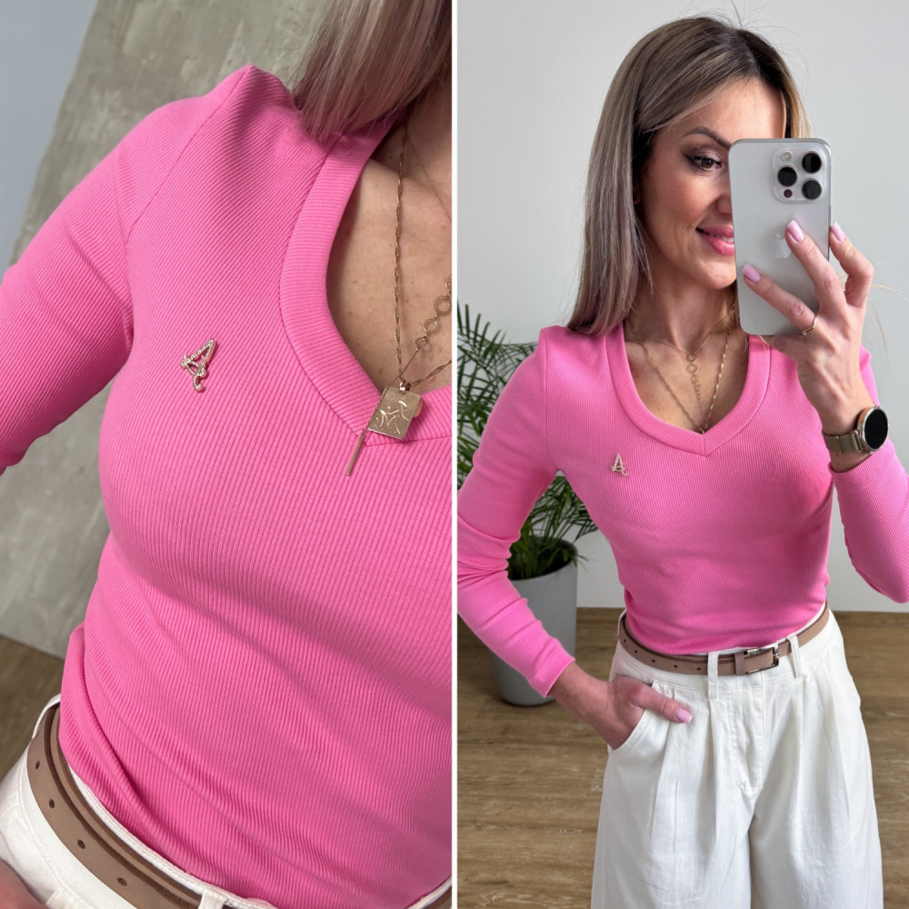 Dekolt w kształcie litery V subtelnie eksponuje szyję i dekolt, a delikatna broszka w formie złotej literki A z diamencikami, umieszczona z przodu na boku, stanowi elegancki, biżuteryjny akcent. To detal, który nadaje całości wyjątkowego charakteru i wyróżnia bluzkę na tle klasycznych modeli.