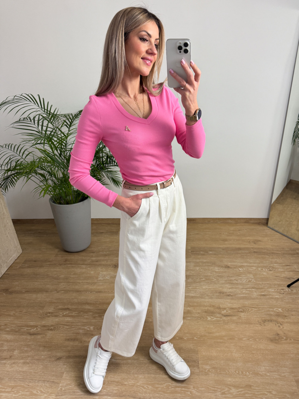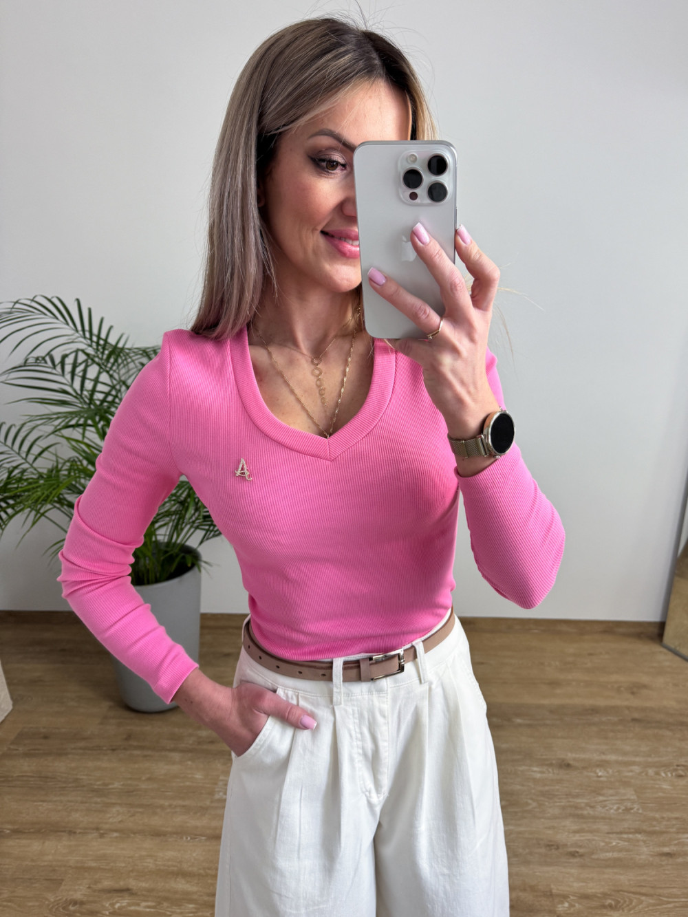 Bluzka Bawełniana Prążkowana z Dekoltem V Aura - Różowa