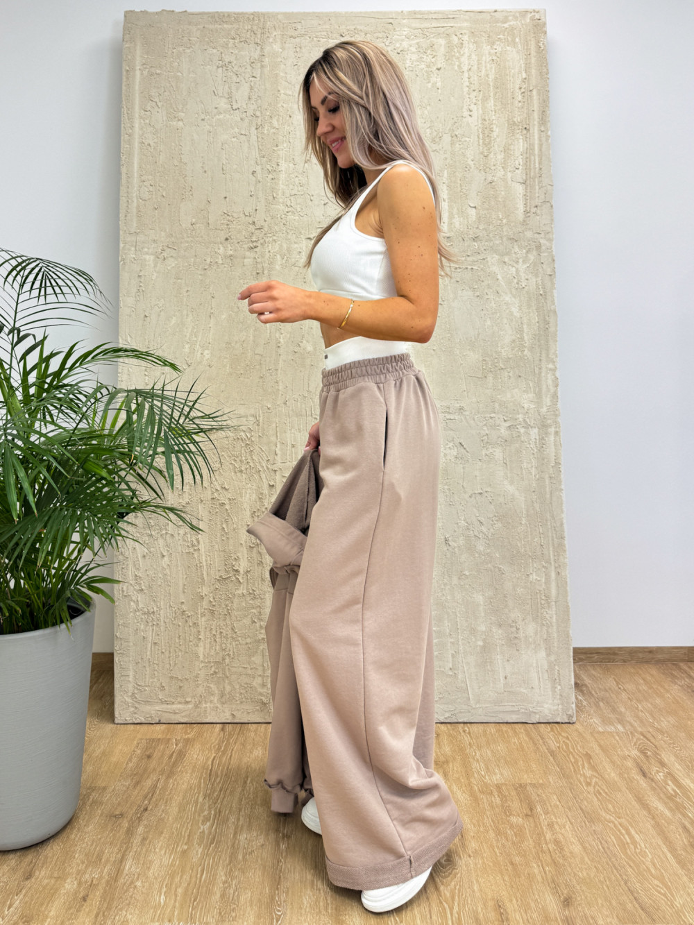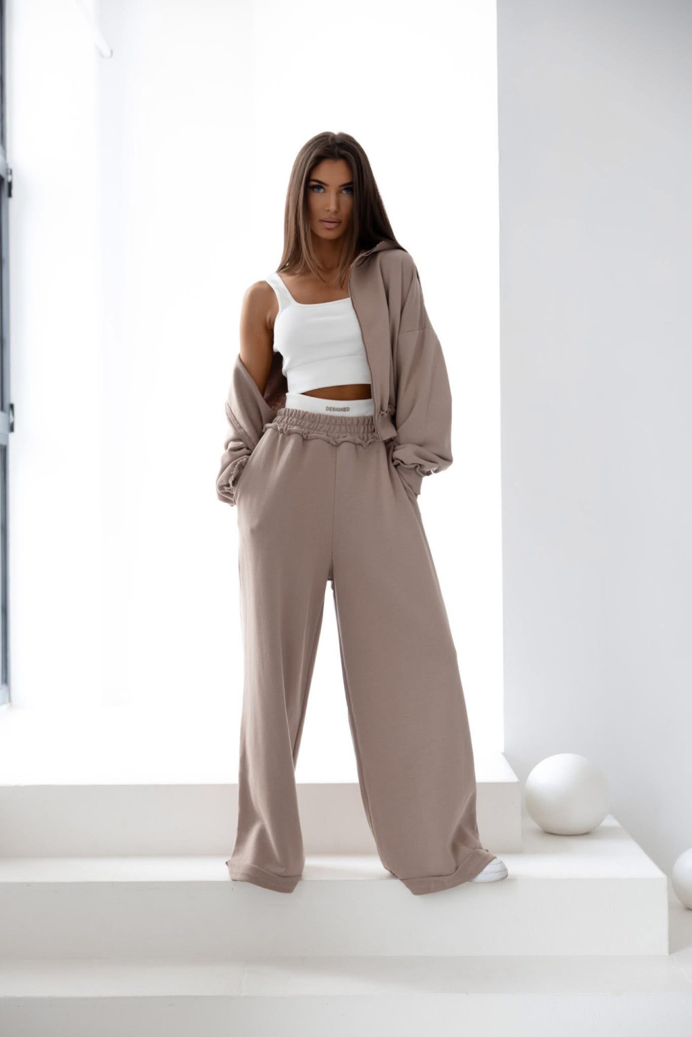 Długie, luźne spodnie o szerokich nogawkach posiadają elastyczną gumkę w pasie, zapewniając wygodę noszenia. Ozdobna wstawka nad paskiem z białej, prążkowanej tkaniny z napisem „designed” w kolorze spodni stanowi subtelny, designerski akcent.