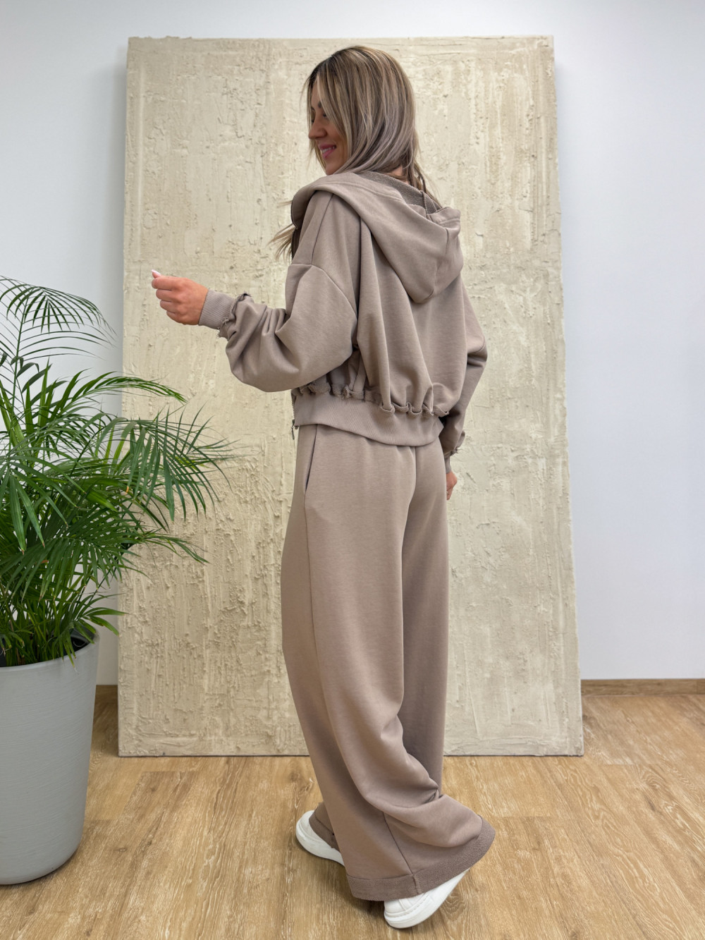 Stylowy, trzyczęściowy komplet bawełniany, który łączy komfort z nowoczesnym, modowym charakterem. Całość utrzymana w eleganckim odcieniu cappuccino, idealnym na co dzień i do stylizacji typu casual chic.