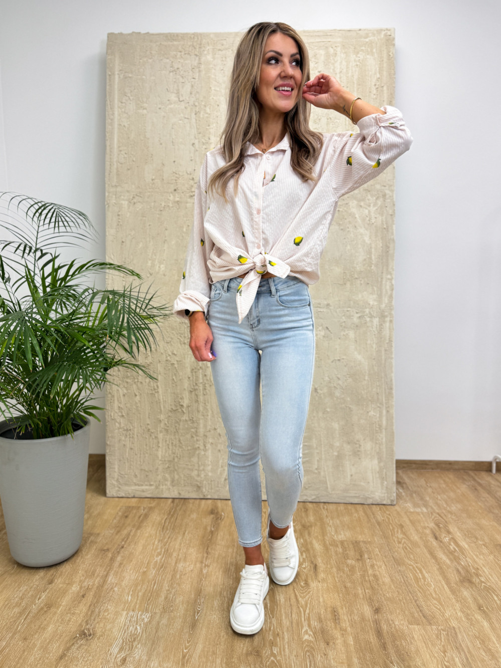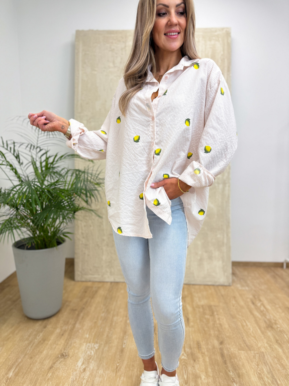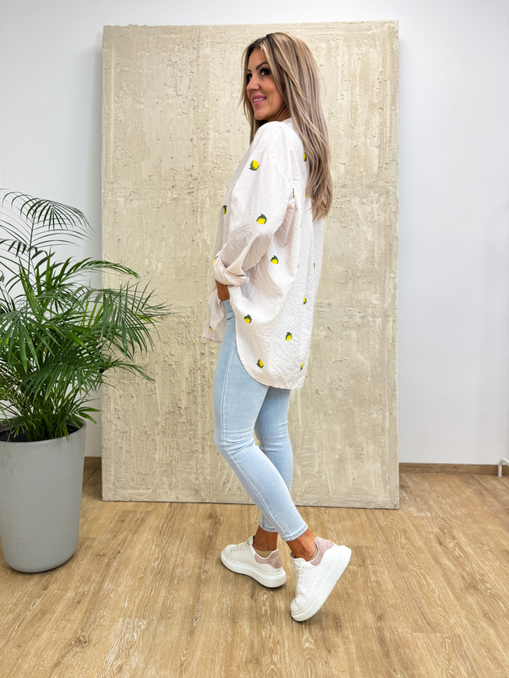 Koszula Przedłużana w Cytrynki - Biała z Pudrowym Różem
