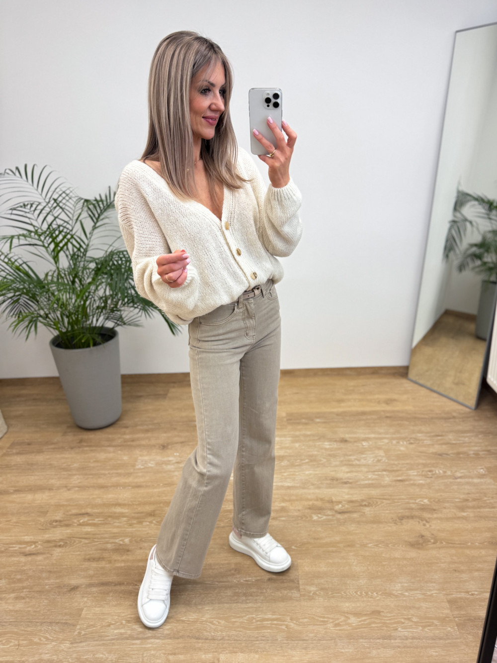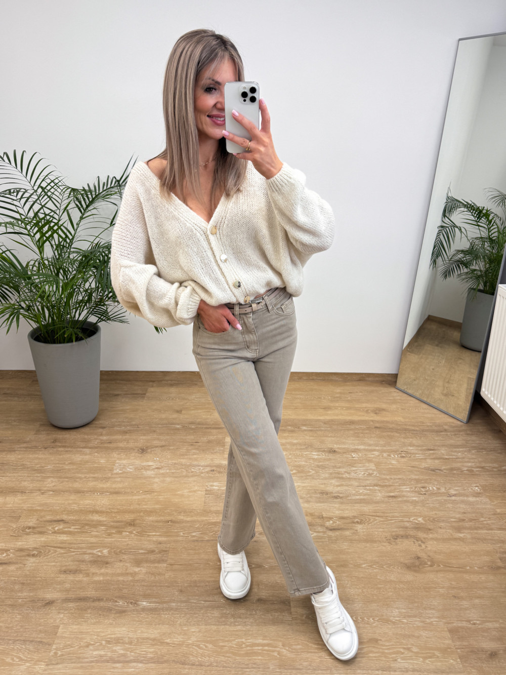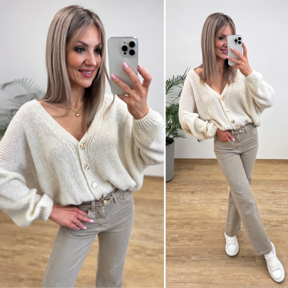 Stylowy i wygodny sweter rozpinany z głębokim dekoltem V, zapinany na cztery eleganckie guziki w kolorze złotym. Wykonany z miękkiej, przyjemnej w dotyku dzianiny, która doskonale układa się na sylwetce.