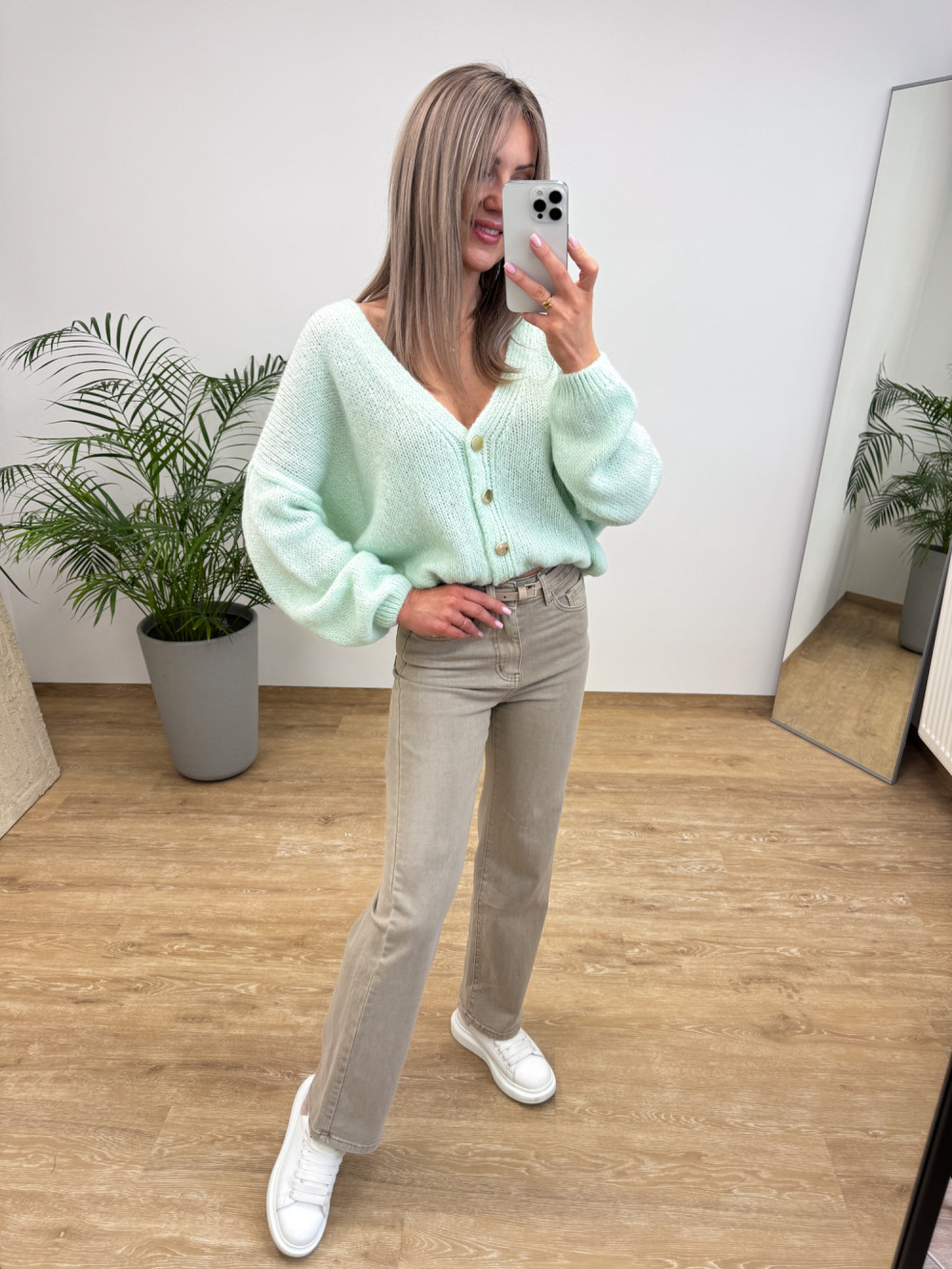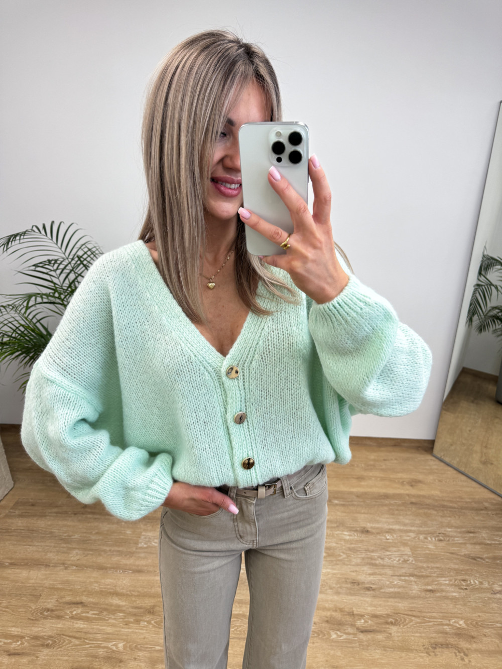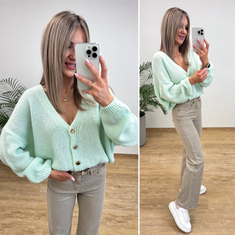 Stylowy i wygodny sweter rozpinany z głębokim dekoltem V, zapinany na cztery eleganckie guziki w kolorze złotym. Wykonany z miękkiej, przyjemnej w dotyku dzianiny, która doskonale układa się na sylwetce.