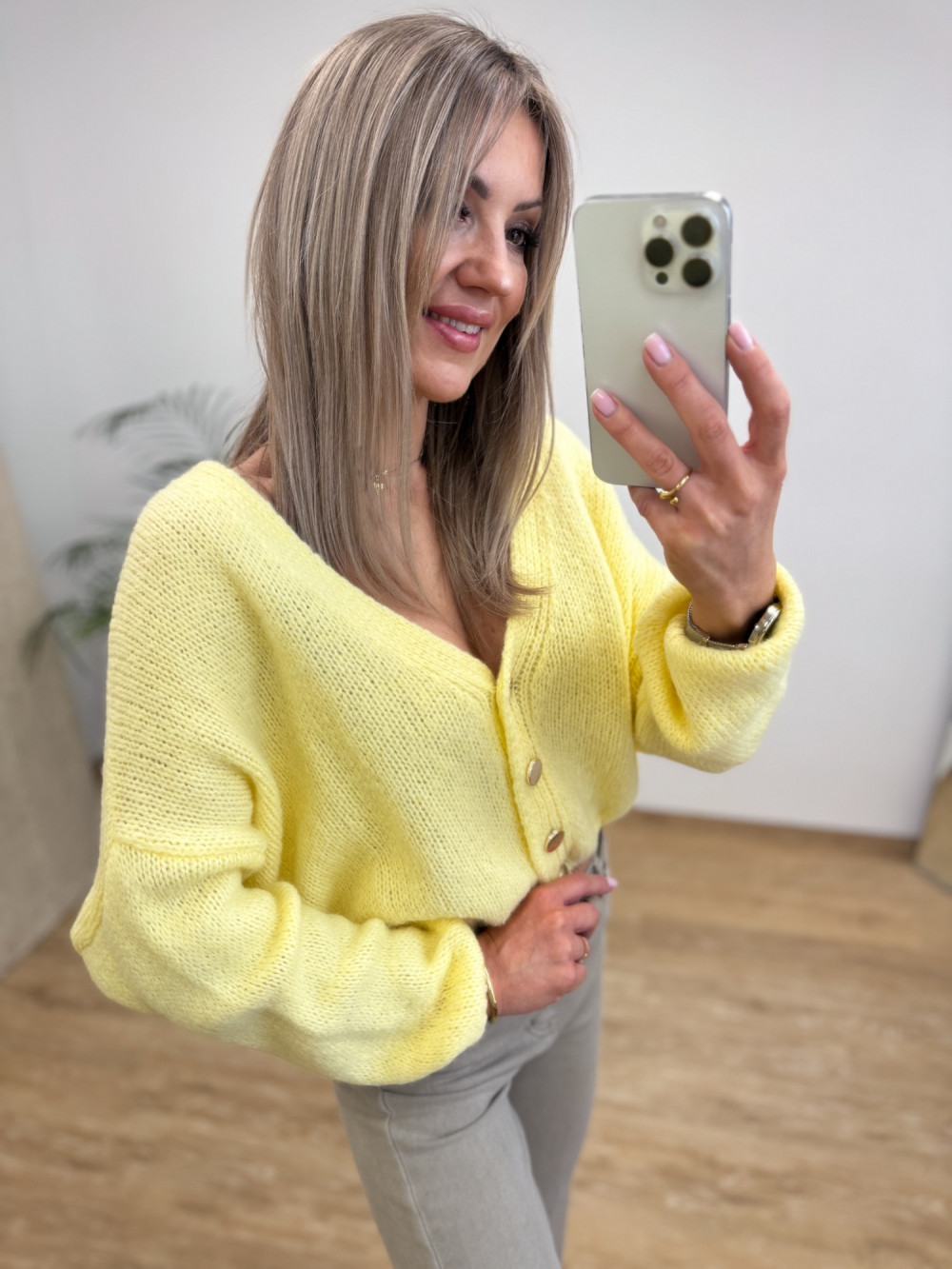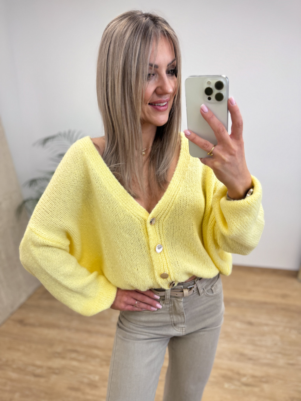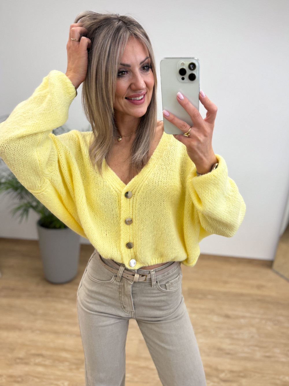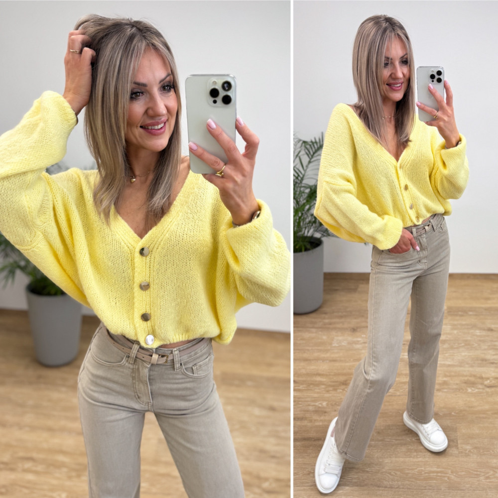 Stylowy i wygodny sweter rozpinany z głębokim dekoltem V, zapinany na cztery eleganckie guziki w kolorze złotym. Wykonany z miękkiej, przyjemnej w dotyku dzianiny, która doskonale układa się na sylwetce.