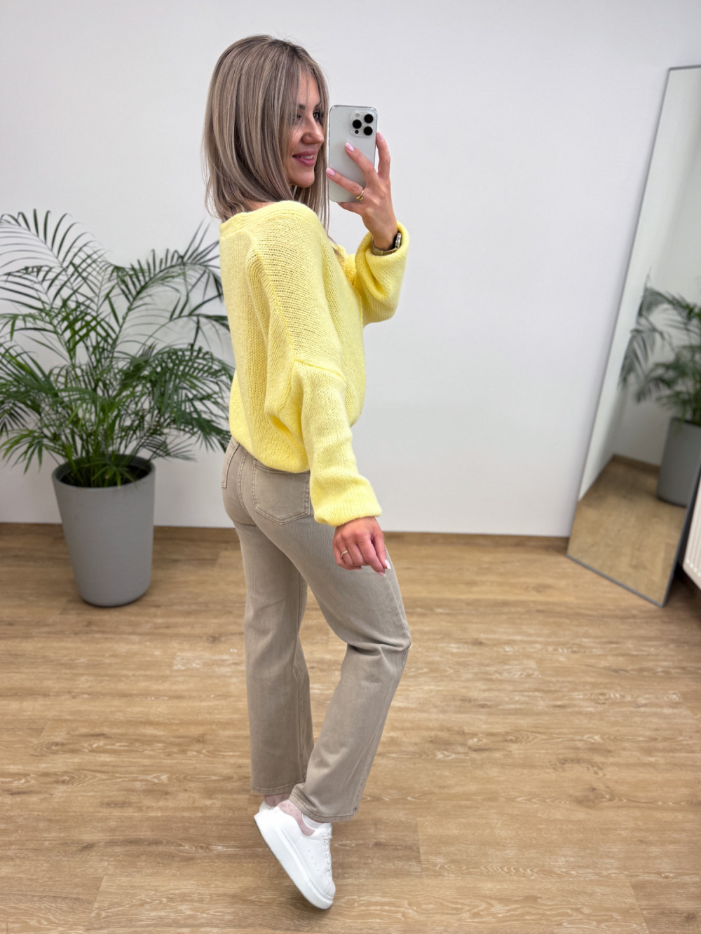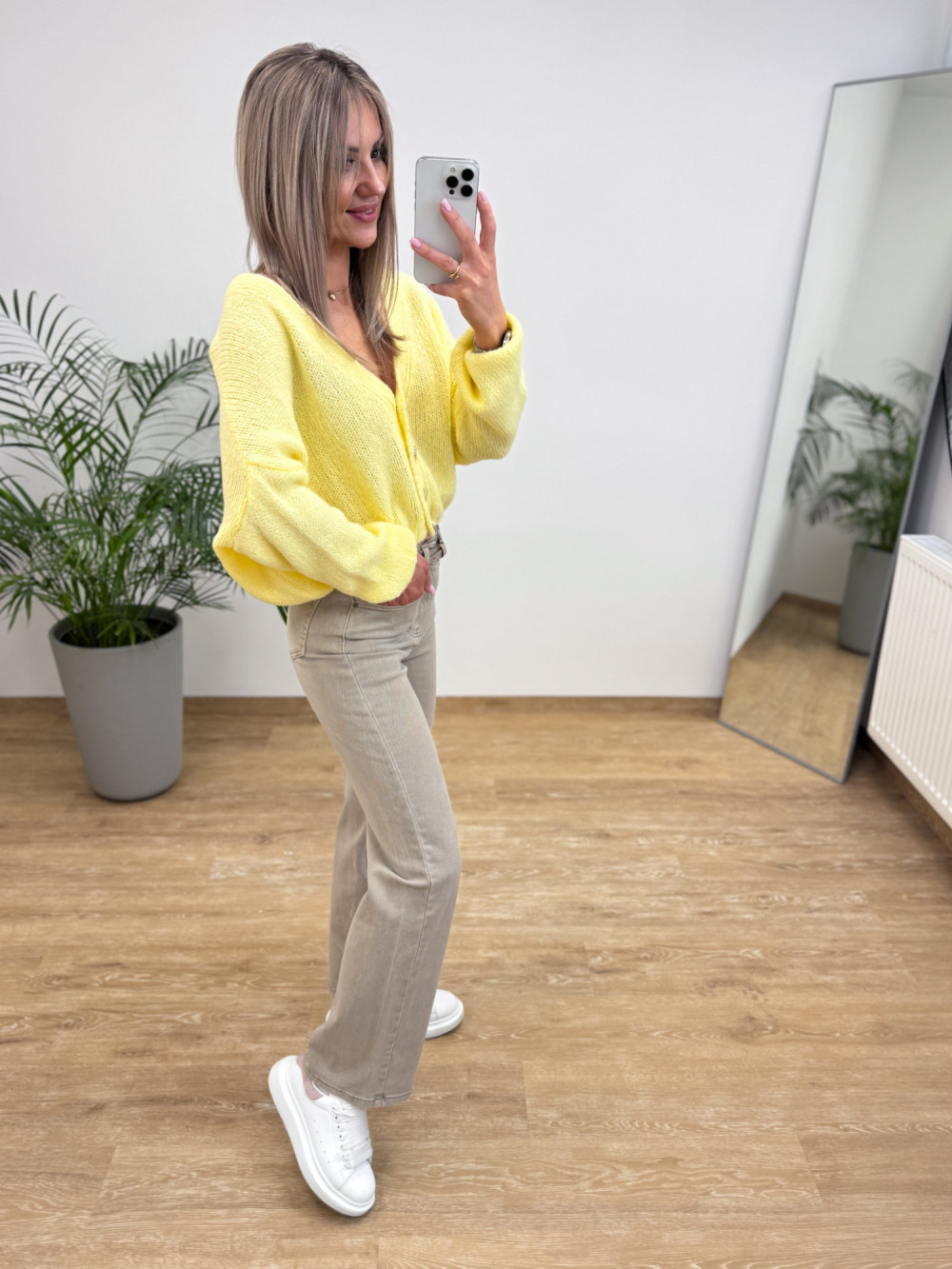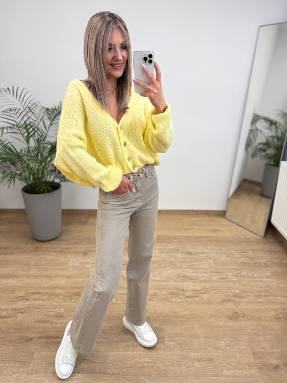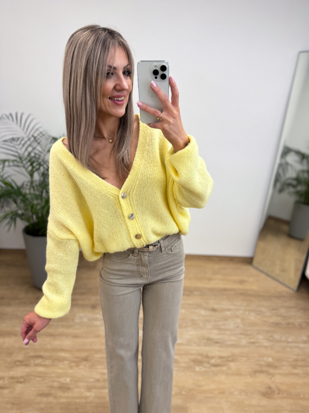 Stylowy i wygodny sweter rozpinany z głębokim dekoltem V, zapinany na cztery eleganckie guziki w kolorze złotym. Wykonany z miękkiej, przyjemnej w dotyku dzianiny, która doskonale układa się na sylwetce.