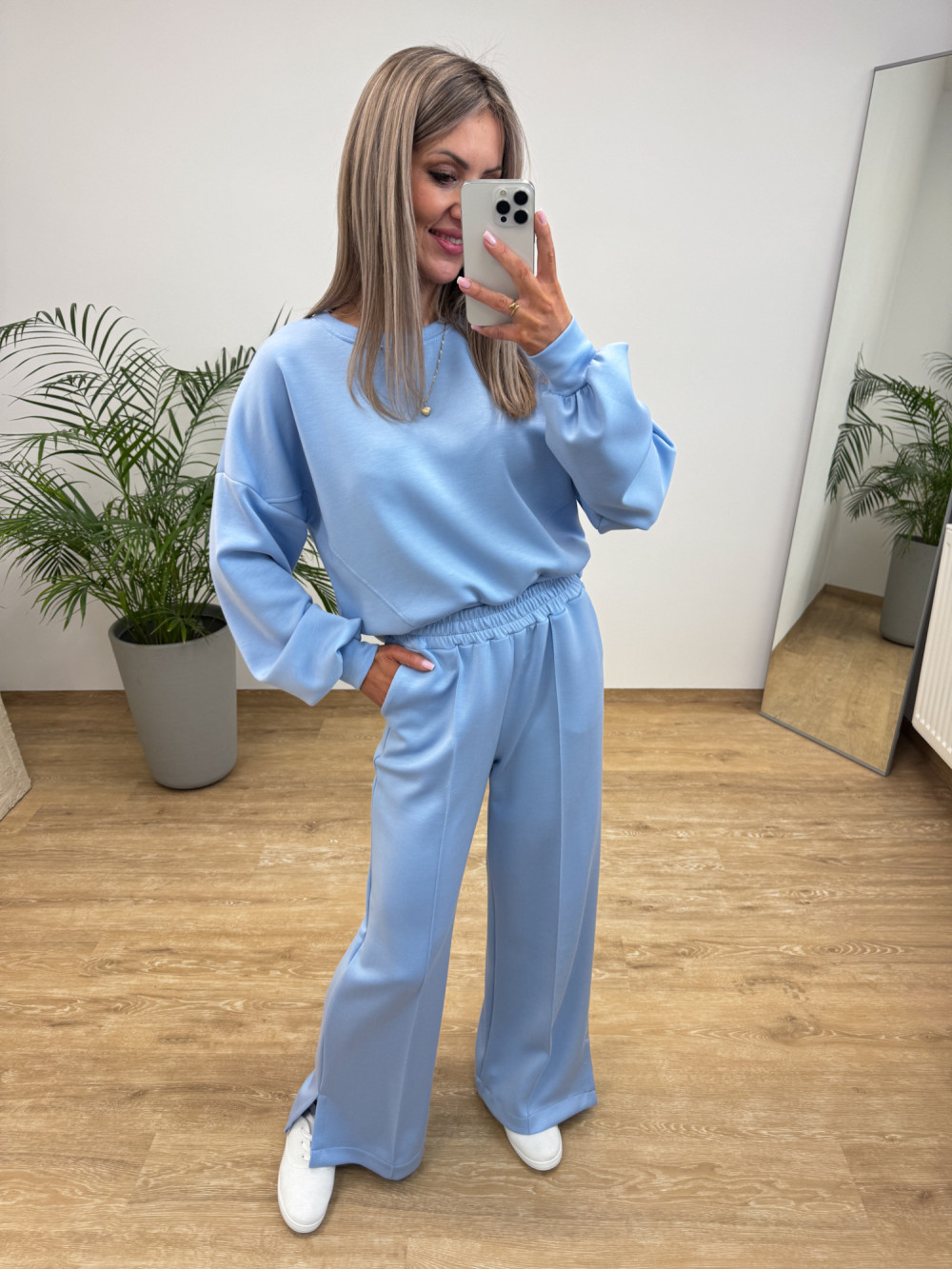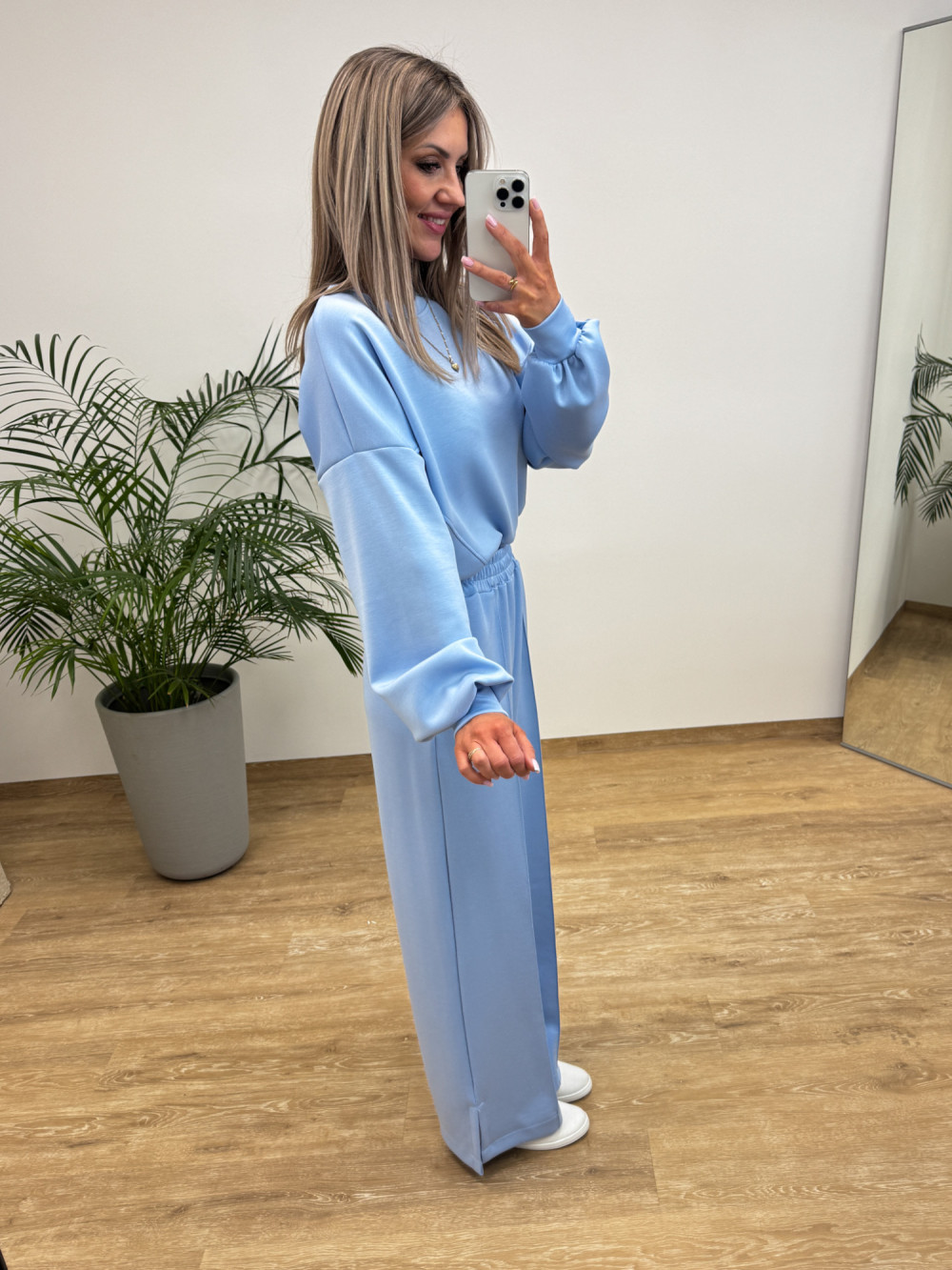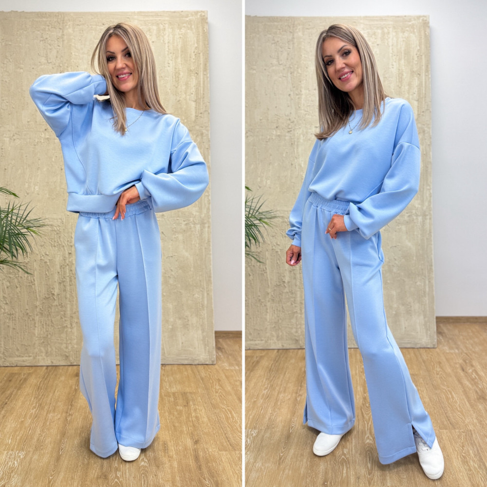 W skład kompletu wchodzi luźna bluza, najmodniejsze szerokie spodnie typu wide-leg. Spodnie z eleganckim przeszyciem z przodu optycznie wydłużają nogi i nadają sylwetce lekkości. Delikatny, błękitny odcień doskonale wpisuje się w wiosenne trendy i rozświetla każdą stylizację.