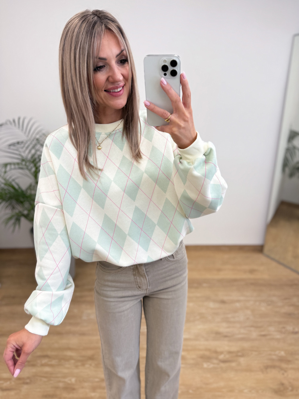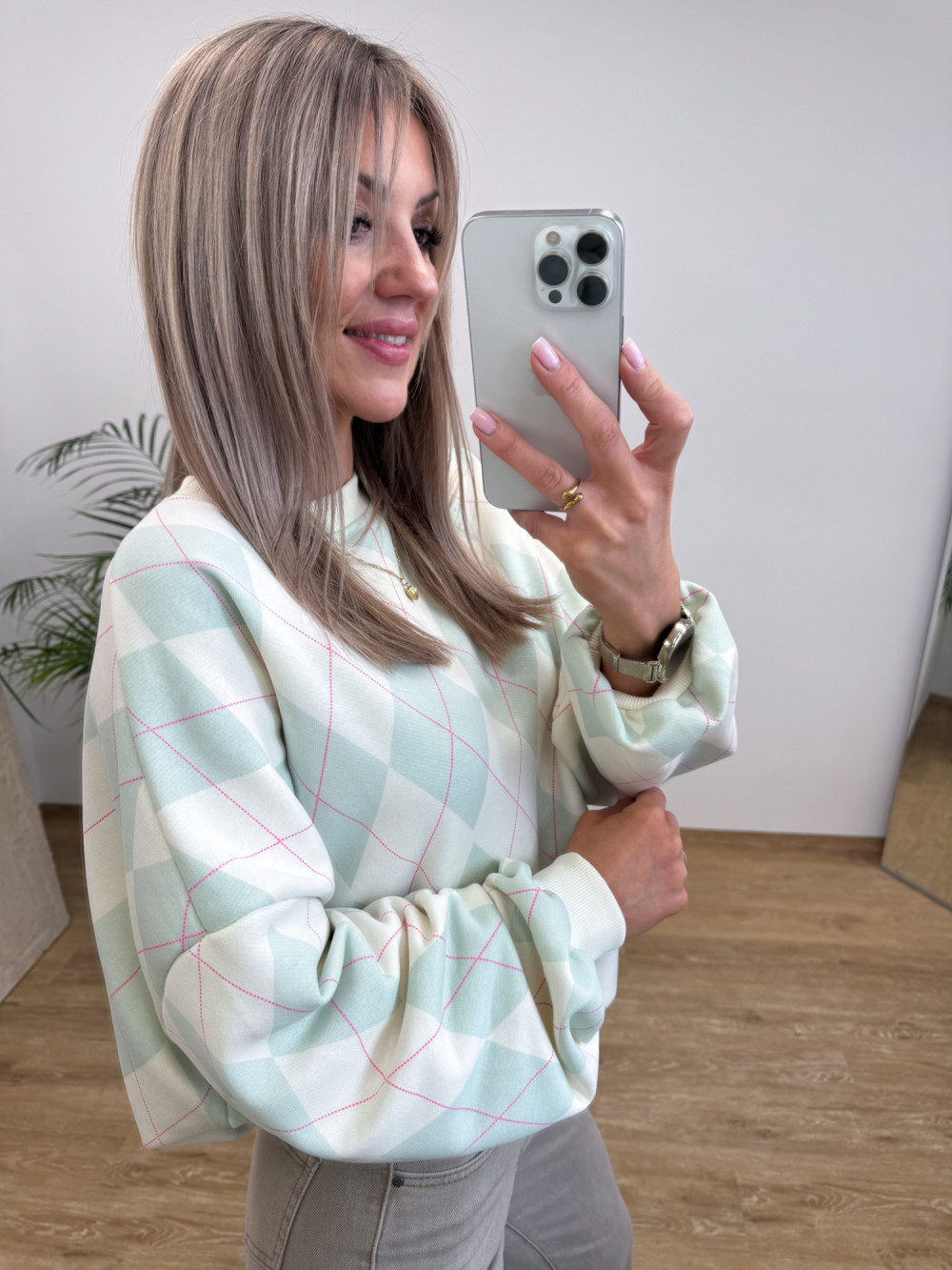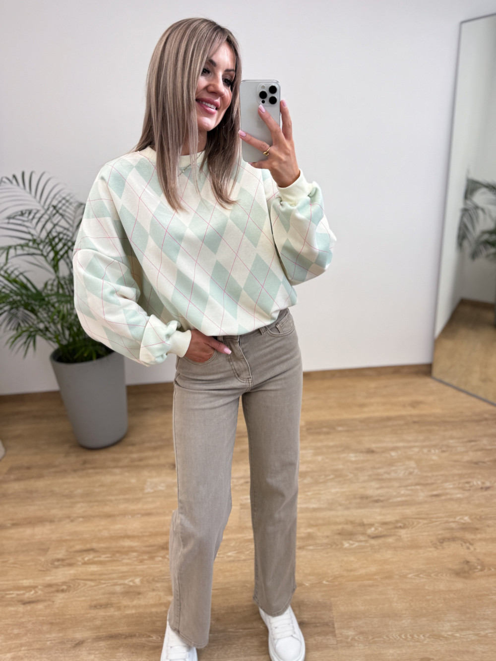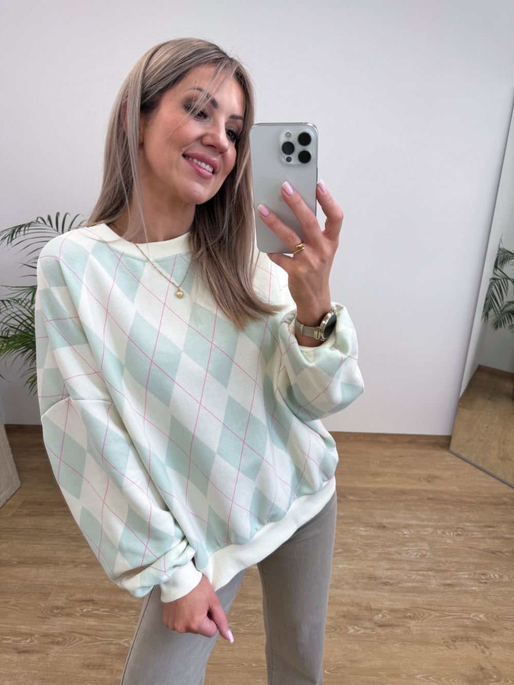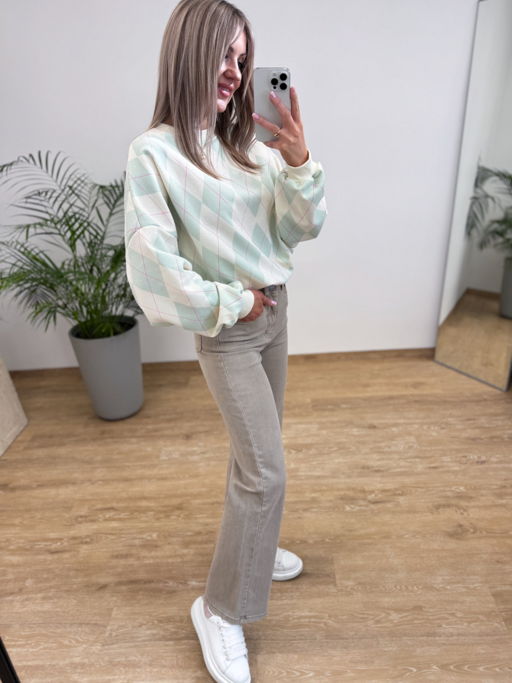 Model z ozdobnym wzorem rombów, które dodają bluzie charakteru.
