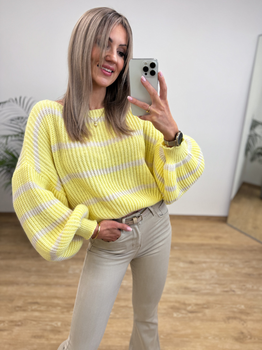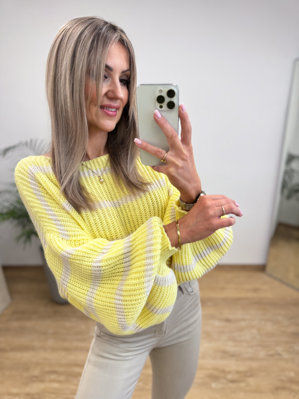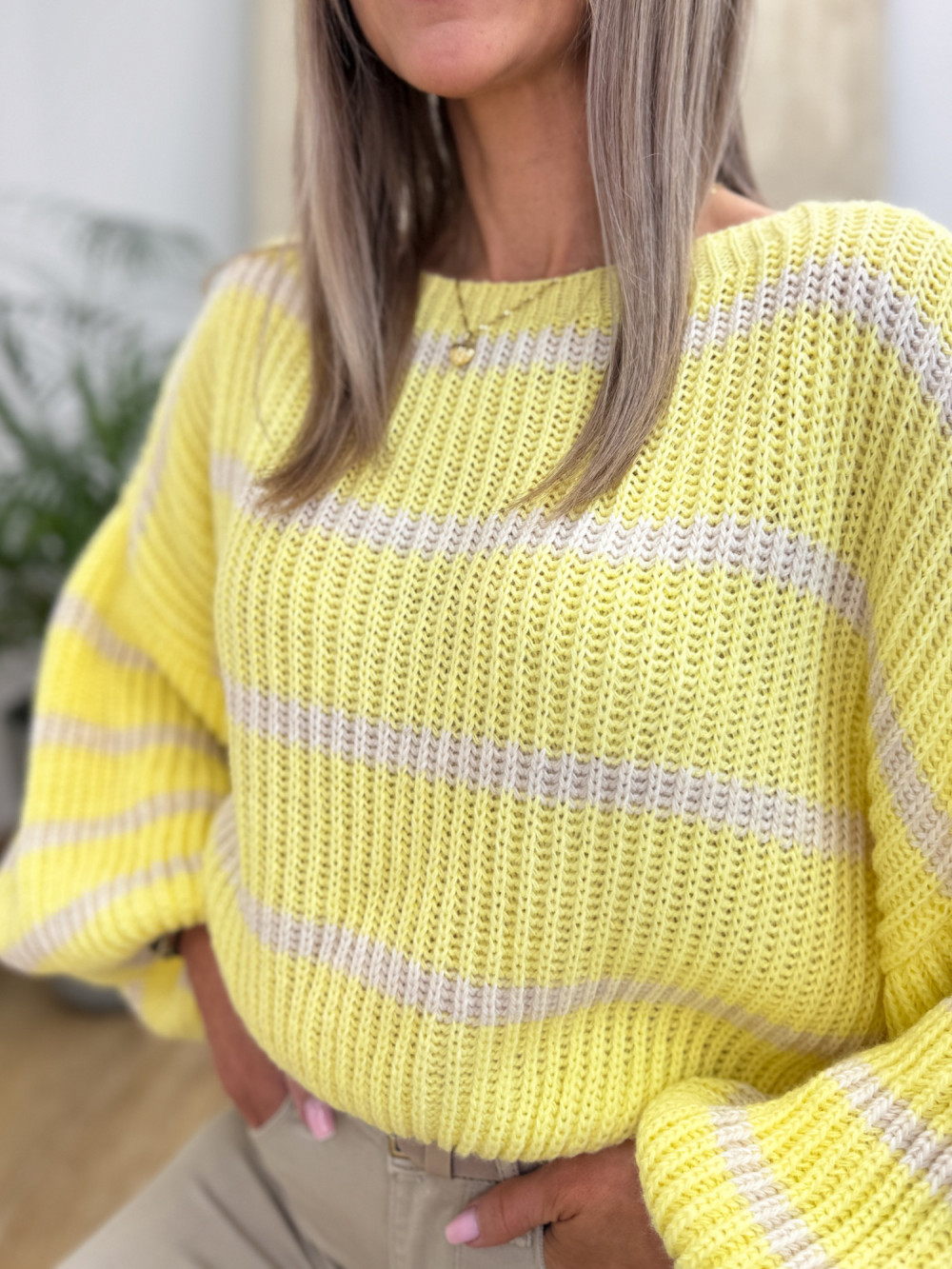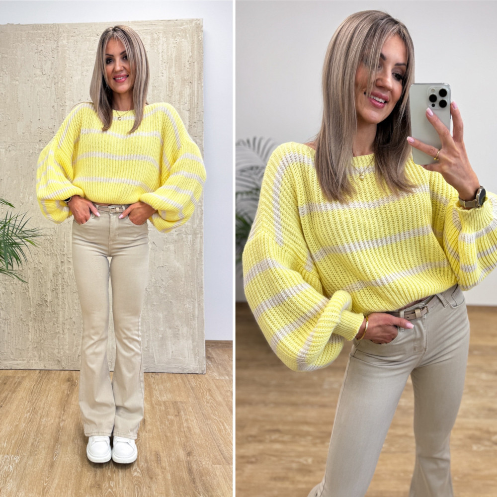 Sweter w Paski Bufka Rękaw Allure - Żółty z Wanilią