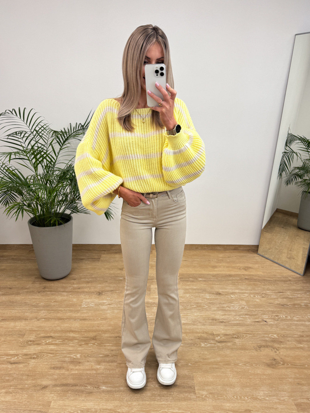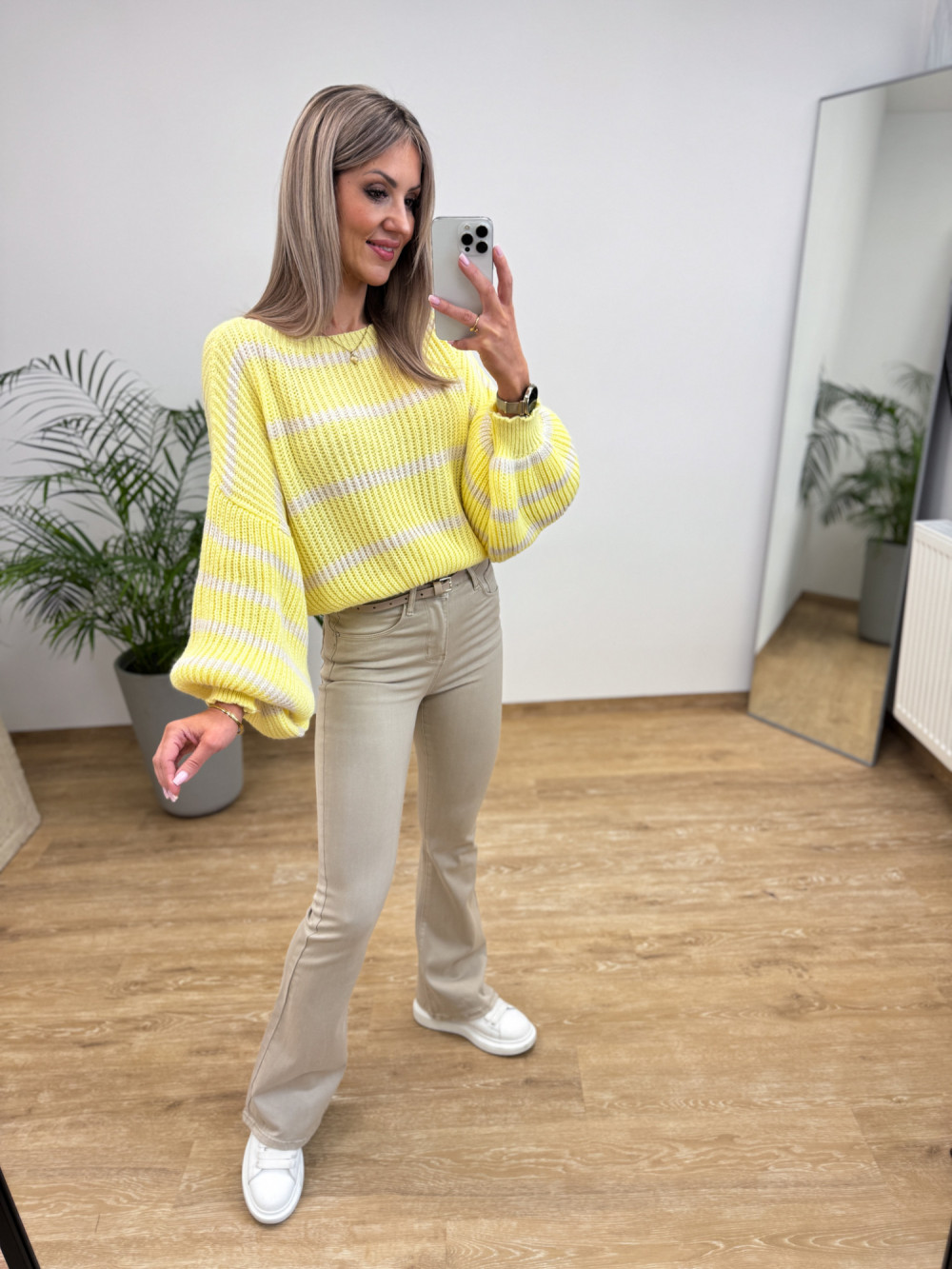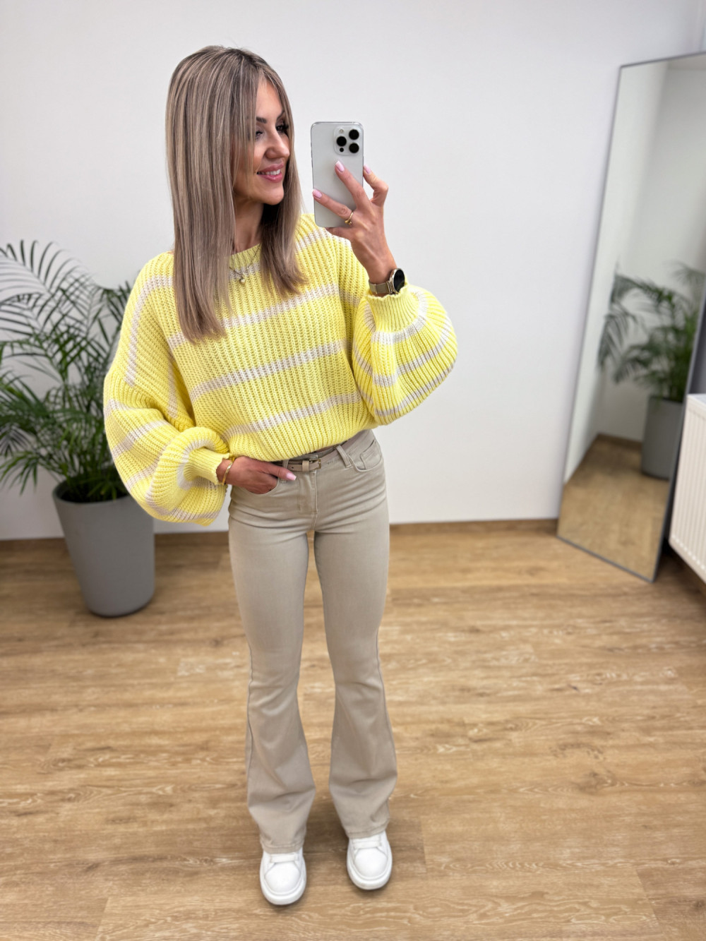 Sweter w Paski Bufka Rękaw Allure - Żółty z Wanilią