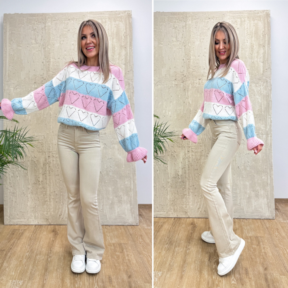 Delikatny sweter z domieszką wełny, który łączy przytulność z niepowtarzalnym stylem. Dzianina ozdobiona jest ażurowym wzorem serc, nadającym całości lekkości i charakteru. Na całej powierzchni swetra przeplatają się trzy harmonijnie dobrane odcienie, ułożone w poziome fale. Biały / błękitny / różowy