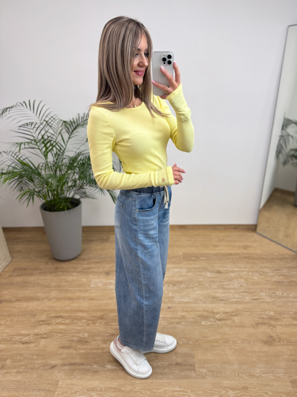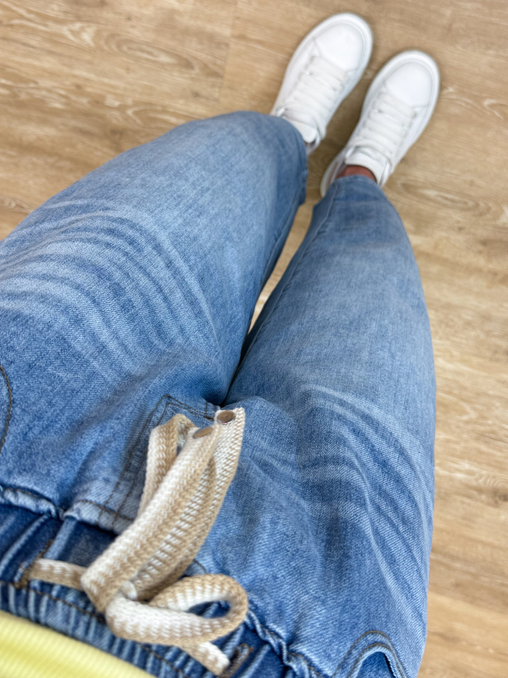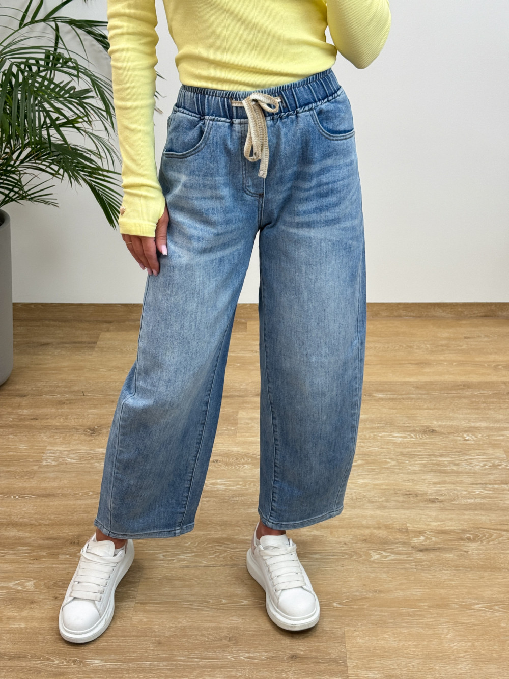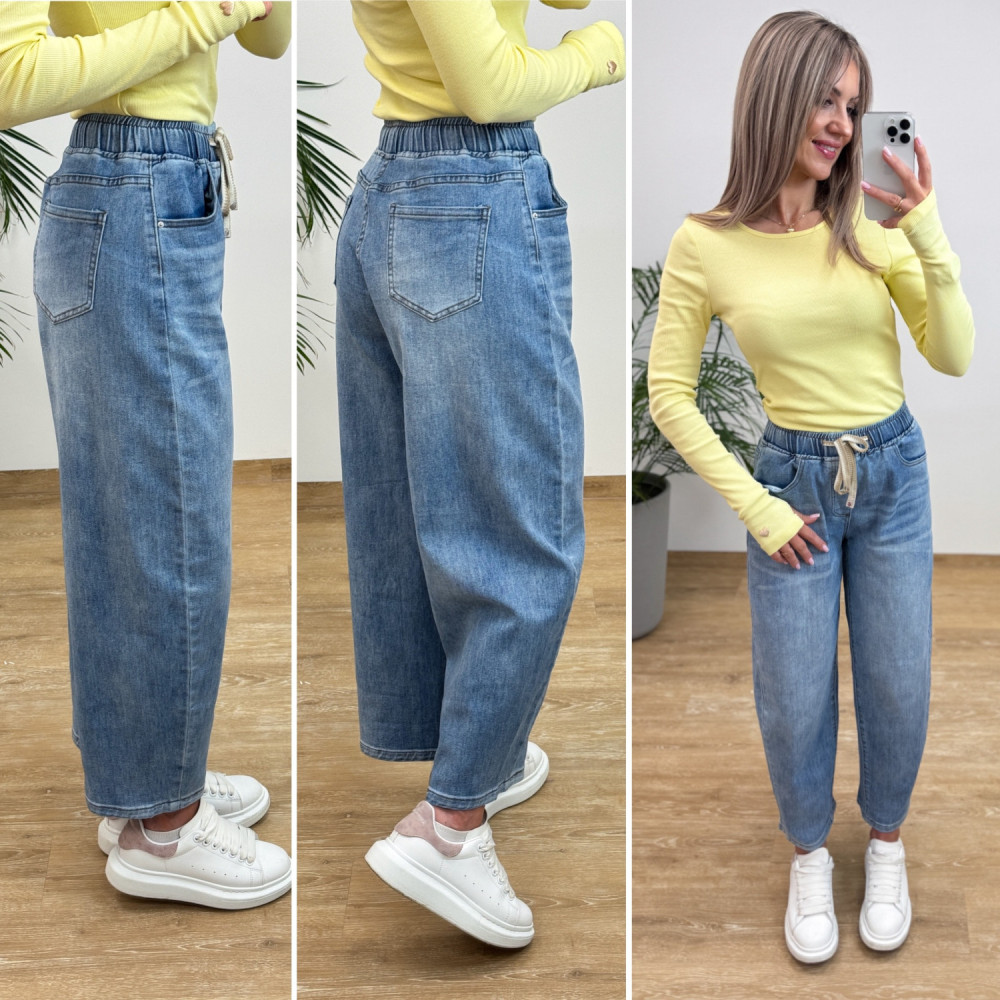 Jeansy o modnym kroju balloon, wykonane z lekkiego i miękkiego denimu. Model na wygodnej gumce w pasie, dodatkowo regulowany sznurkiem, zapewnia komfort i idealne dopasowanie.