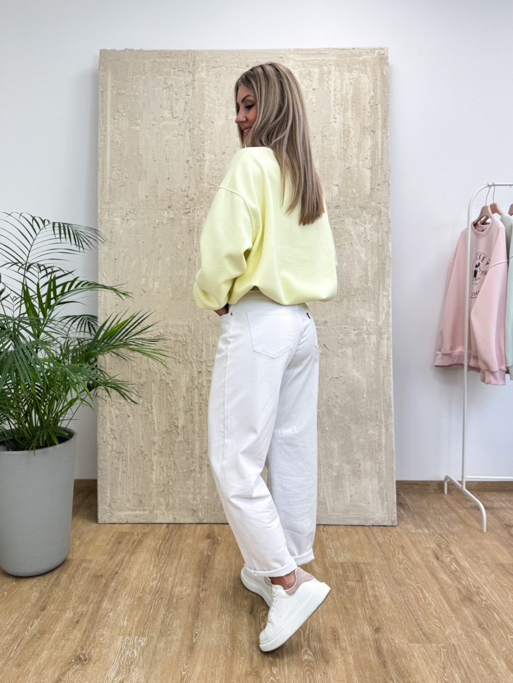 Oversizowa, miękka bluza wykonana z bawełnianej dresówki. Model w delikatnym odcieniu żółtej pasteli został ozdobiony subtelnym nadrukiem z przodu, co nadaje całości lekkiego, dziewczęcego charakteru.