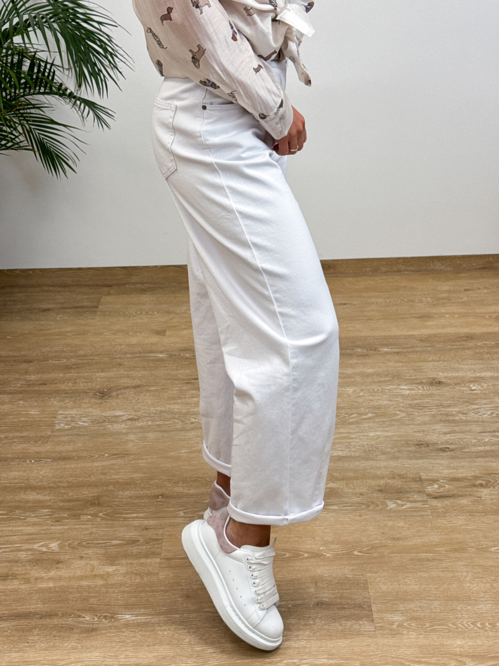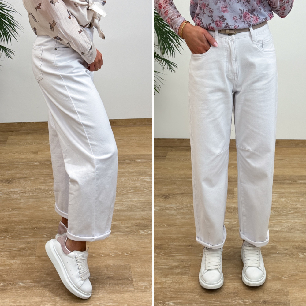 Modne spodnie jeansowe o kroju balloon w najgorętszym kolorze sezonu – czystej bieli.