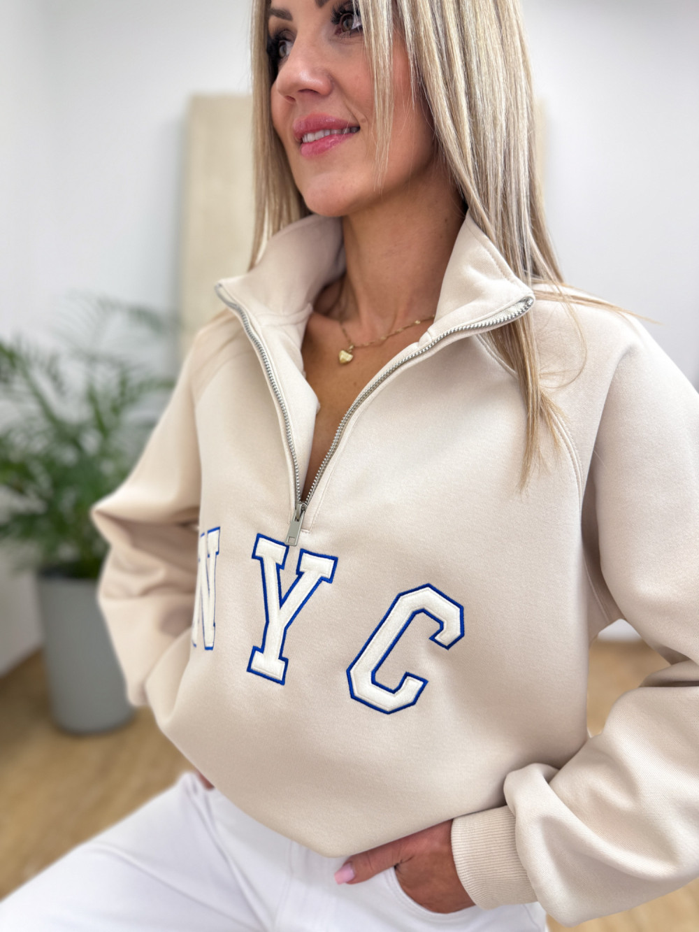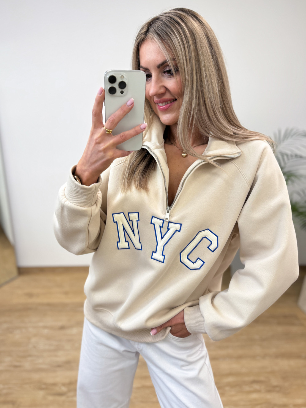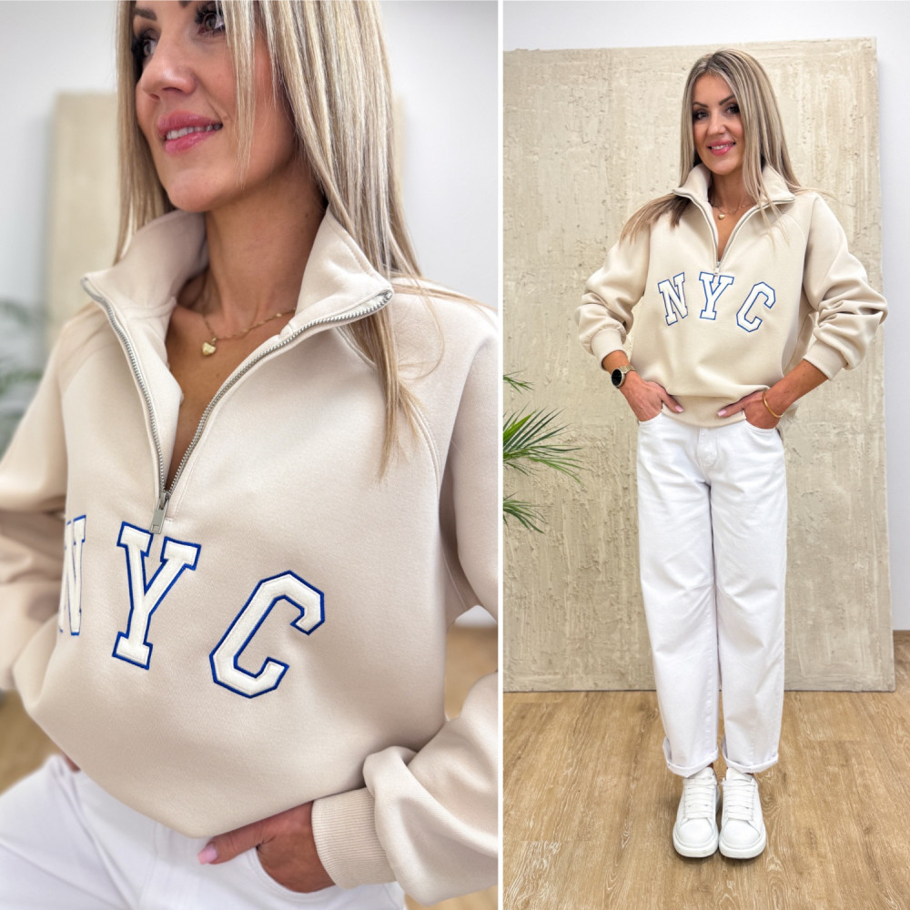 Oversizowa, miękka bluza wykonana z bawełnianej dresówki. Model w delikatnym odcieniu beżu został ozdobiony wyszywanymi literami NYC z przodu, co nadaje całości lekkiego, casualowego charakteru.