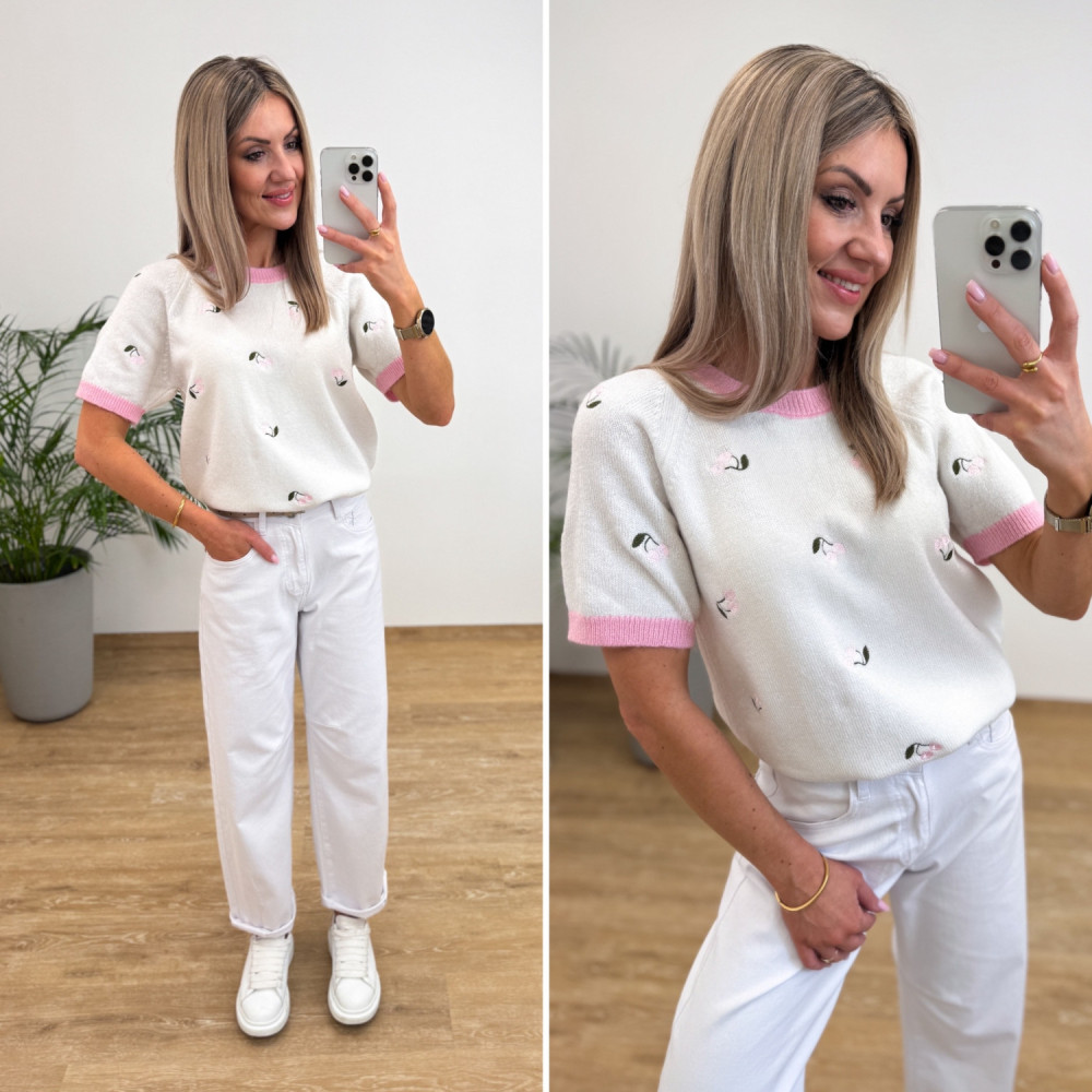 Sweterek Perfumowany z Krótszym Rękawem w Wisienki Cherry - Biały