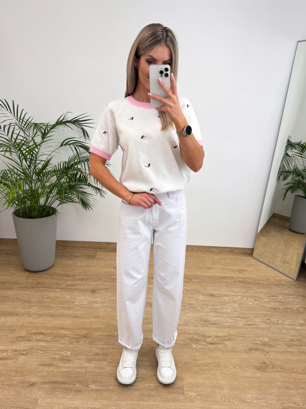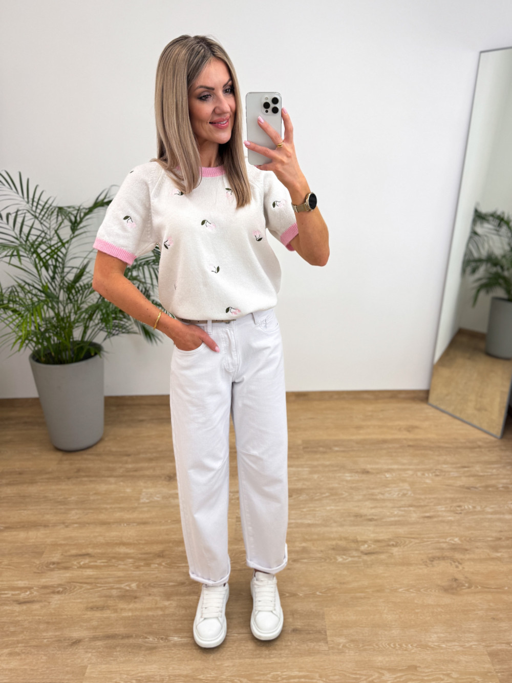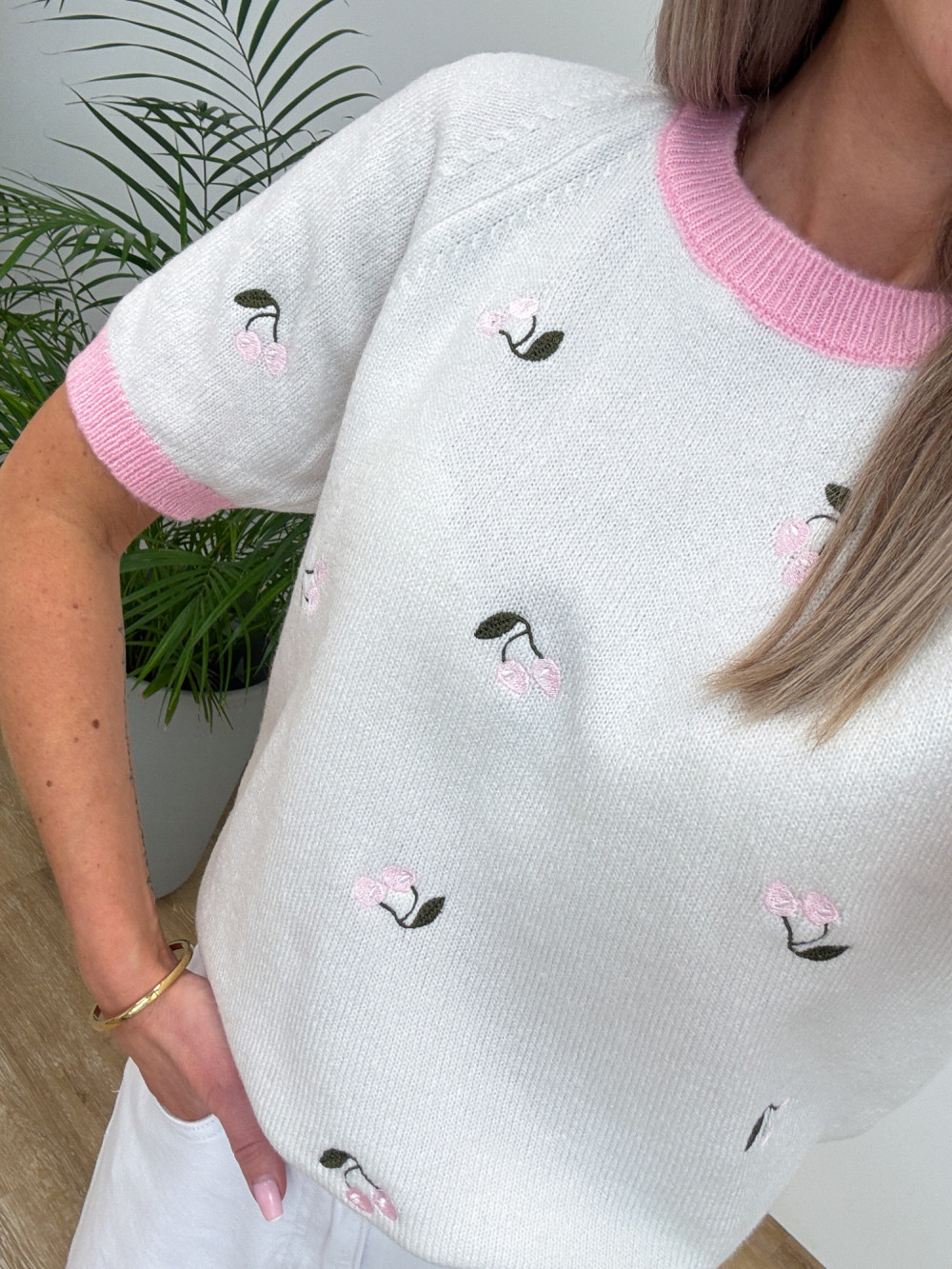 Miękki i przyjemny w dotyku perfumowany sweterek z krótkim rękawem to świetna propozycja na codzienne, lekkie stylizacje. Delikatna dzianina zdobiona jest wyszywanymi wisienkami, a prosty krój sprawia, że sweterek łatwo zestawić z jeansami, spódnicami czy szortami. Idealny do casualowych stylizacji łącząc wygodę z subtelnym, stylowym detalem.