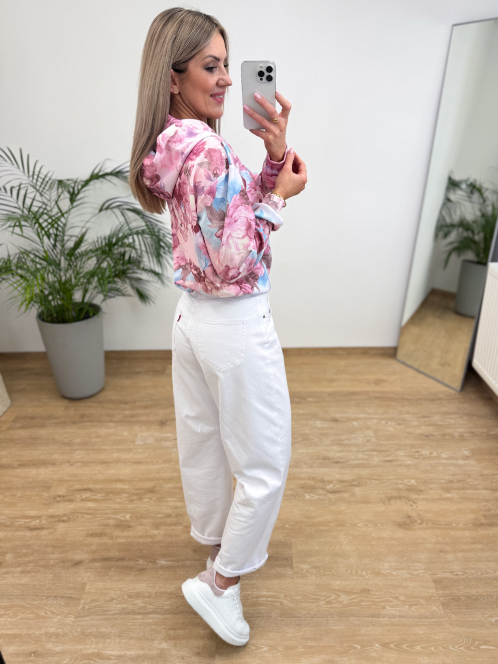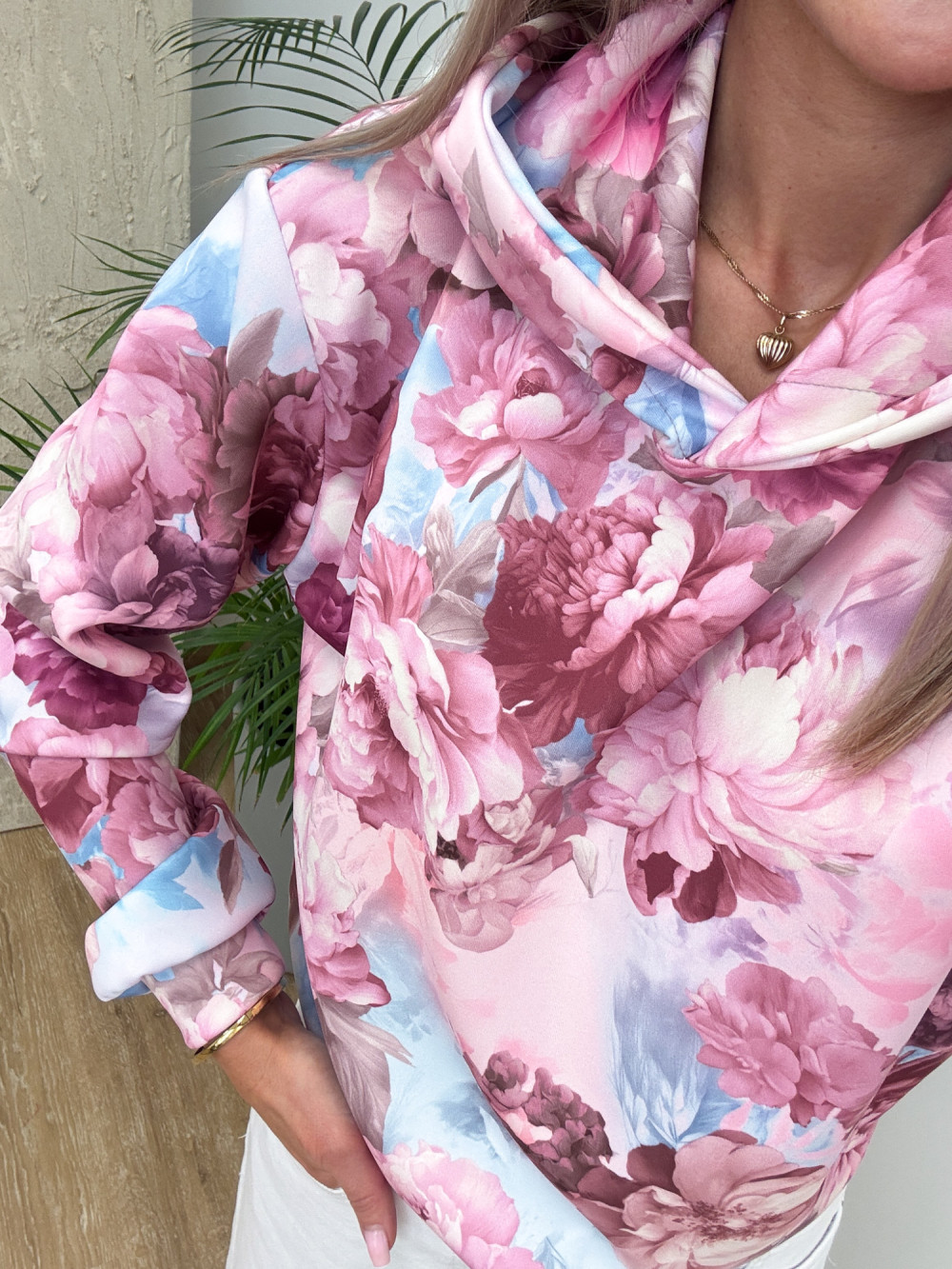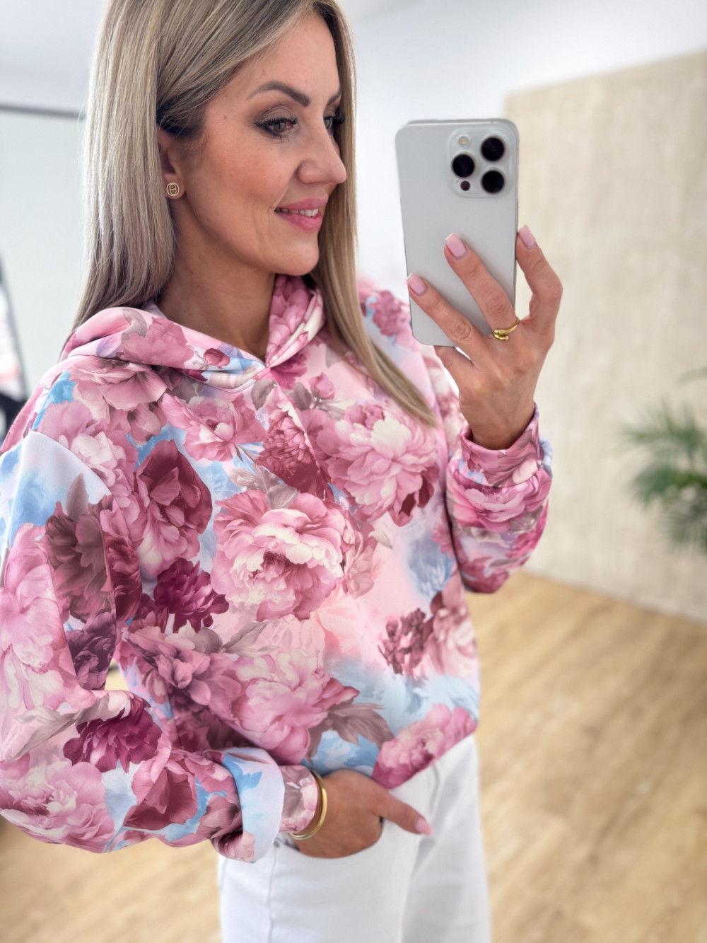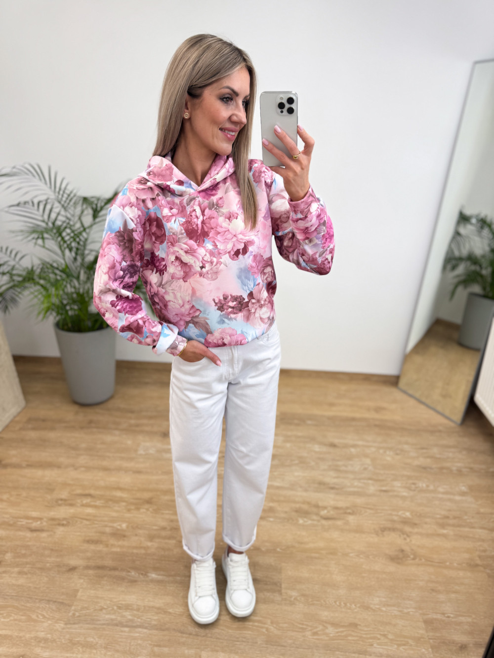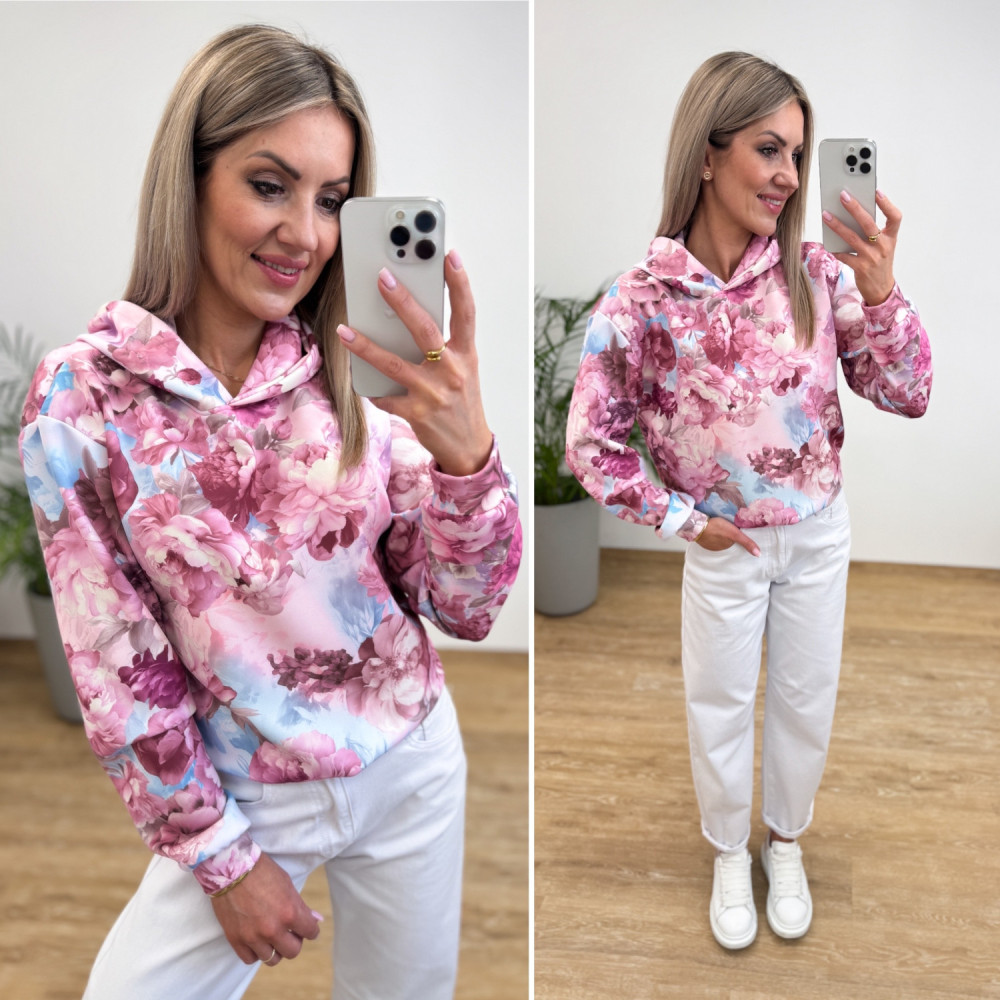 Miękka i wygodna bluza z kapturem o oversizowym kroju, uszyta z wysokiej jakości tkaniny typu "masełko". Model posiada ściągacze na rękawach i u dołu, co nadaje mu sportowego charakteru i sprawia, że świetnie się układa. Bluza uszyta z wzorzystej tkaniny w kwiaty w pastelowych barwach, które dodają jej uroku.