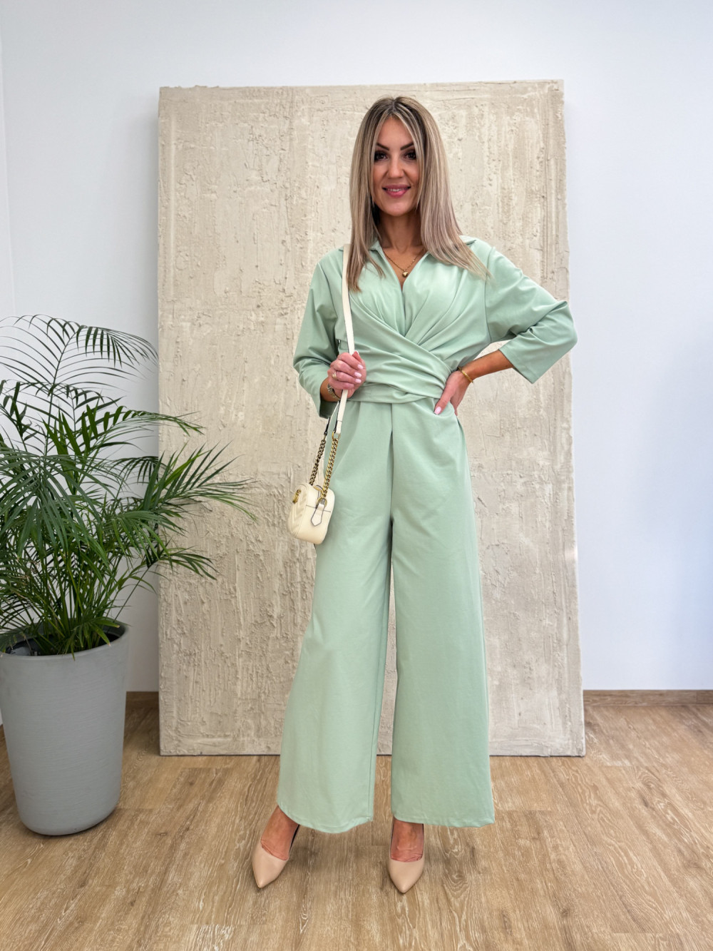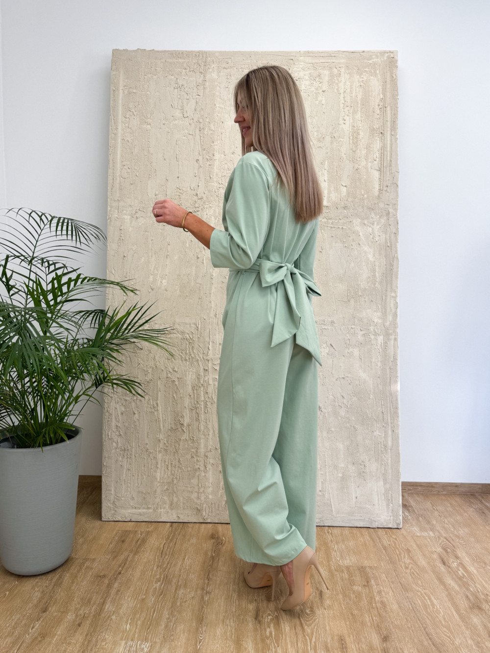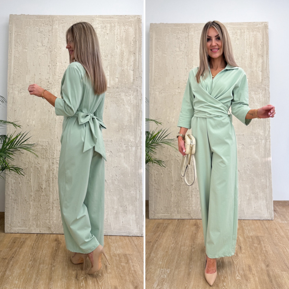 Tył kombinezonu ozdobiony jest wiązaniem na kokardę, które nie tylko stanowi efektowny detal, ale również pozwala regulować szerokość i dopasowanie w talii do sylwetki. Luźne, szersze nogawki o prostym kroju pięknie układają się w ruchu i optycznie wydłużają nogi.