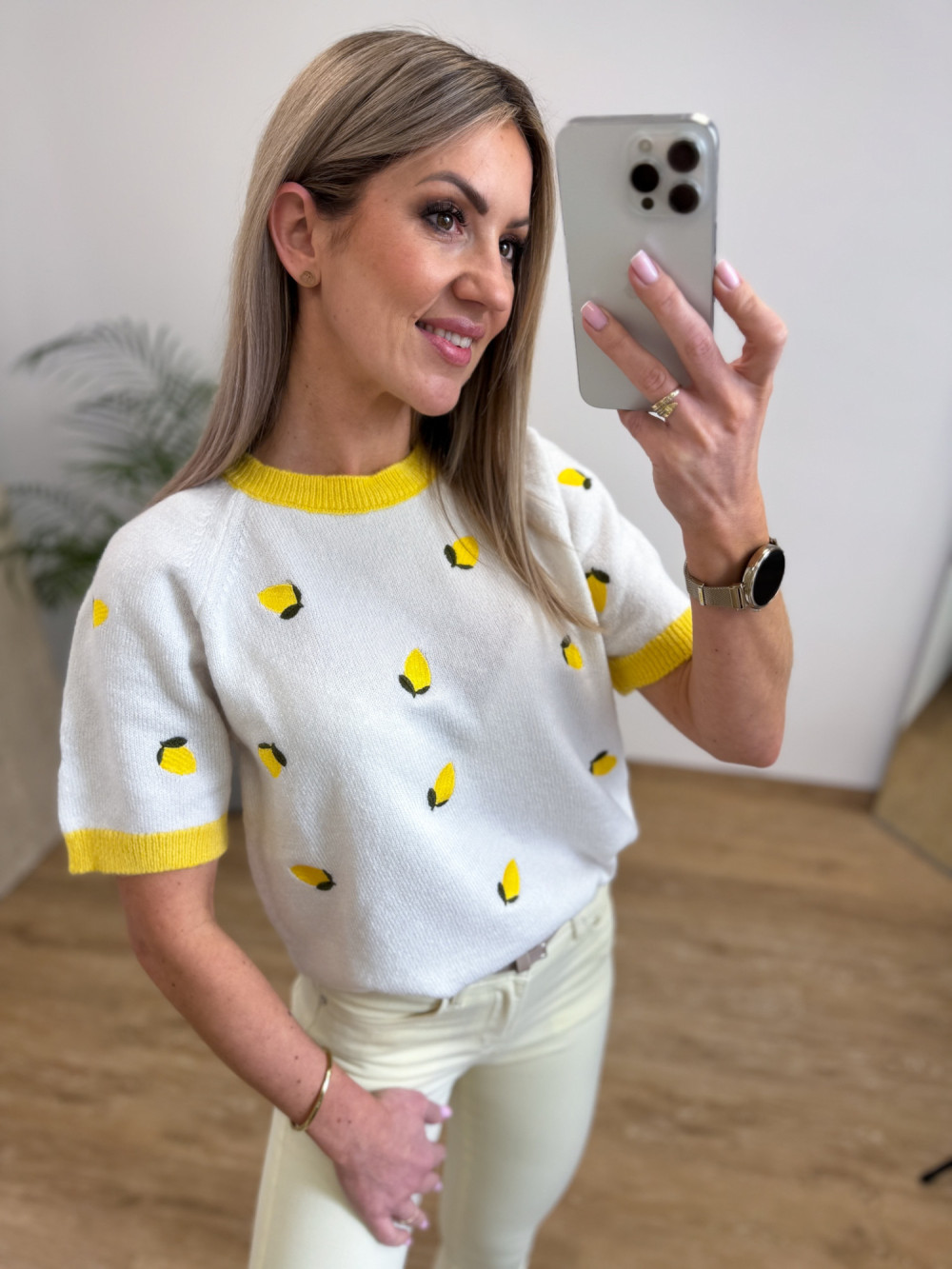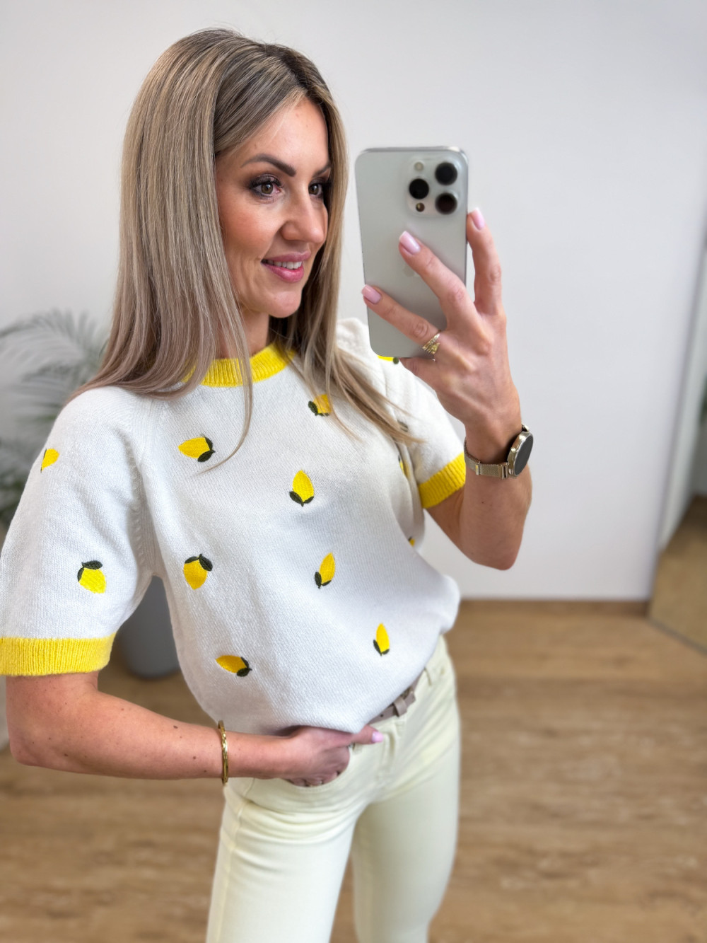 Miękki i przyjemny w dotyku sweterek z krótkim rękawem to świetna propozycja na codzienne, lekkie stylizacje. Delikatna dzianina zdobiona jest wyszywanymi cytrynkami, a prosty krój sprawia, że sweterek łatwo zestawić z jeansami, spódnicami czy szortami. Idealny do casualowych stylizacji łącząc wygodę z subtelnym, stylowym detalem.m.