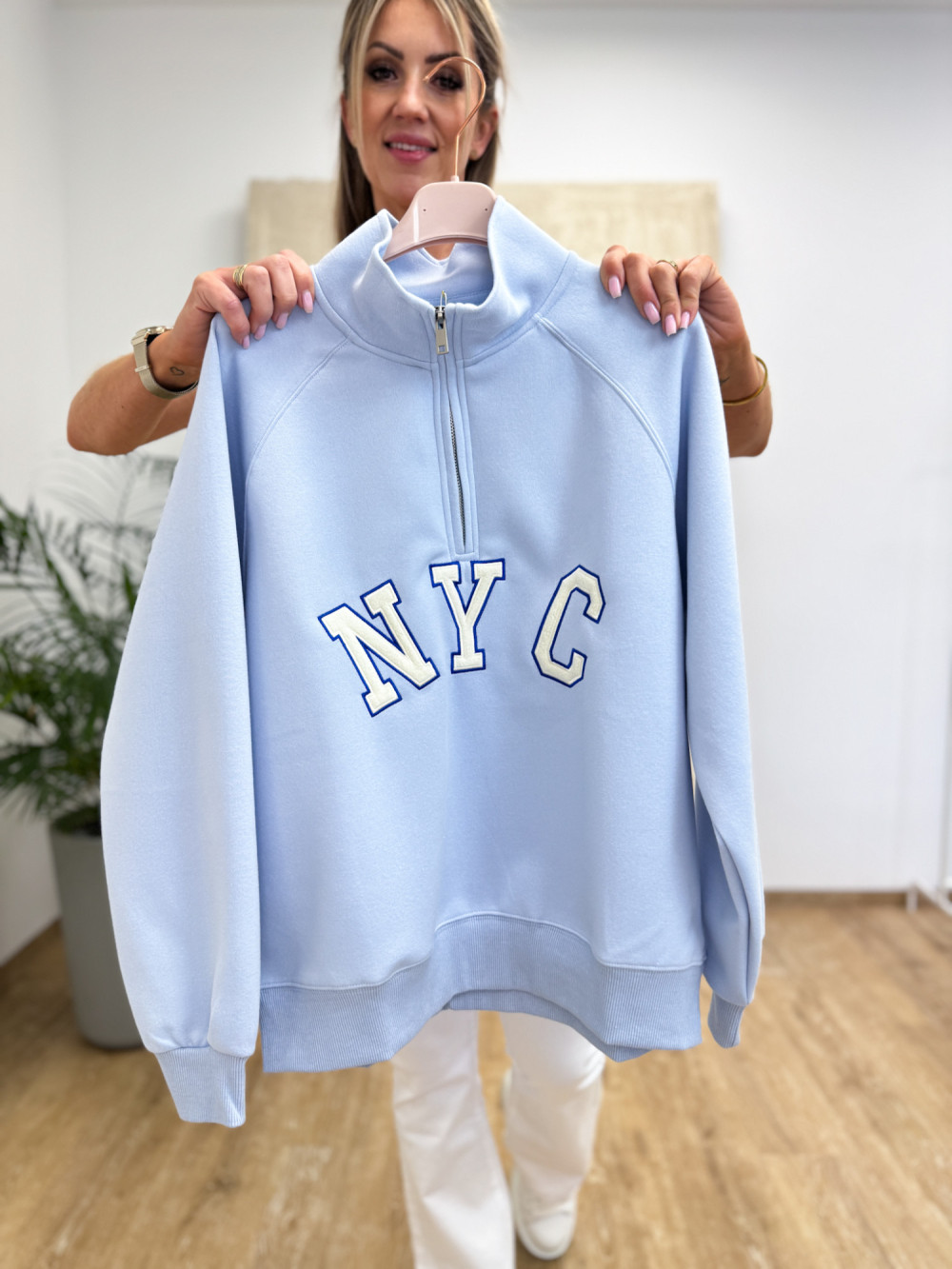 Oversizowa, miękka bluza wykonana z bawełnianej dresówki. Model w delikatnym odcieniu beżu został ozdobiony wyszywanymi literami NYC z przodu, co nadaje całości lekkiego, casualowego charakteru.