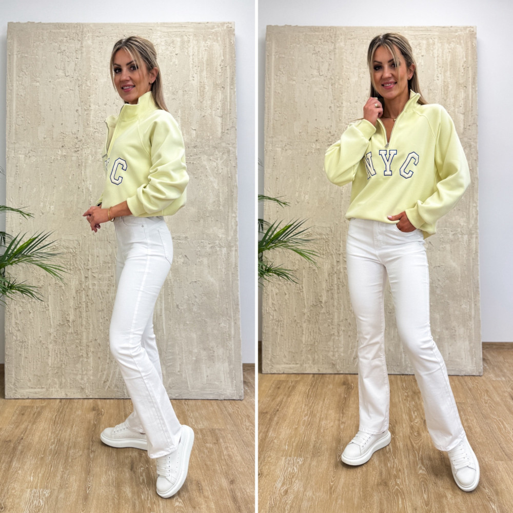 Oversizowa, miękka bluza wykonana z bawełnianej dresówki. Model w delikatnym odcieniu beżu został ozdobiony wyszywanymi literami NYC z przodu, co nadaje całości lekkiego, casualowego charakteru.