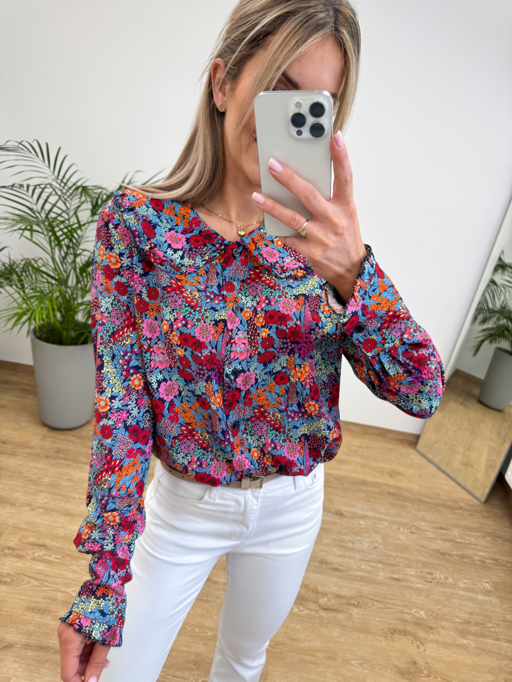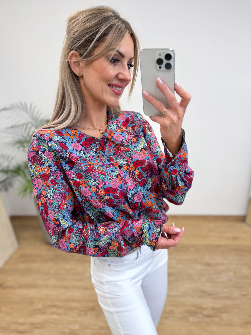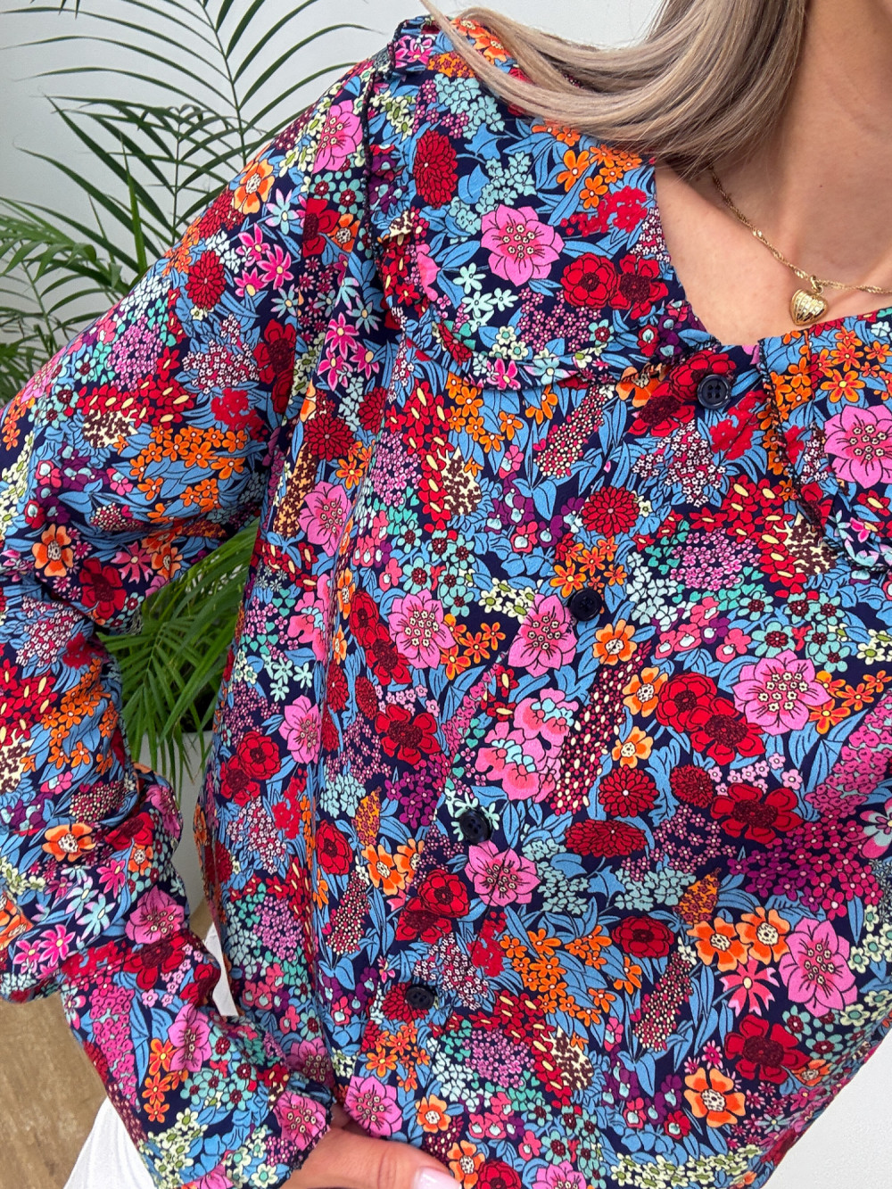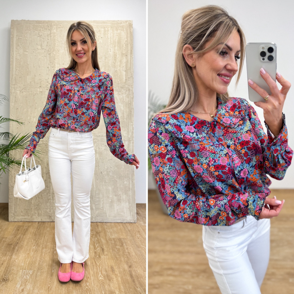 Lekka i stylowa wiskozowa bluzka koszulowa w kwiatuszki na granatowej tkaninie. Zaokrąglony kołnierzyk ozdobiony falbanką dodaje jej dziewczęcego, delikatnego charakteru. Rękawy długie zakończone mankietem zapinanym na guzik. Krój prosty, rozpinany po całości, można nosić związaną na dole.