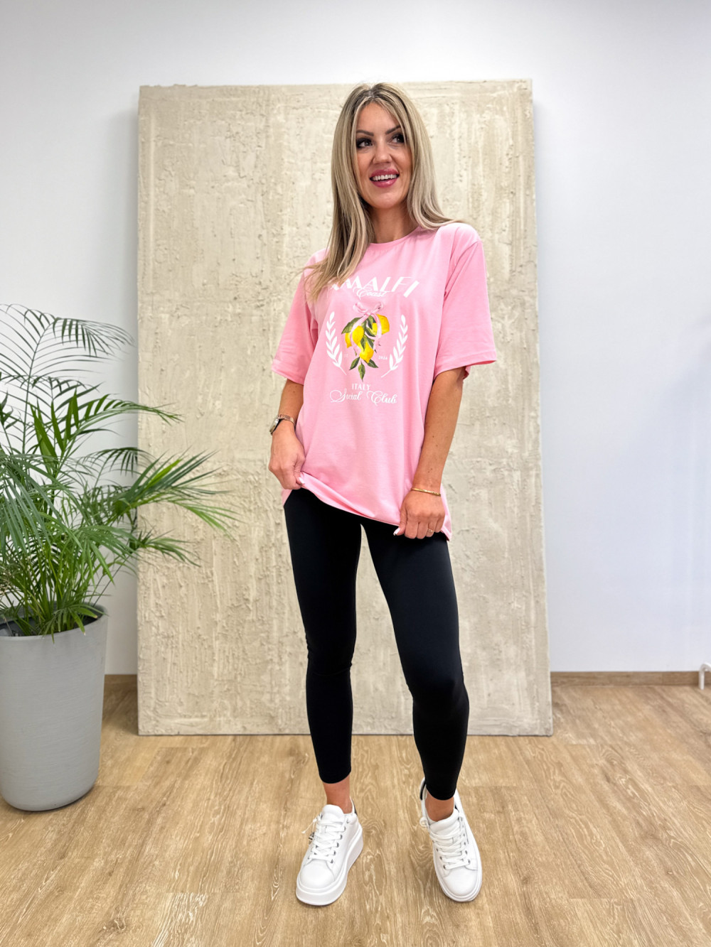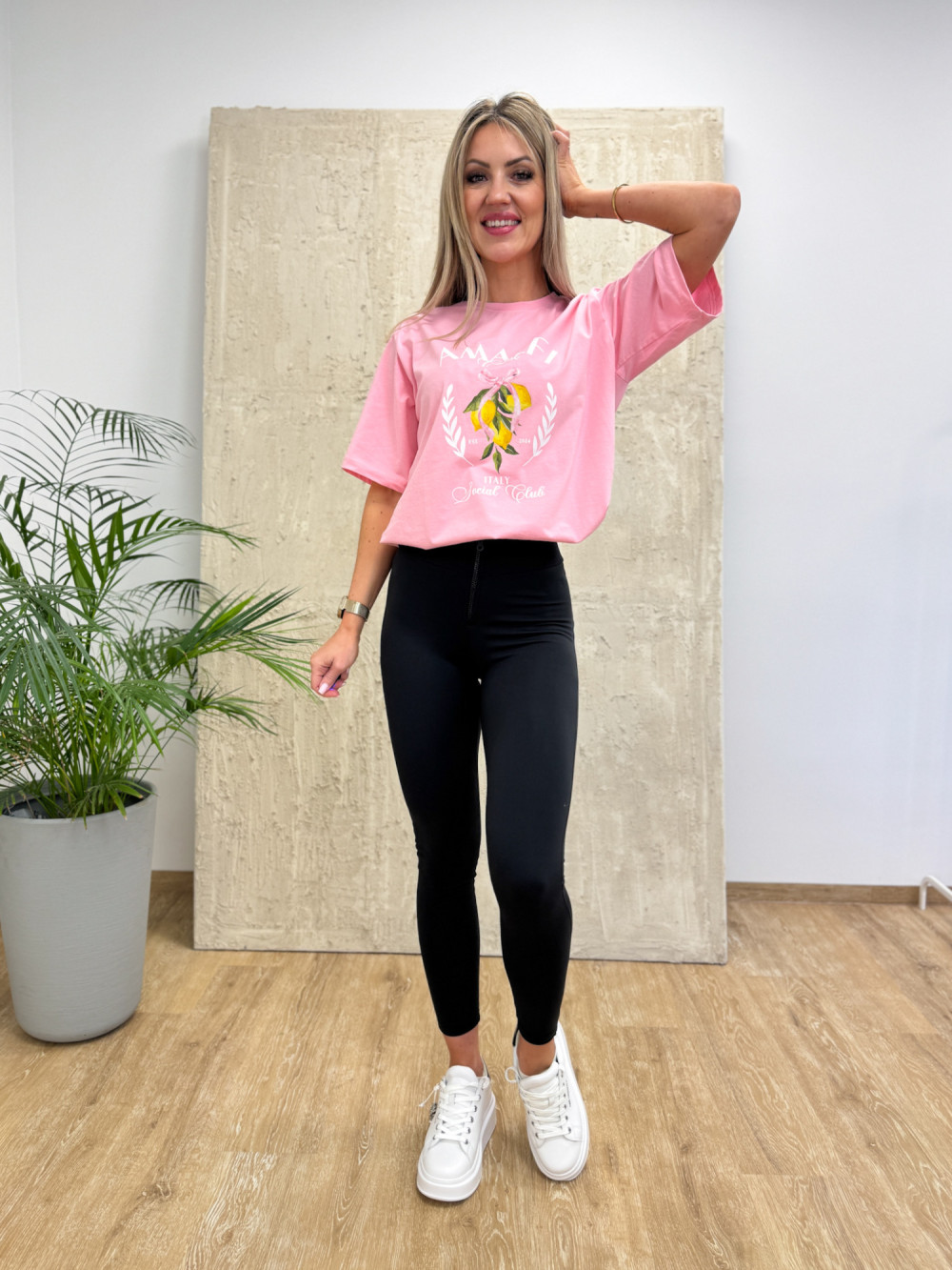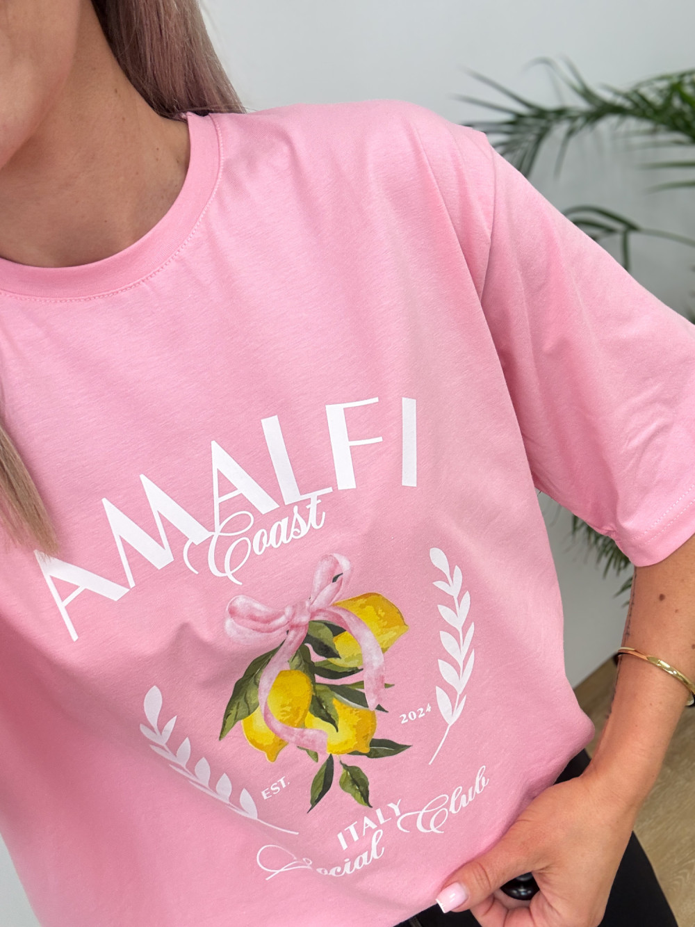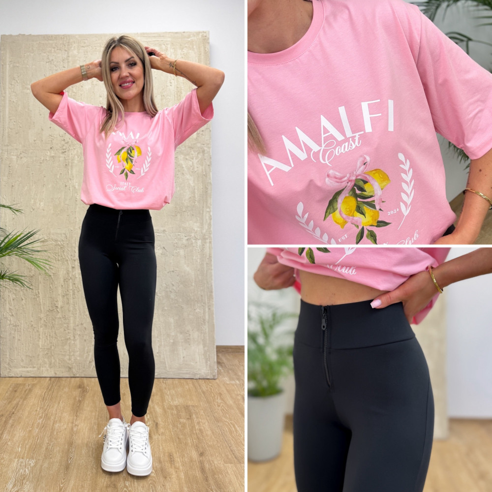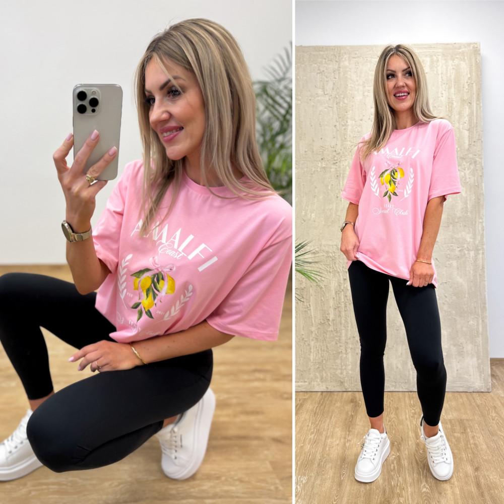 Model ozdobiony subtelnym nadrukiem cytryn i napisu Amalfi, nawiązując do włoskiego klimatu, który dodaje charakteru i podkreśla casualowy styl. T-shirt dostępny jest w dwóch kolorach, dzięki czemu łatwo dopasować go do swoich ulubionych zestawów.