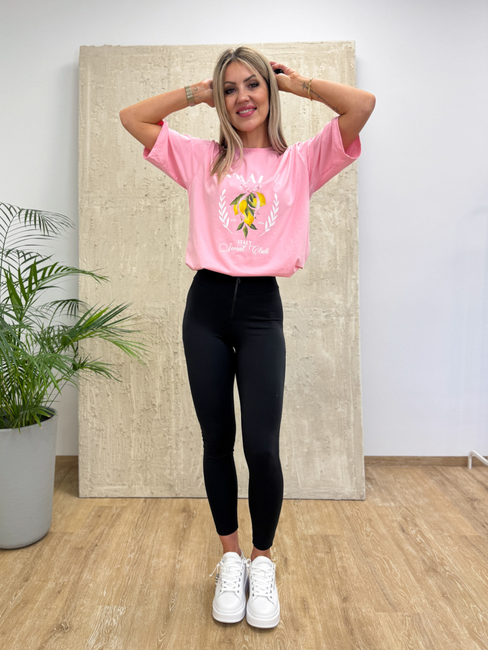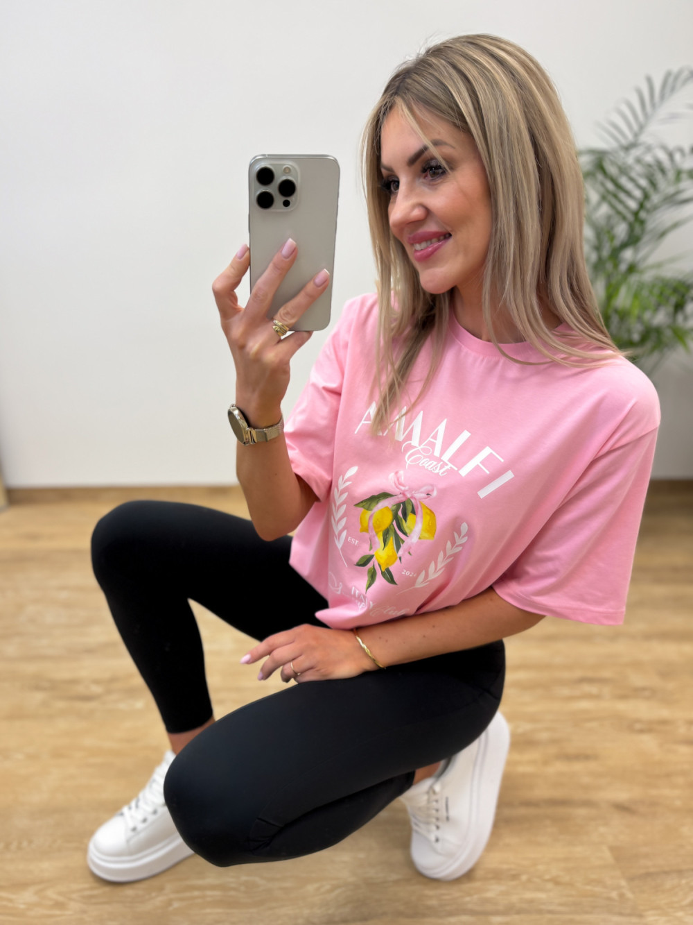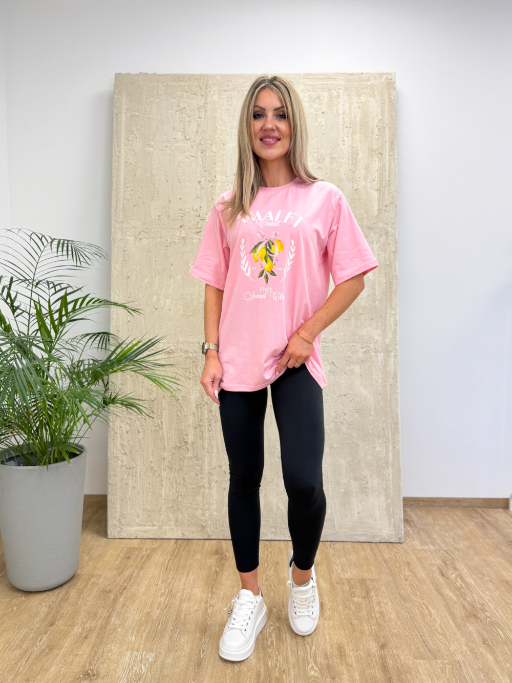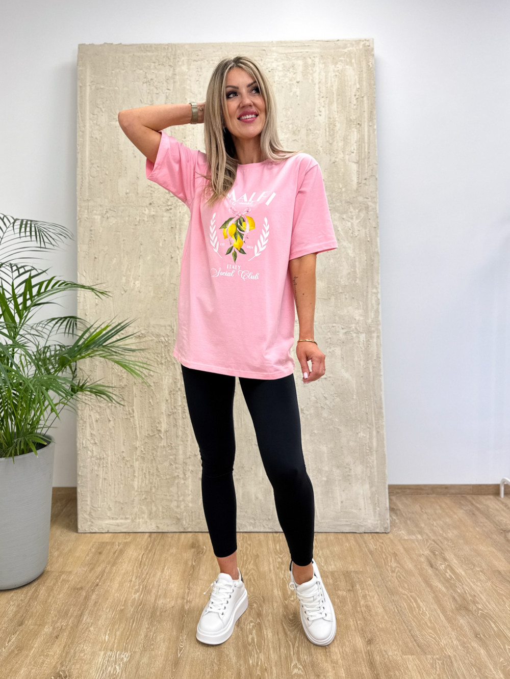 Model ozdobiony subtelnym nadrukiem cytryn i napisu Amalfi, nawiązując do włoskiego klimatu, który dodaje charakteru i podkreśla casualowy styl. T-shirt dostępny jest w dwóch kolorach, dzięki czemu łatwo dopasować go do swoich ulubionych zestawów.